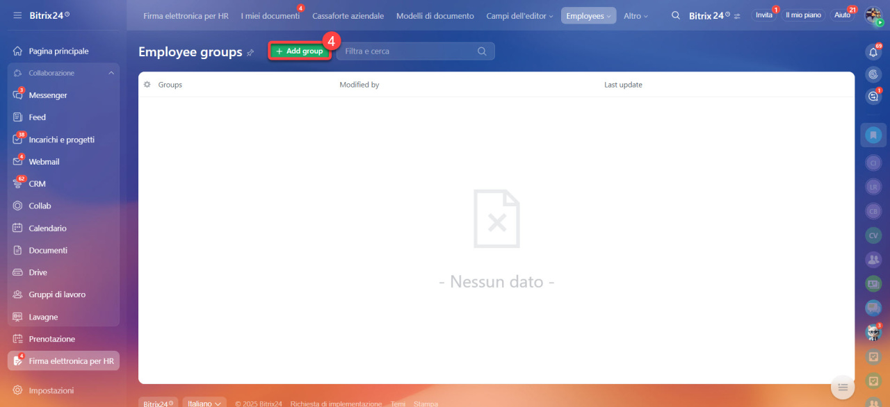 Per creare un gruppo, vai in Firma elettronica per HR > Altro > Dipendenti > Gruppi di dipendenti e fai clic su Crea gruppo.