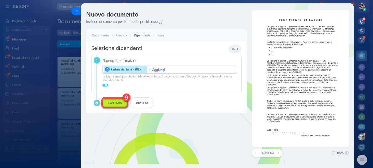 - Fai clic su Continua. Se il gruppo include dipendenti che hanno rifiutato di utilizzare la firma elettronica per HR, non riceveranno il documento.