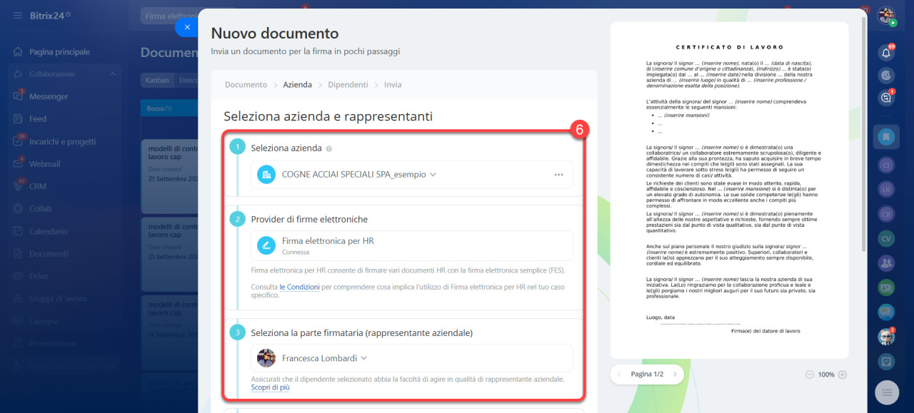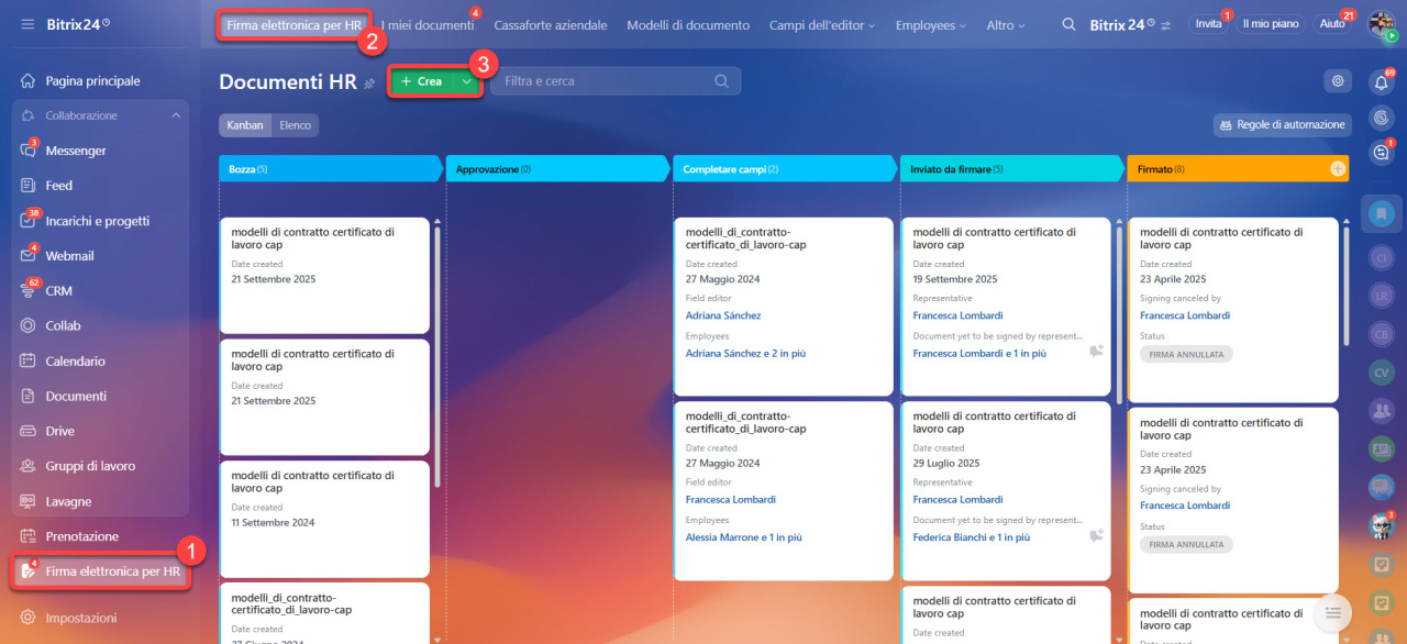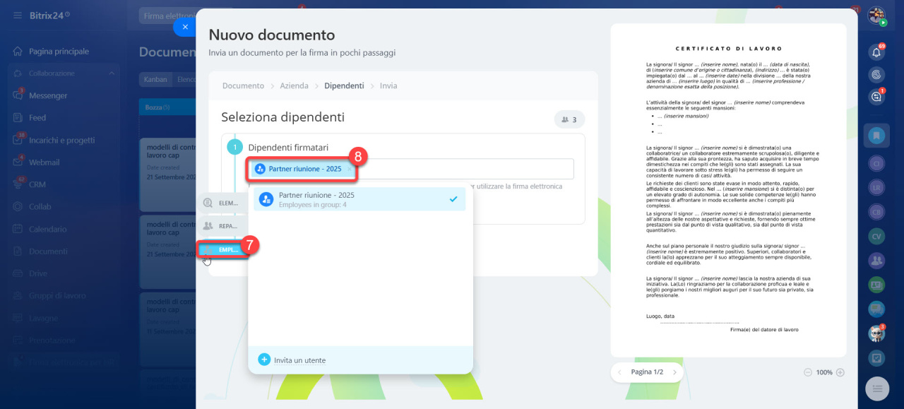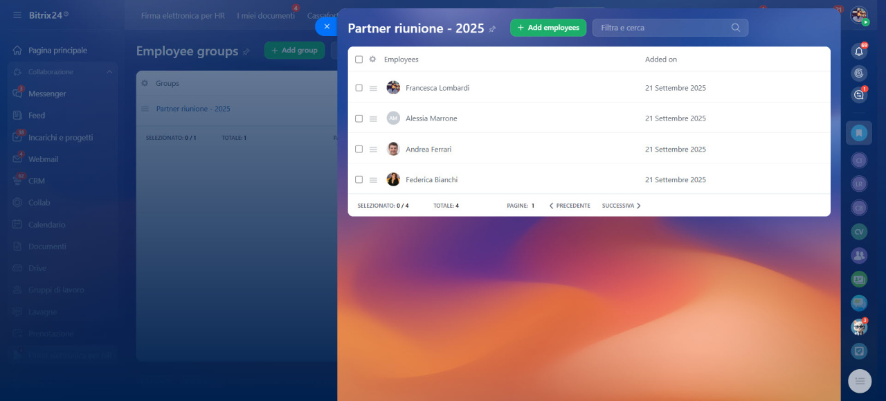 In Bitrix24 Firma elettronica per HR, puoi raggruppare i dipendenti per reparti, progetti o altri criteri. Questo rende più veloce l'invio dello stesso documento a più persone contemporaneamente.