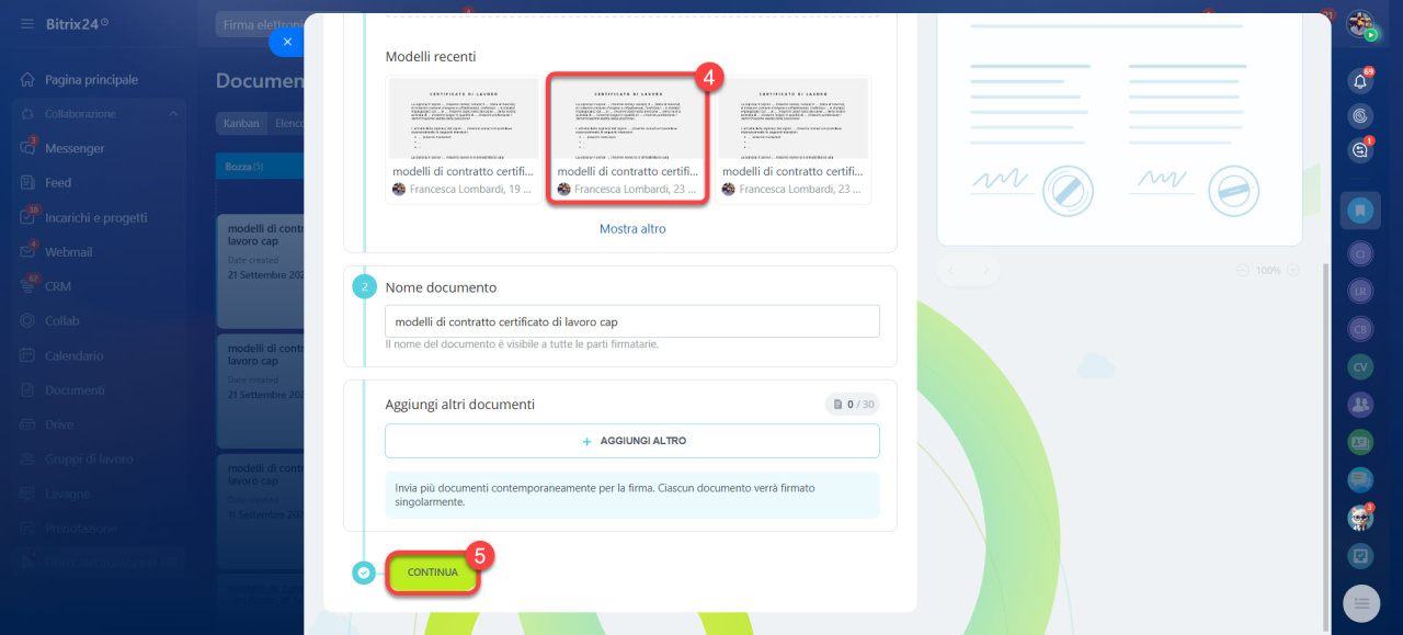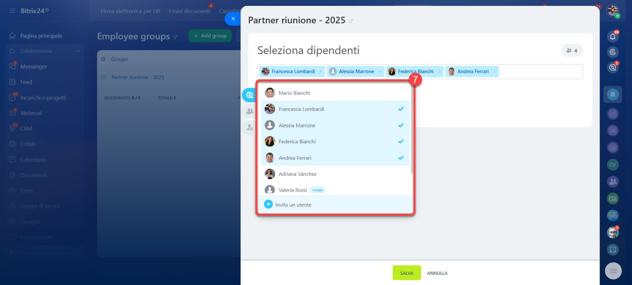 In Bitrix24 Firma elettronica per le risorse umane, puoi raggruppare i dipendenti per reparti, progetti o altri criteri. Questo rende più veloce l'invio dello stesso documento a più persone contemporaneamente.