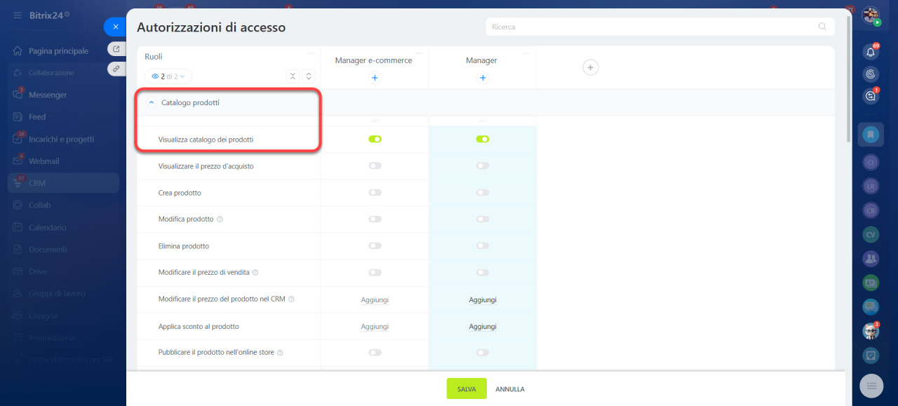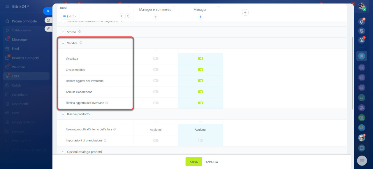 Vai nella sezione CRM > Impostazioni > Autorizzazioni di accesso all'inventario.