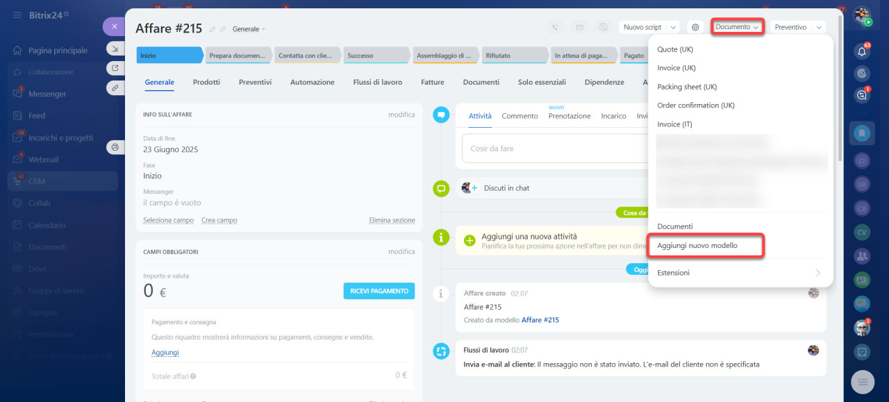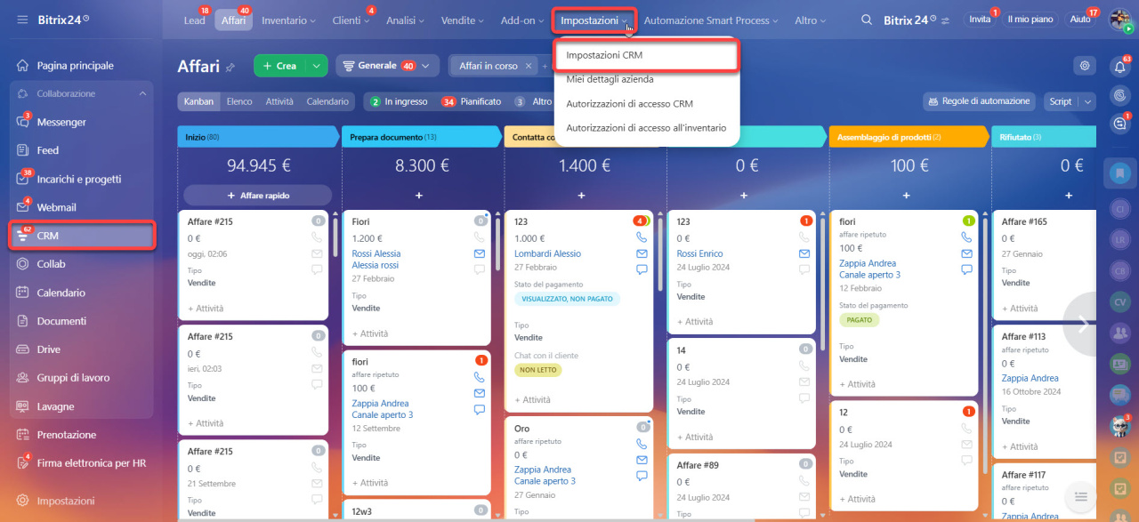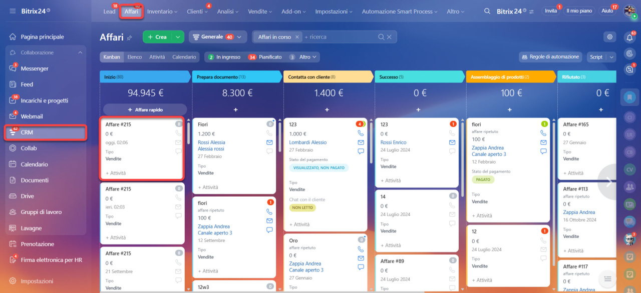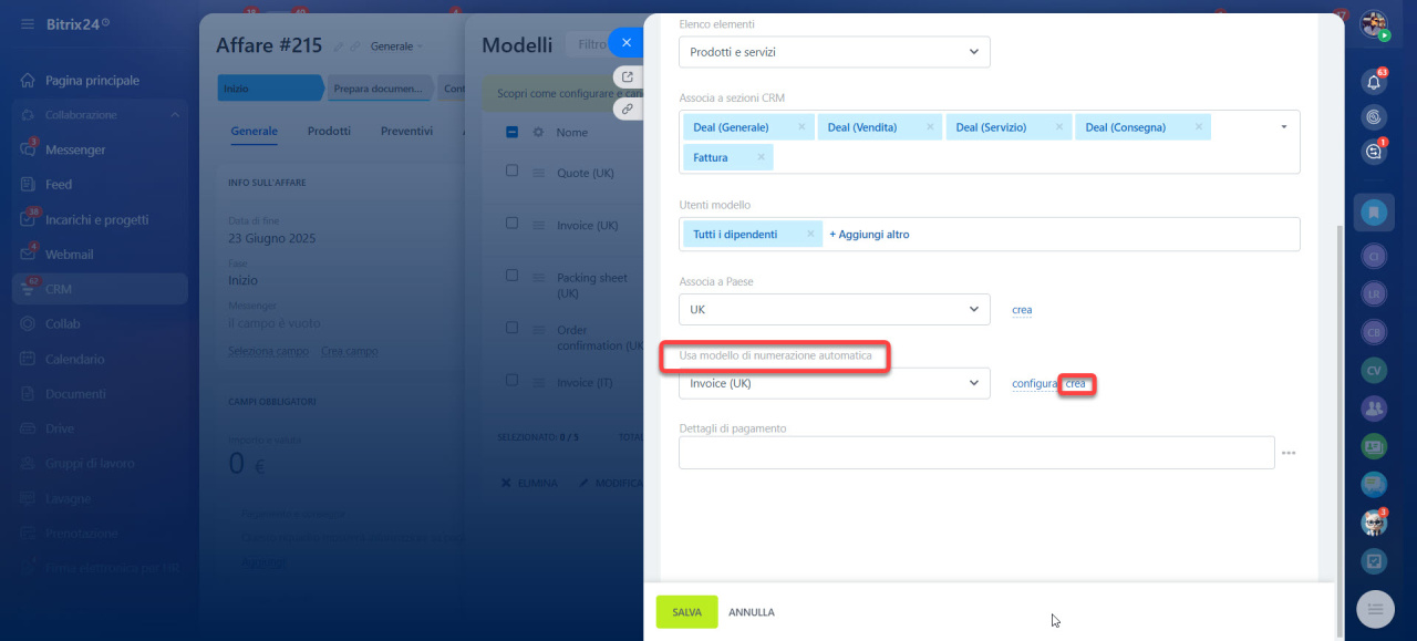 - Vai nella sezione CRM > scheda Affari e apri qualsiasi modulo di affare.