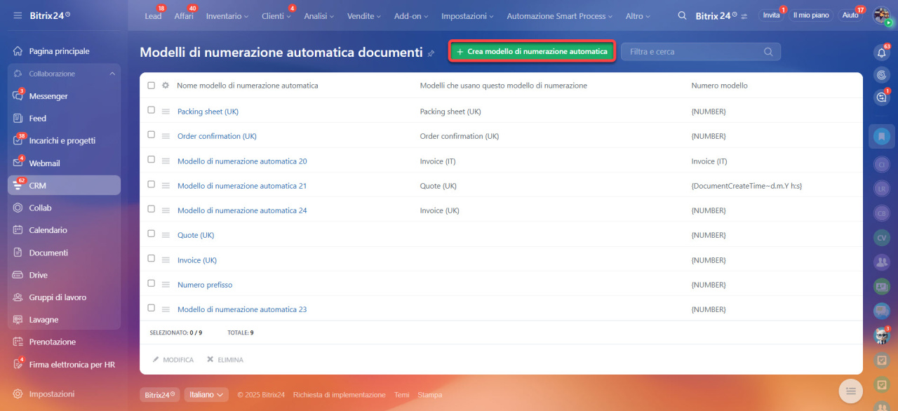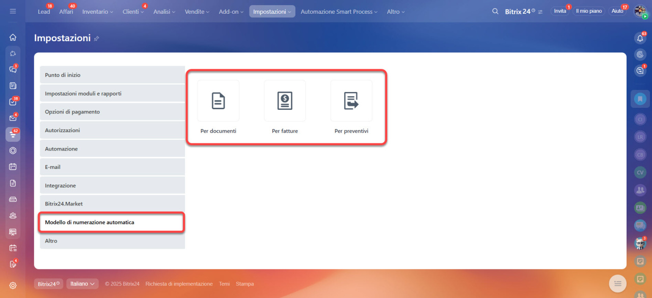 In Bitrix24, puoi configurare una numerazione separata per documenti, fatture e preventivi. Per lead e affari viene utilizzata una numerazione standard che non può essere modificata.