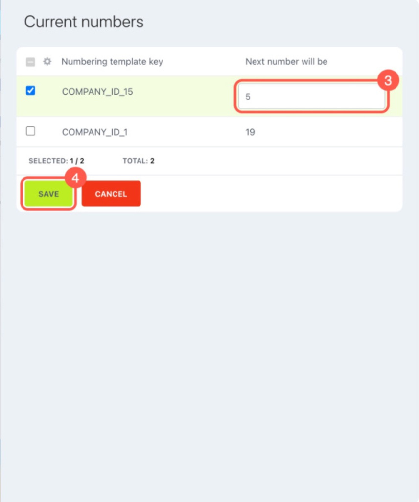 Per i modelli utilizzati in più aziende, apri un modello in modalità modifica e fai clic su Modifica numero corrente.