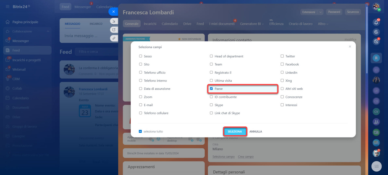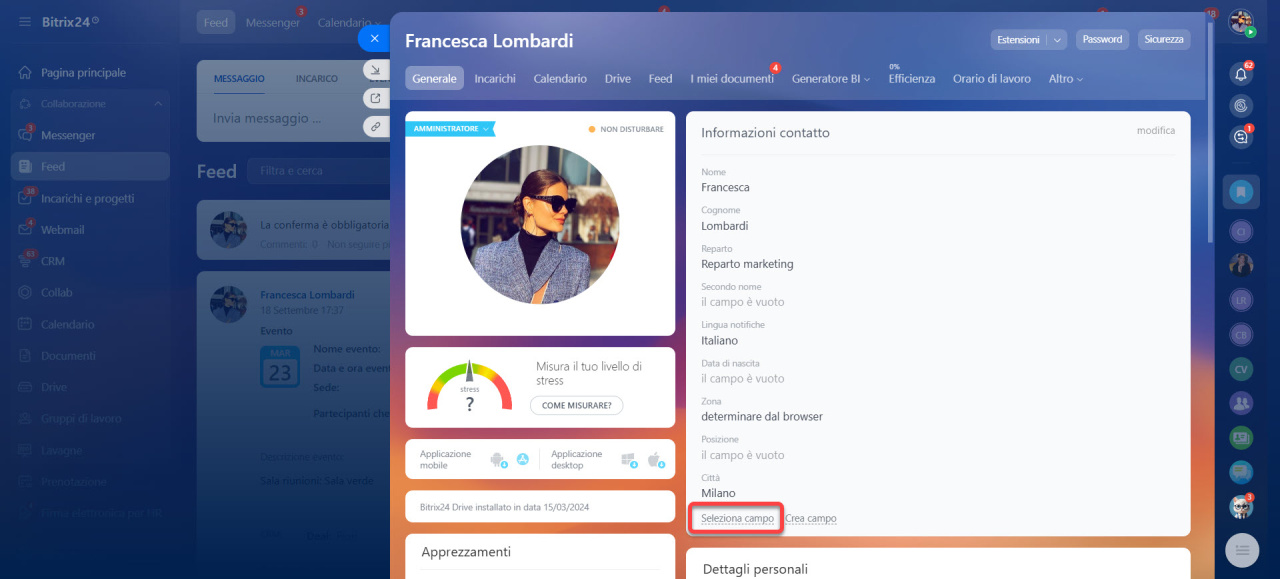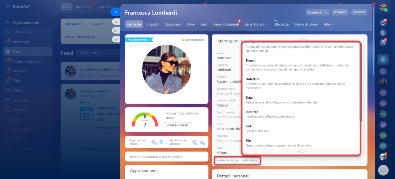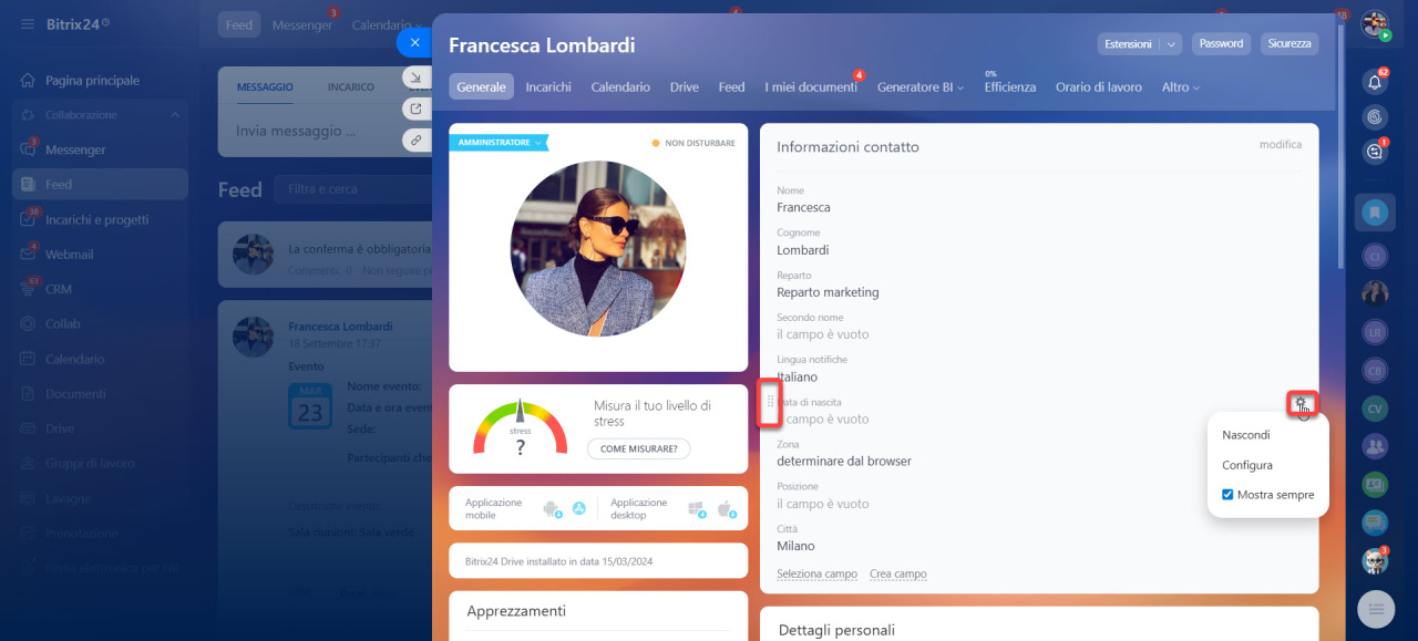 Layout standard. Gli amministratori di Bitrix24 possono impostare un layout standard in modo che tutti i profili dei dipendenti abbiano lo stesso aspetto. Ad esempio, puoi aggiungere campi come Cliente chiave e Orario di lavoro. Queste informazioni sono visibili per tutti i dipendenti e aiutano a capire chi è responsabile di cosa.