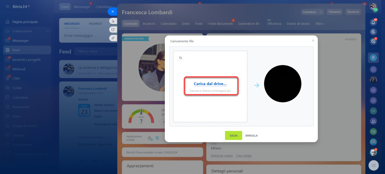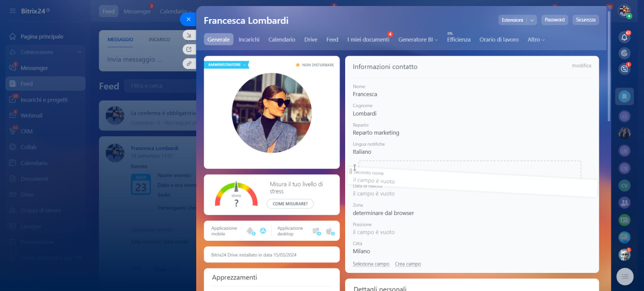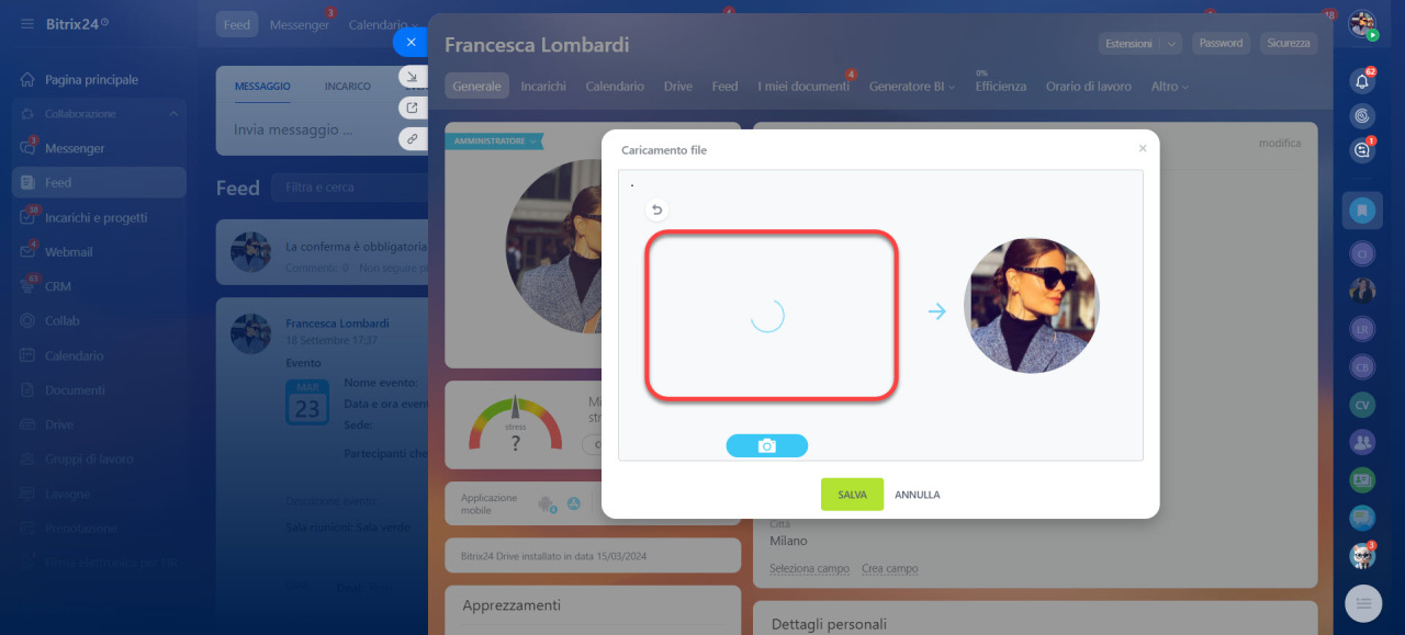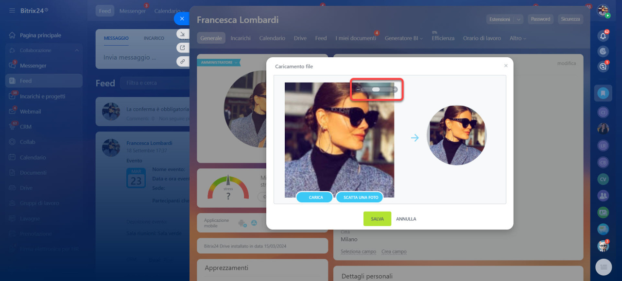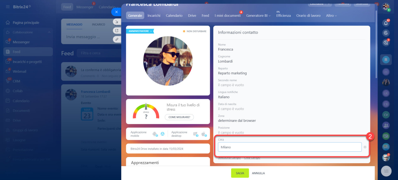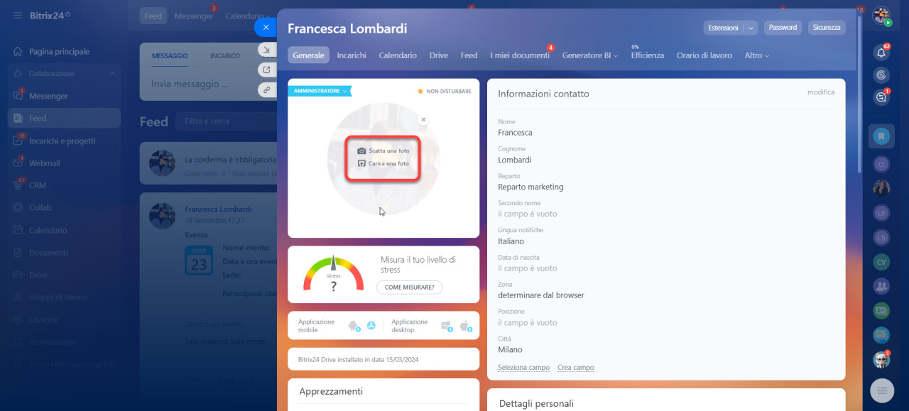 Sia i dipendenti che gli amministratori di Bitrix24 possono modificare le informazioni nei profili personali.