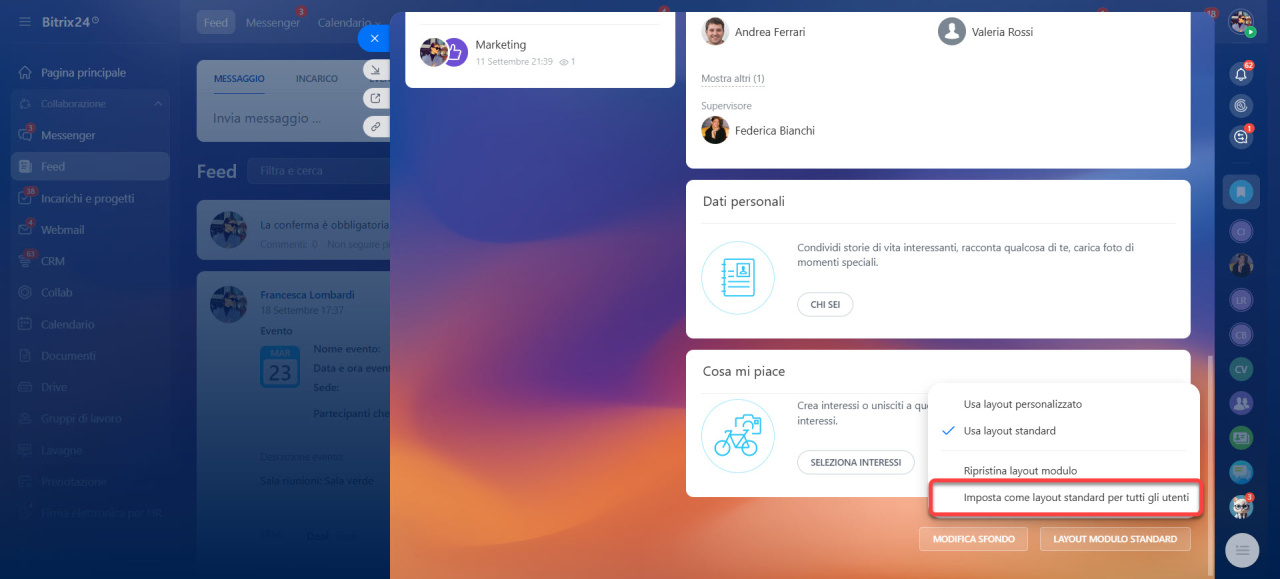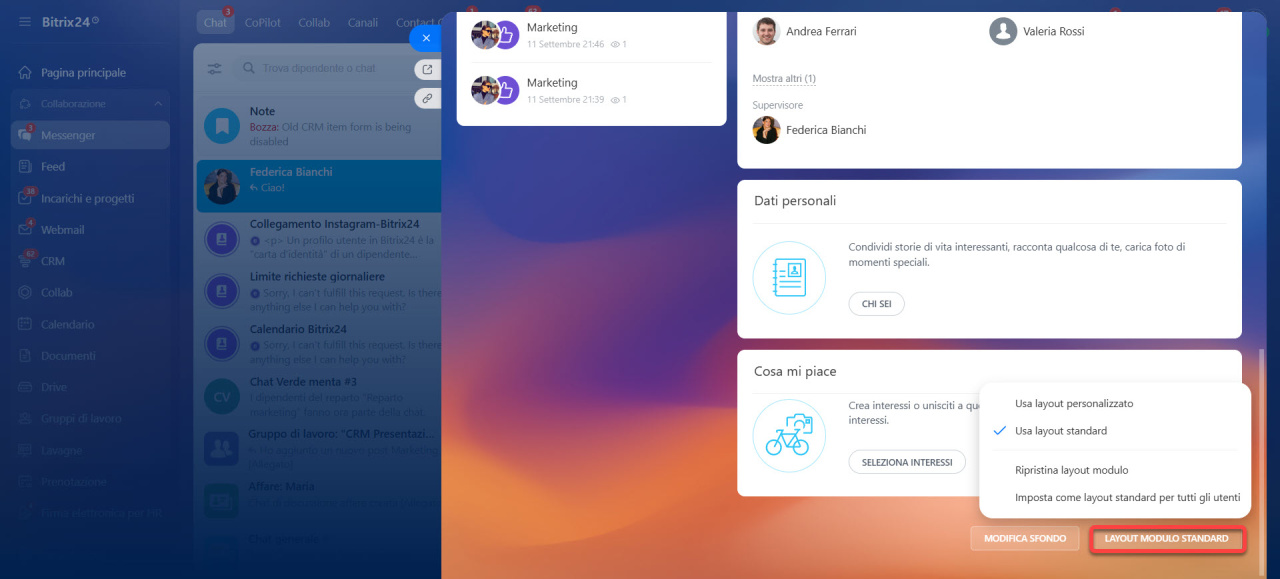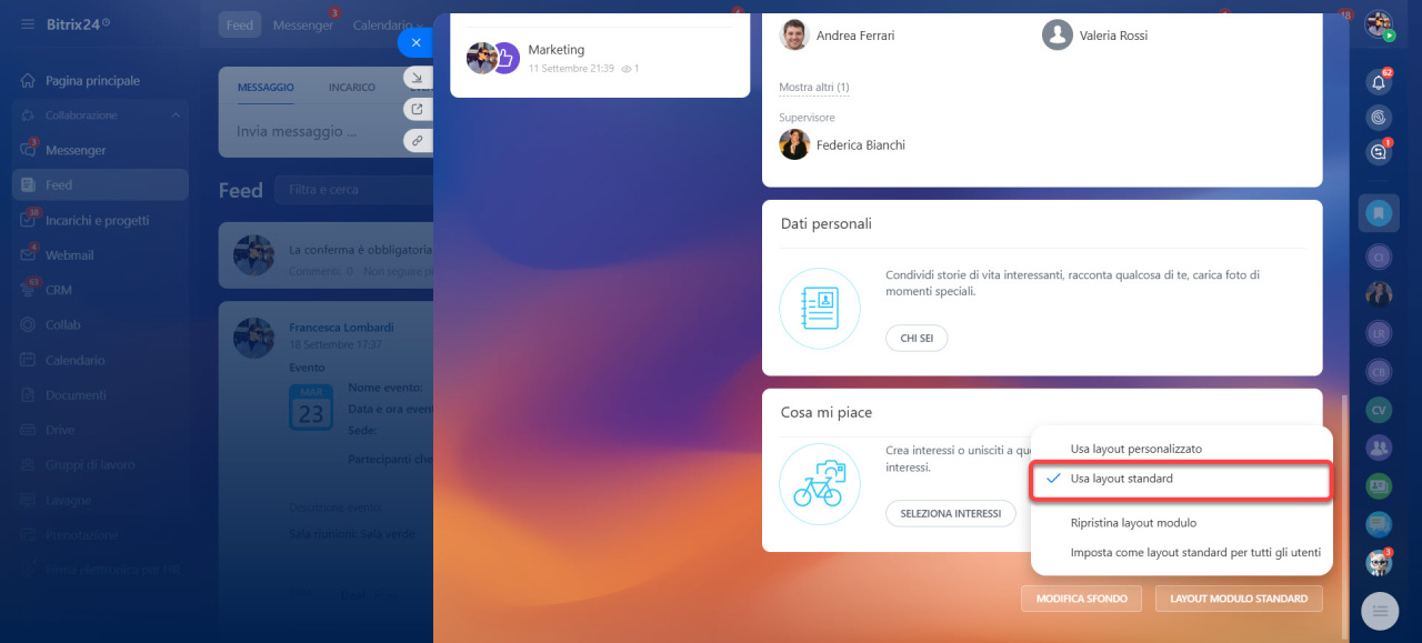 Bitrix24 offre due layout per il profilo: Layout personalizzato e Layout standard.