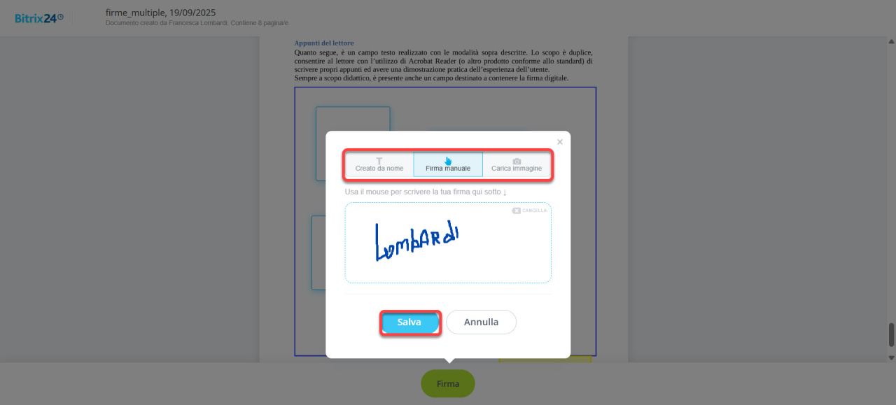 - Firma manualmente: Traccia la tua firma con il mouse.