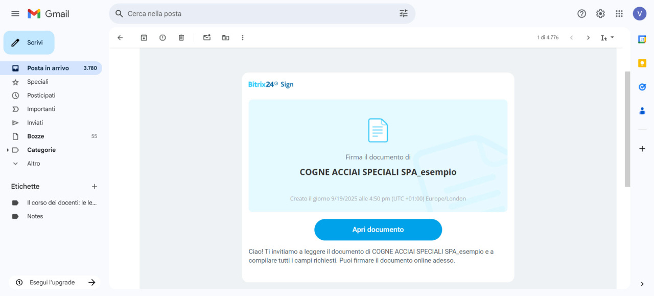 Firma un documento con Bitrix24 Firma elettronica - Successivamente, il cliente riceve il documento per la firma.