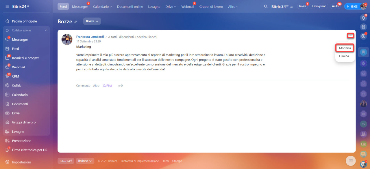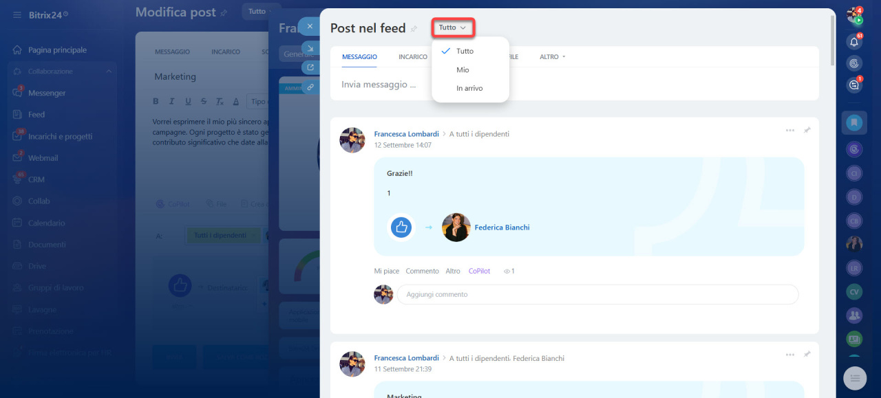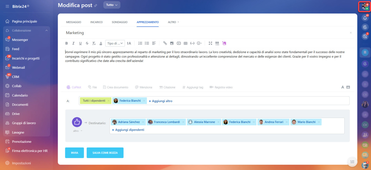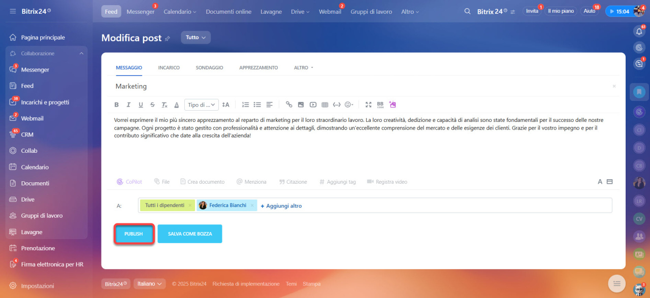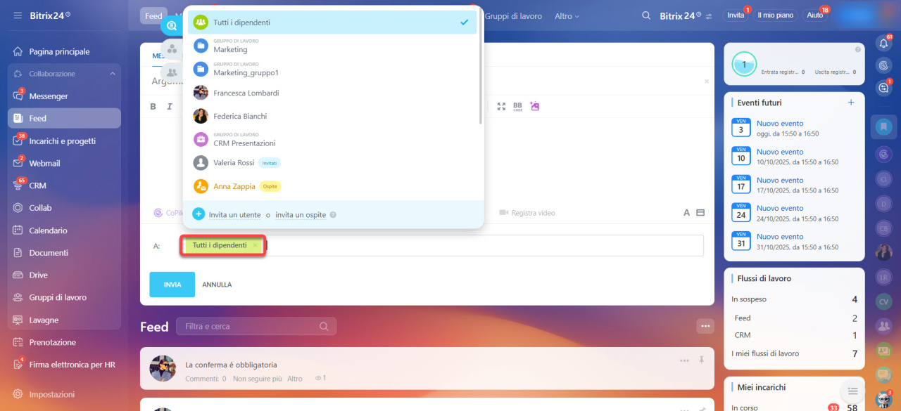 Nel Feed di Bitrix24, puoi inviare messaggi a tutti i dipendenti contemporaneamente senza dover selezionare manualmente ogni utente. Seleziona l'opzione "Tutti i dipendenti".
