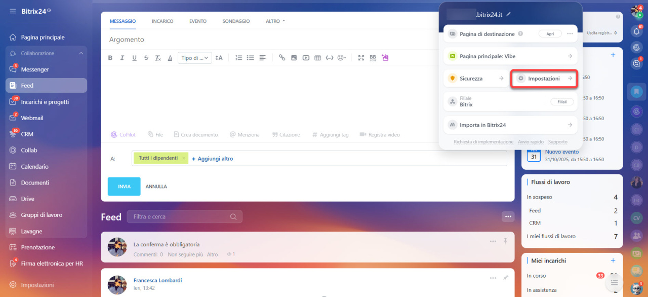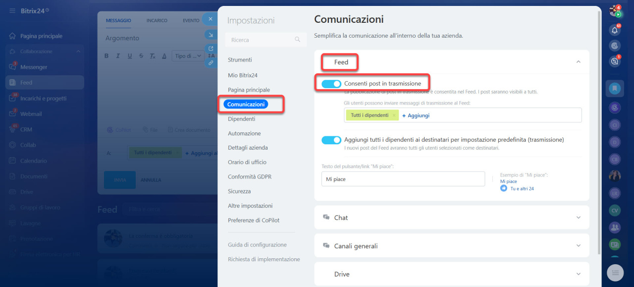 - Vai su Impostazioni > Impostazioni Bitrix24 > Comunicazioni.