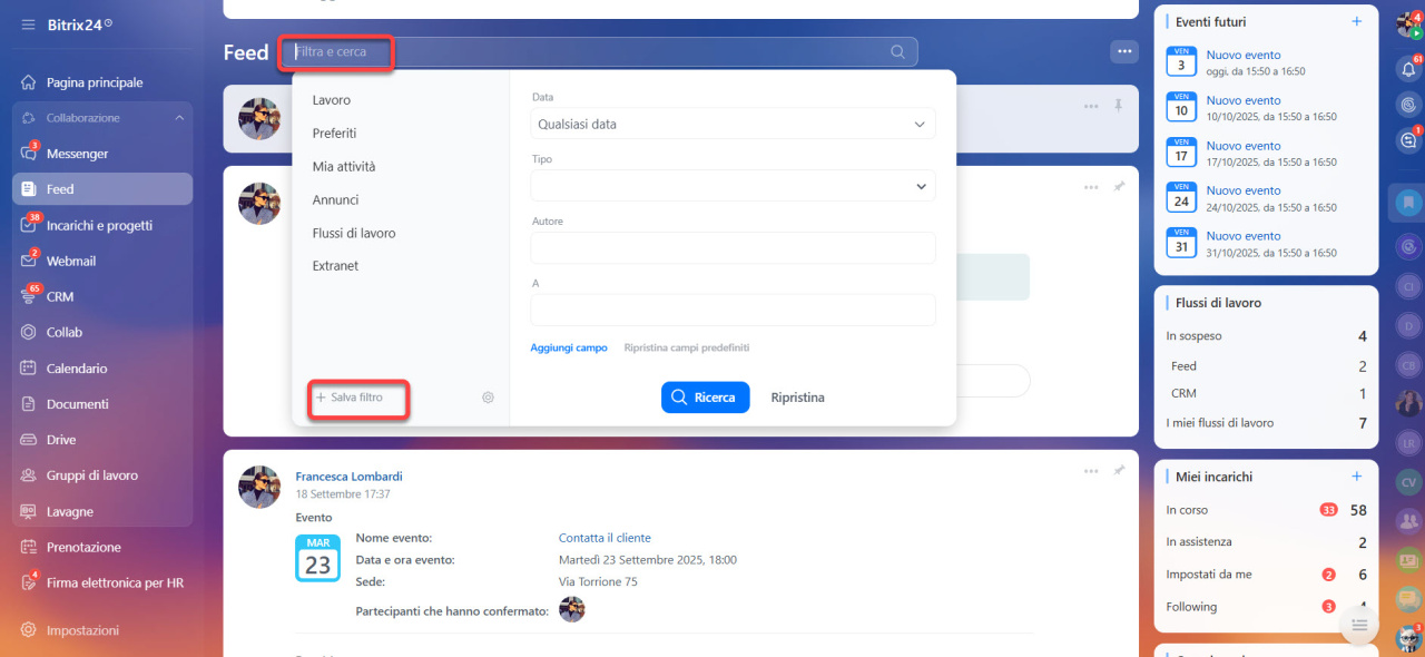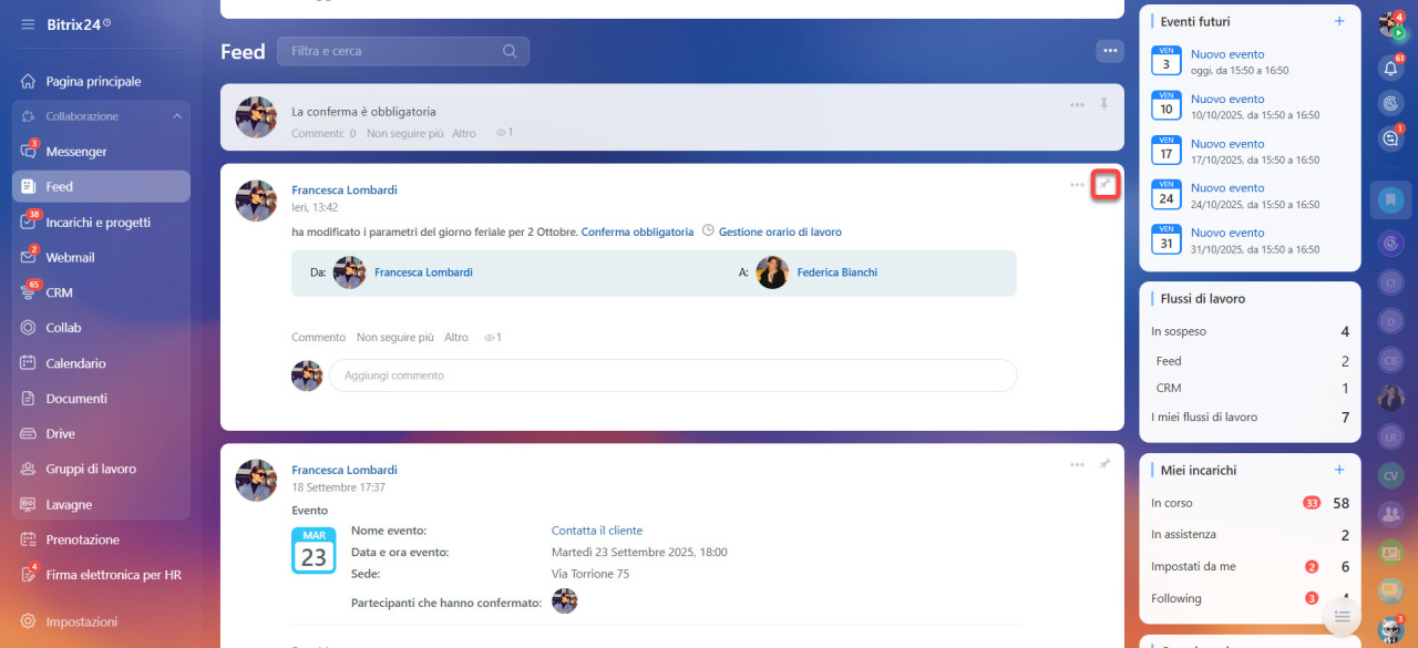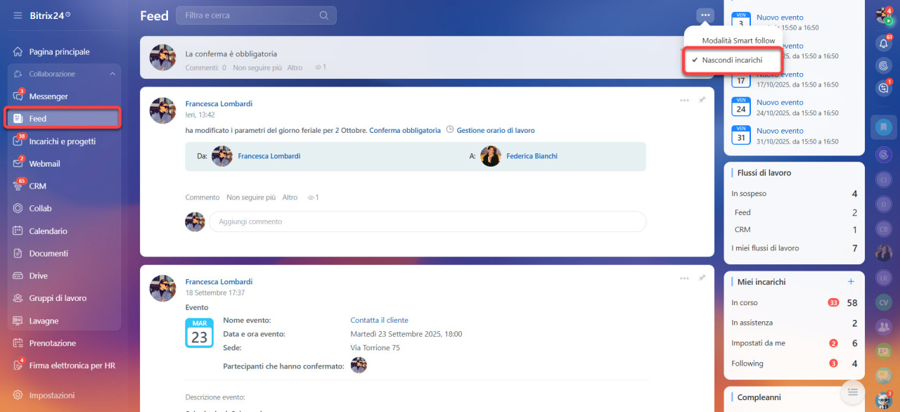 Attiva la modalità esperto per impedire che i commenti delle attività appaiano nel Feed. Dopo questa modifica, rimarranno solo i post e le notifiche relative ai flussi di lavoro e agli eventi. Puoi gestire le attività nella sezione Attività e Progetti.
