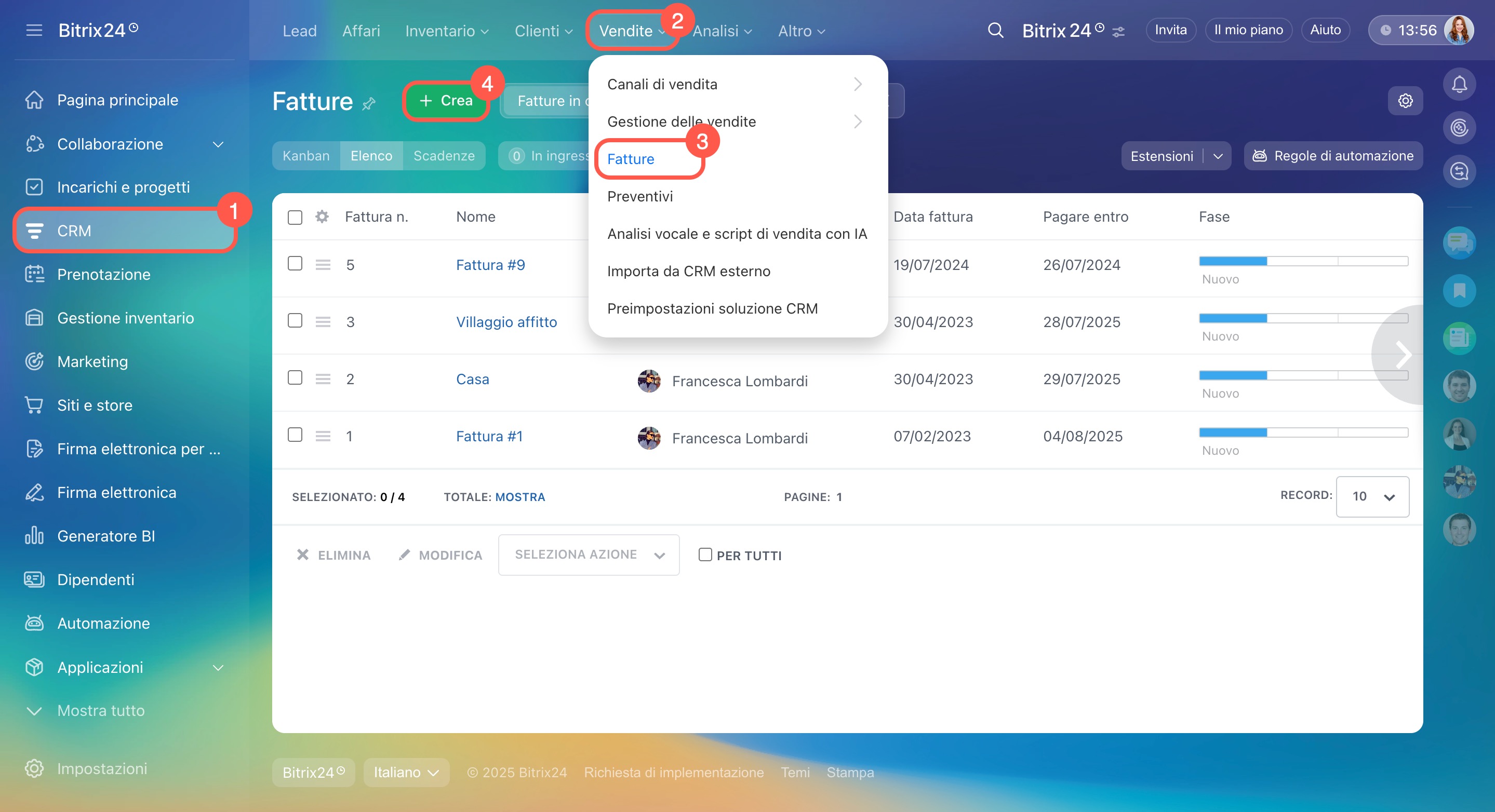 - Regolarmente: il CRM creerà automaticamente le fatture secondo un programma, ad esempio settimanale o mensile.