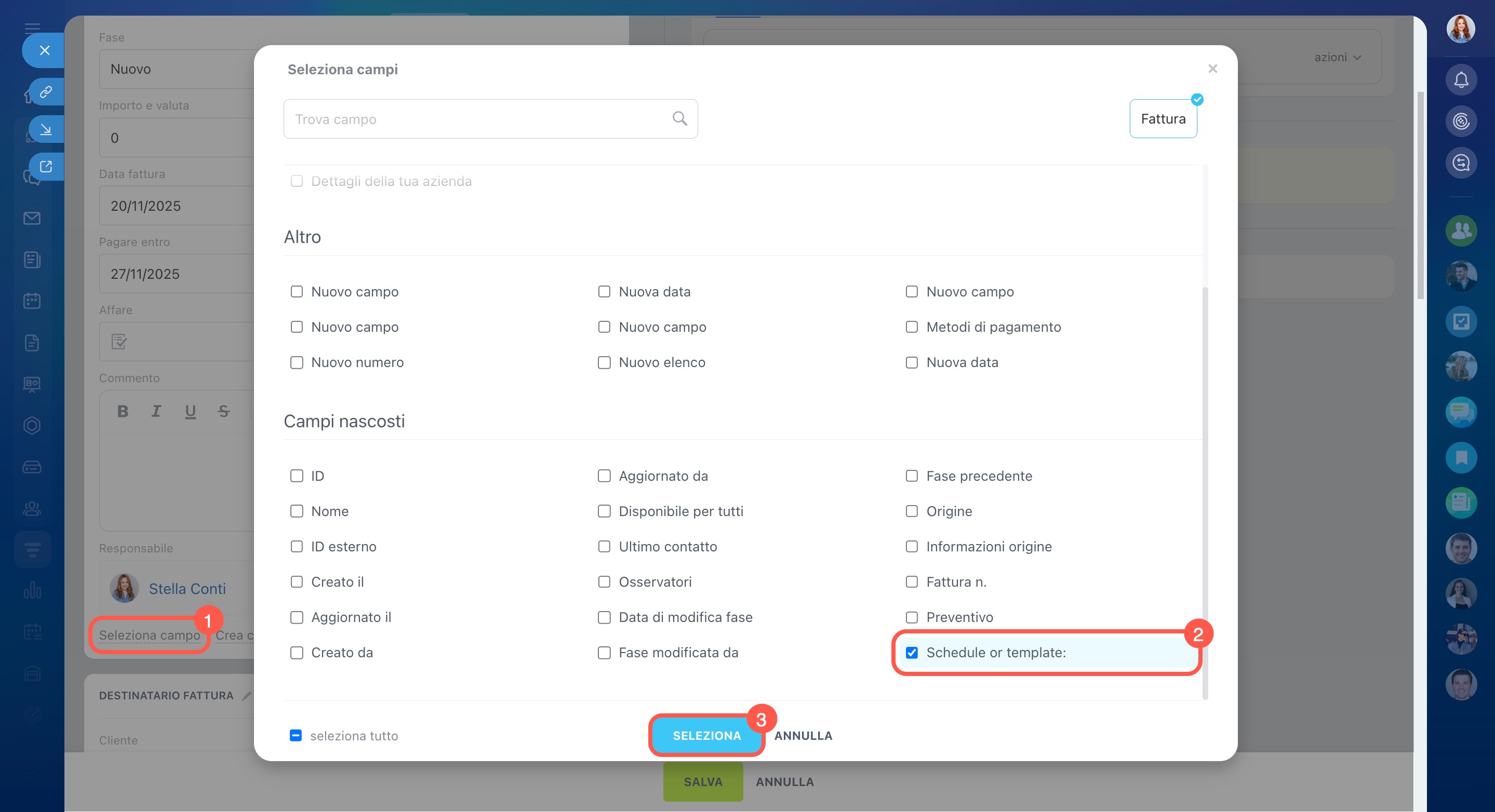 Le fatture ricorrenti ti aiutano a tenere traccia dei pagamenti regolari dei clienti, come affitti, servizi o abbonamenti. Il CRM crea e invia automaticamente queste fatture in base al programma che imposti. I clienti ricevono promemoria di pagamento puntuali e tu risparmi tempo sulle attività di routine.