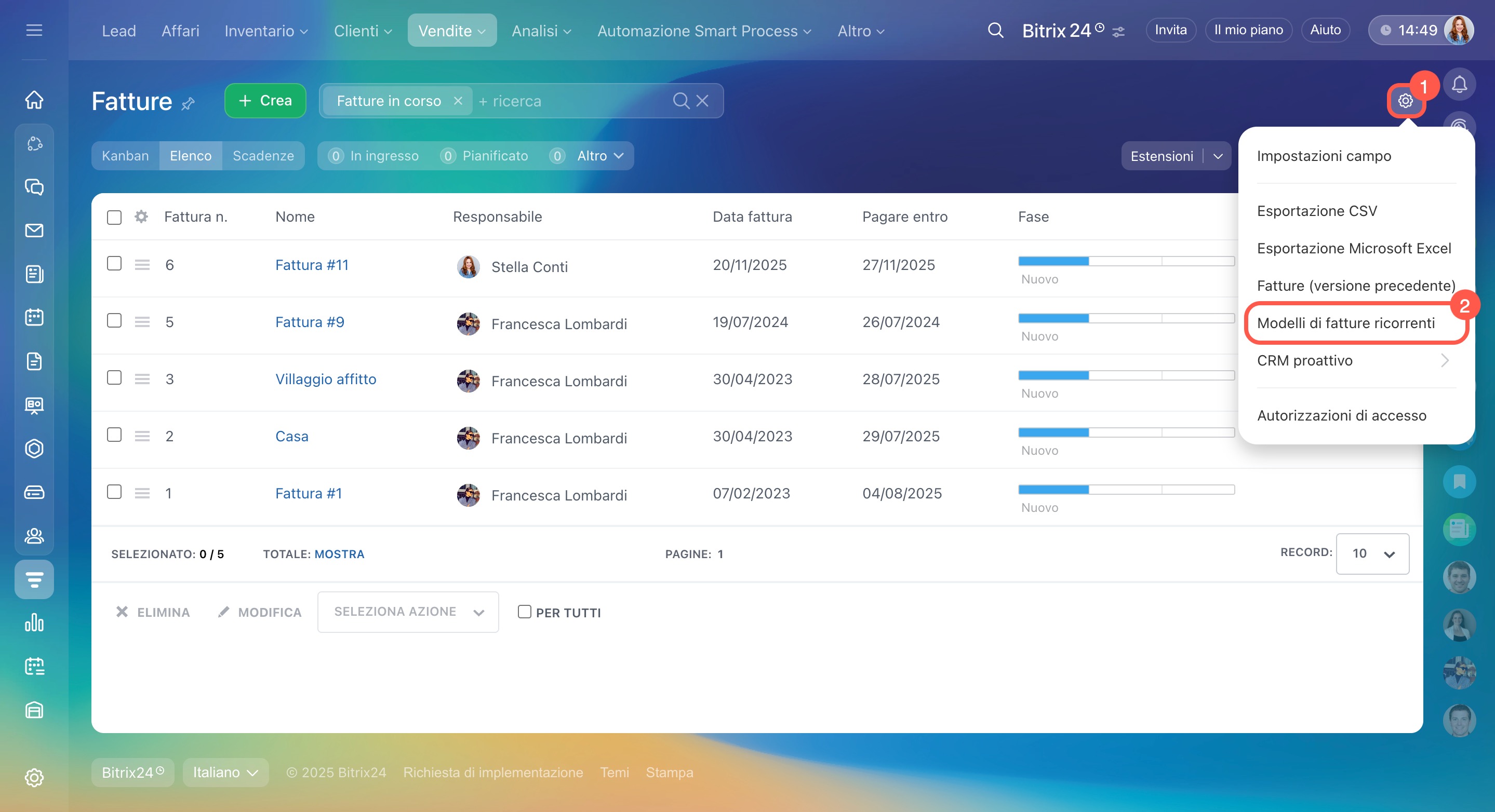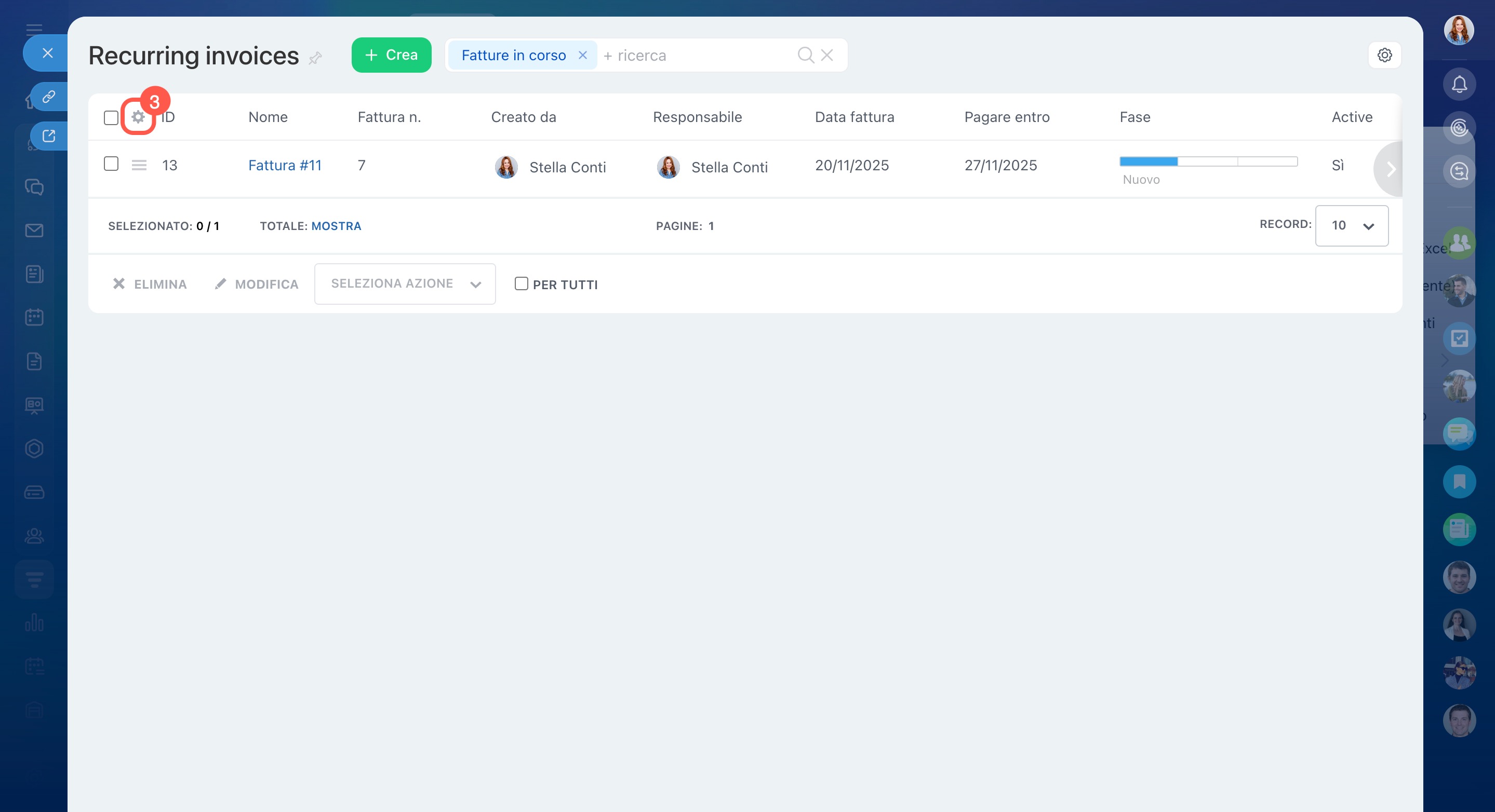 Dopo aver creato una fattura ricorrente, il CRM la memorizza come modello. Tutti questi modelli sono raccolti in un elenco separato, dove puoi vedere quali fatture sono configurate, chi ne è responsabile e quando vengono creati nuovi documenti.