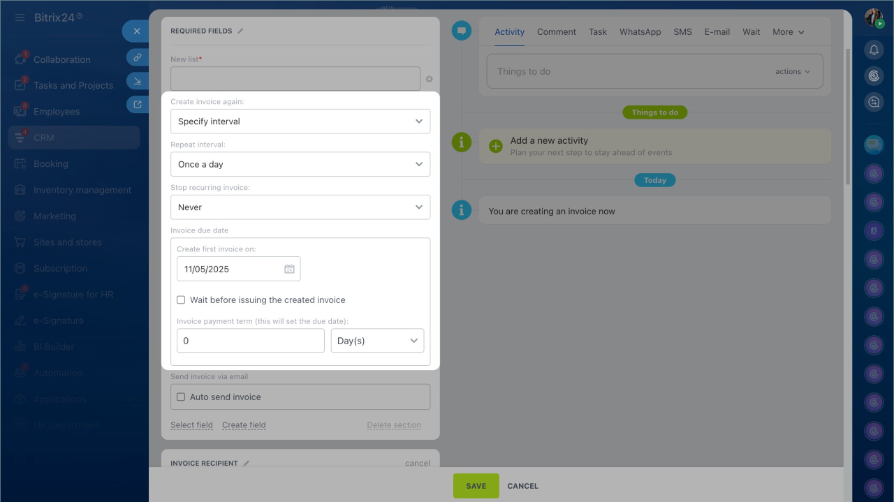 - Solo un amministratore di Bitrix24 o un dipendente con permessi per modificare e aggiungere fatture può configurare le fatture ricorrenti.