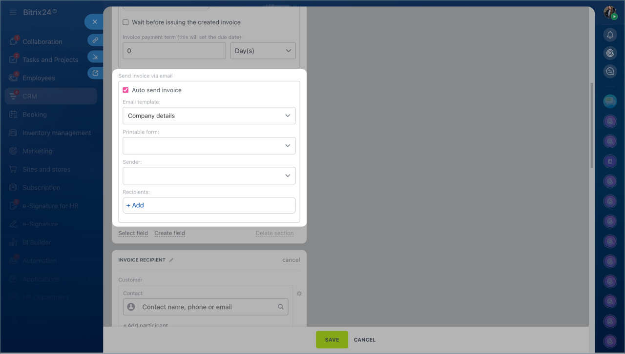 Destinatari: seleziona l'indirizzo email a cui inviare la fattura. Se il contatto selezionato nella fattura non ha un'email, l'elenco sarà vuoto. Puoi aggiungere un indirizzo oppure selezionare un altro contatto dal CRM facendo clic su Aggiungi destinatario. Una volta selezionato, il destinatario apparirà automaticamente nel campo Cliente nel modulo fattura.