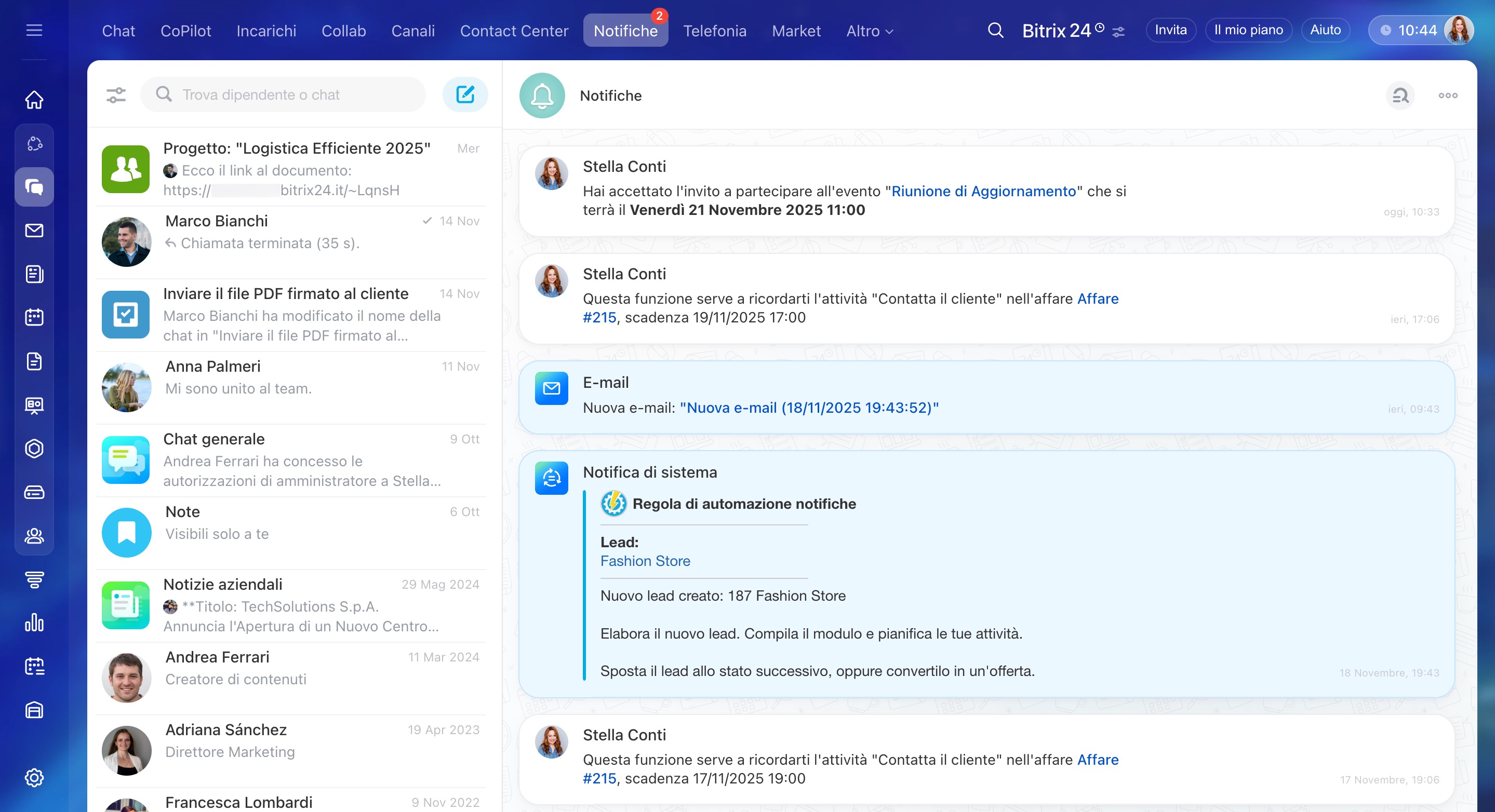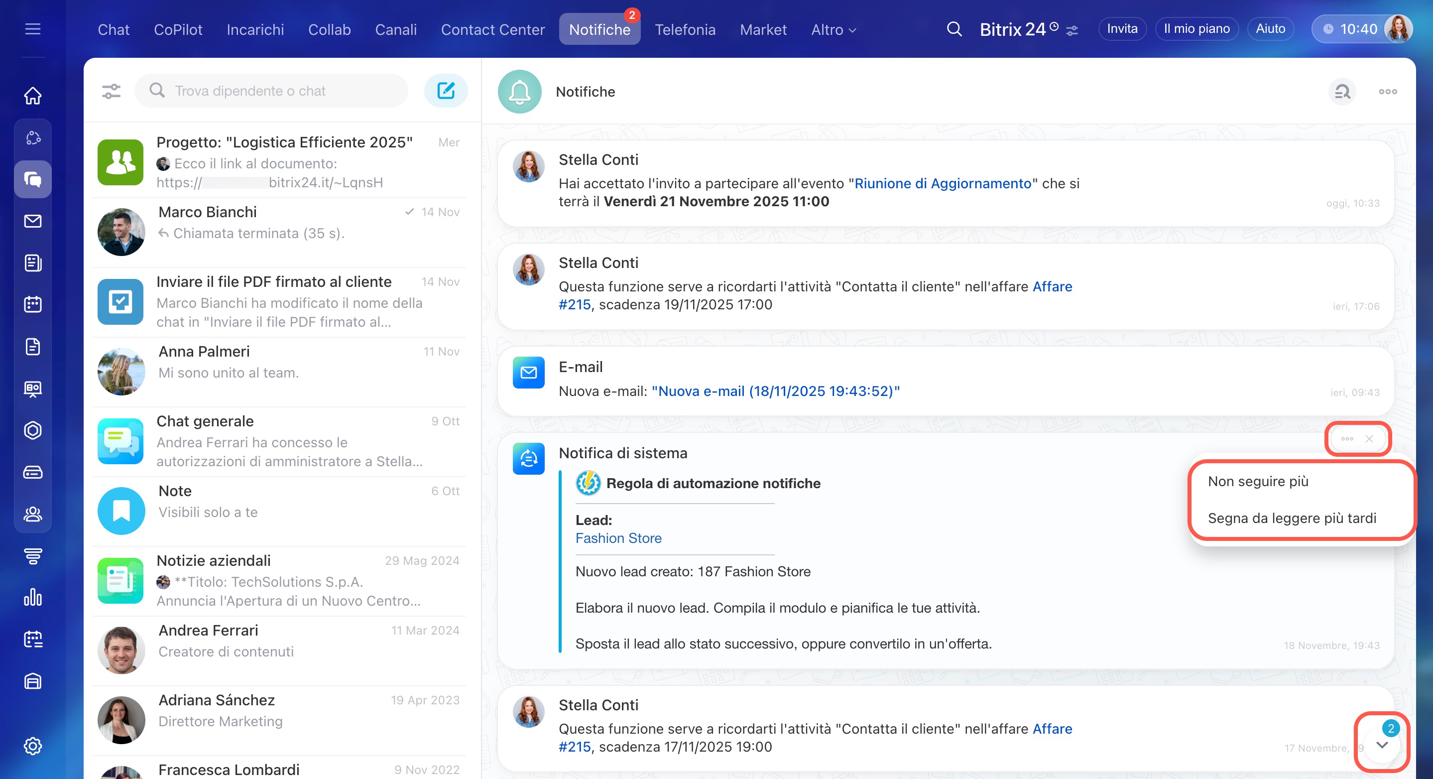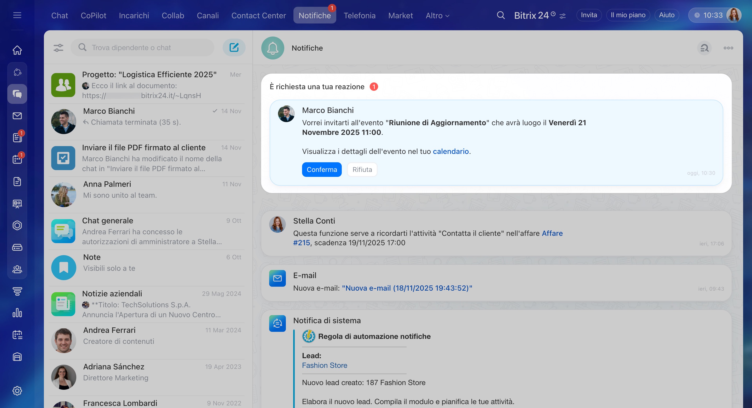 Le notifiche in Bitrix24 ti aiutano a rimanere aggiornato sugli eventi importanti, come nuovi incarichi, commenti, riunioni o aggiornamenti CRM. Ora le notifiche sono più facili da gestire: l'interfaccia e la struttura sono state aggiornate, e puoi annullare rapidamente l'iscrizione a quelle non necessarie.