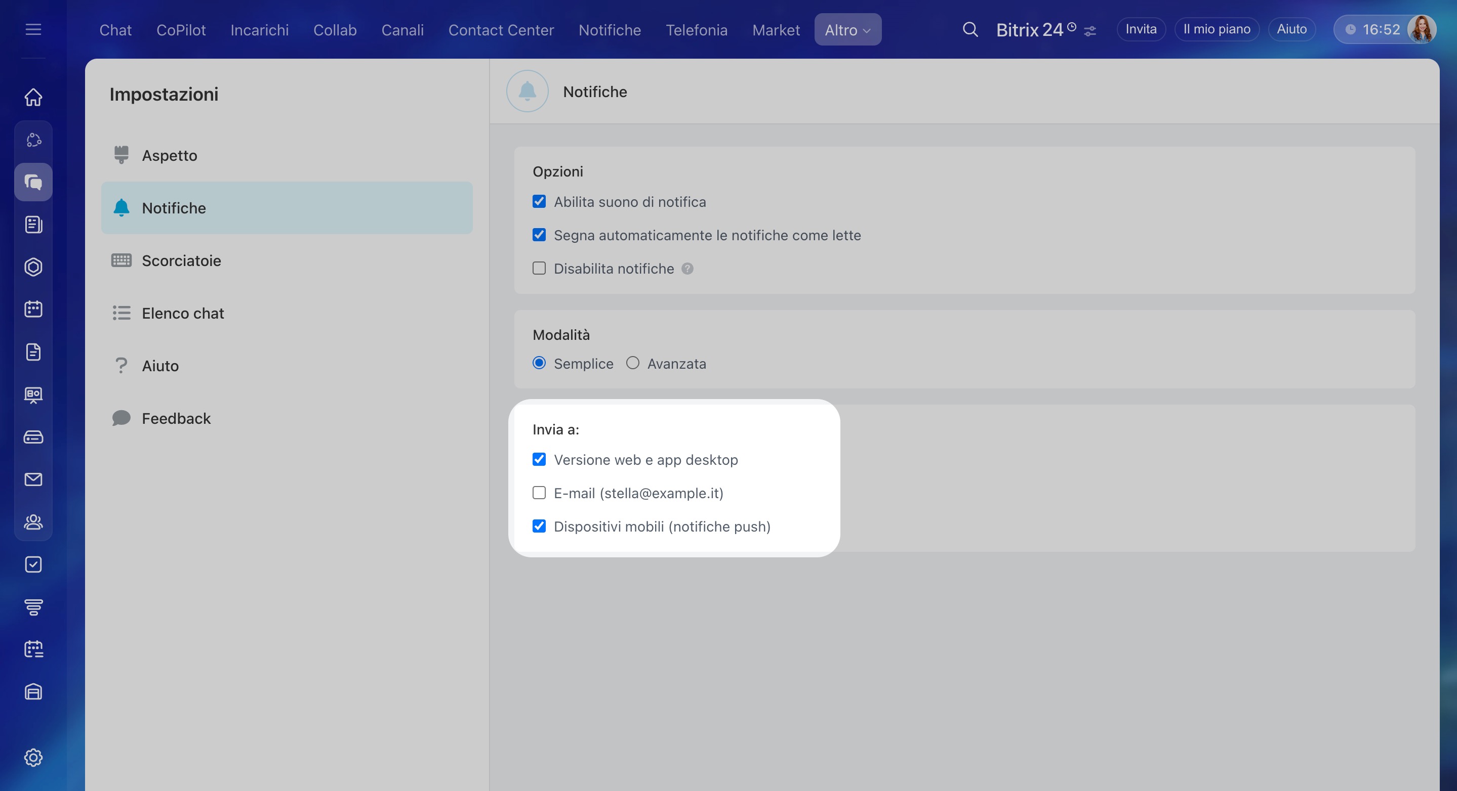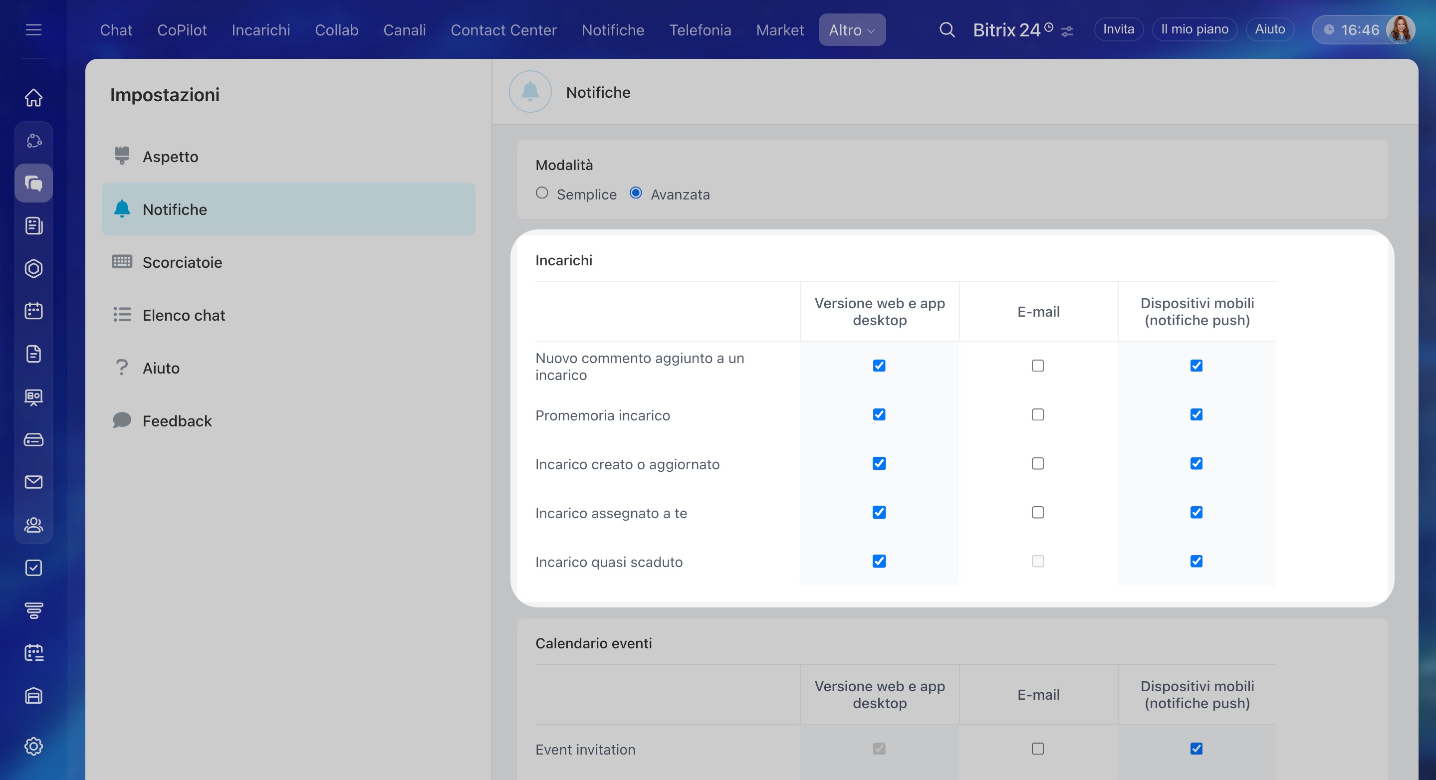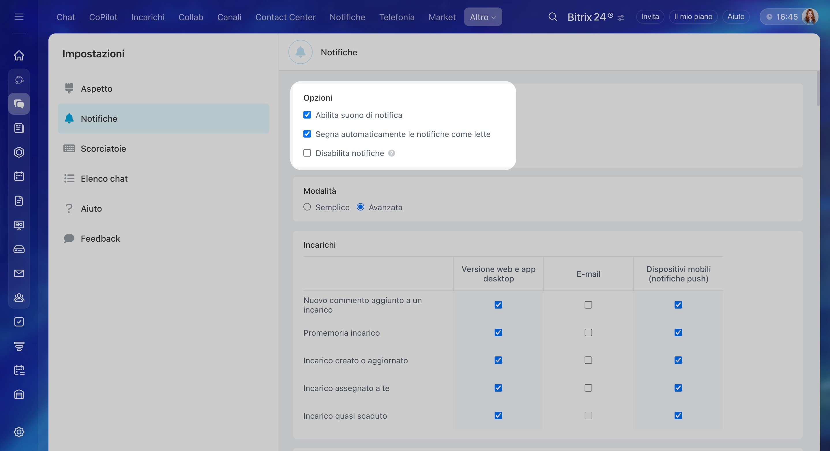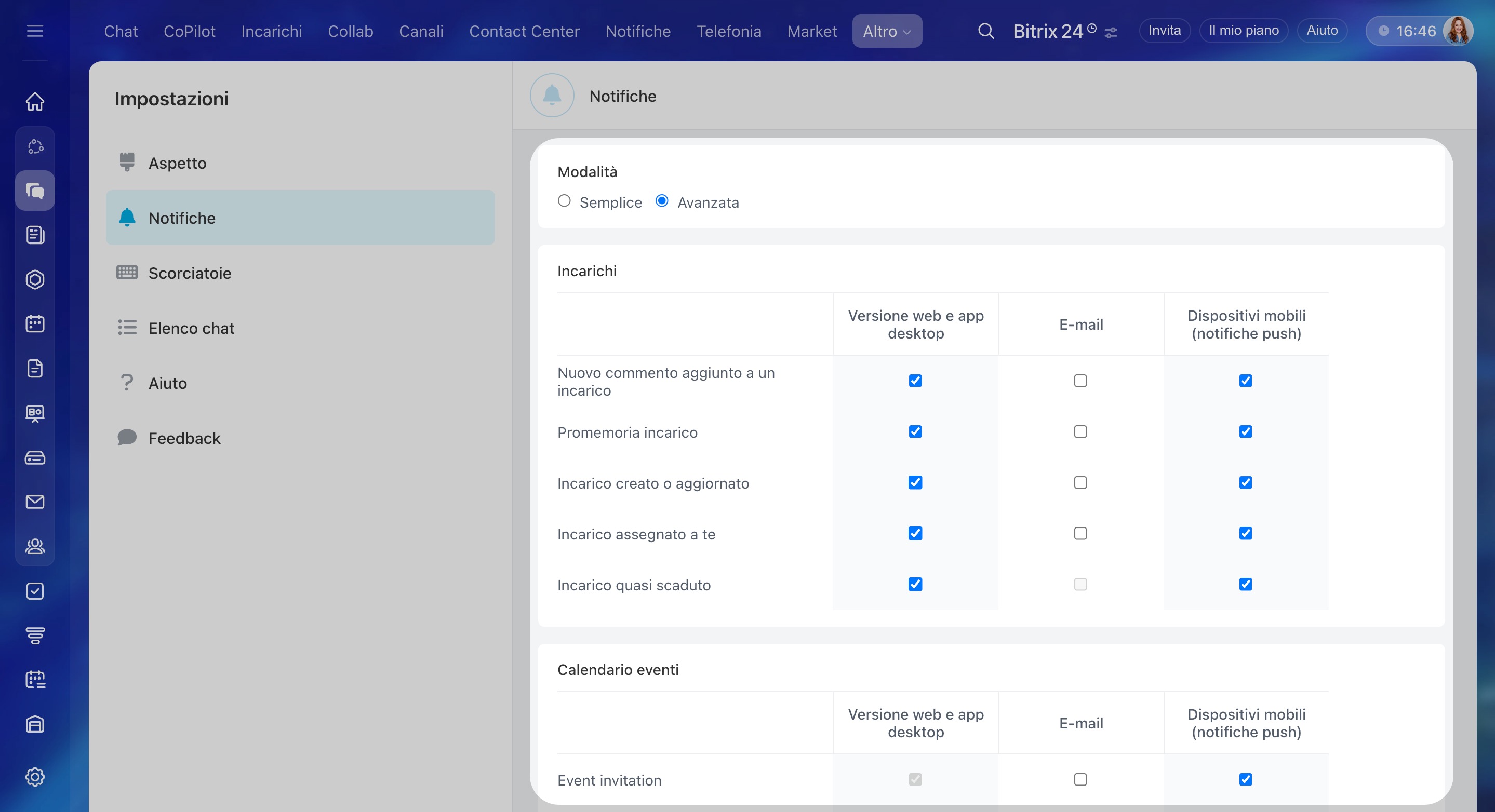 - Avanzata: le notifiche possono essere personalizzate per ciascun strumento di Bitrix24 individualmente.