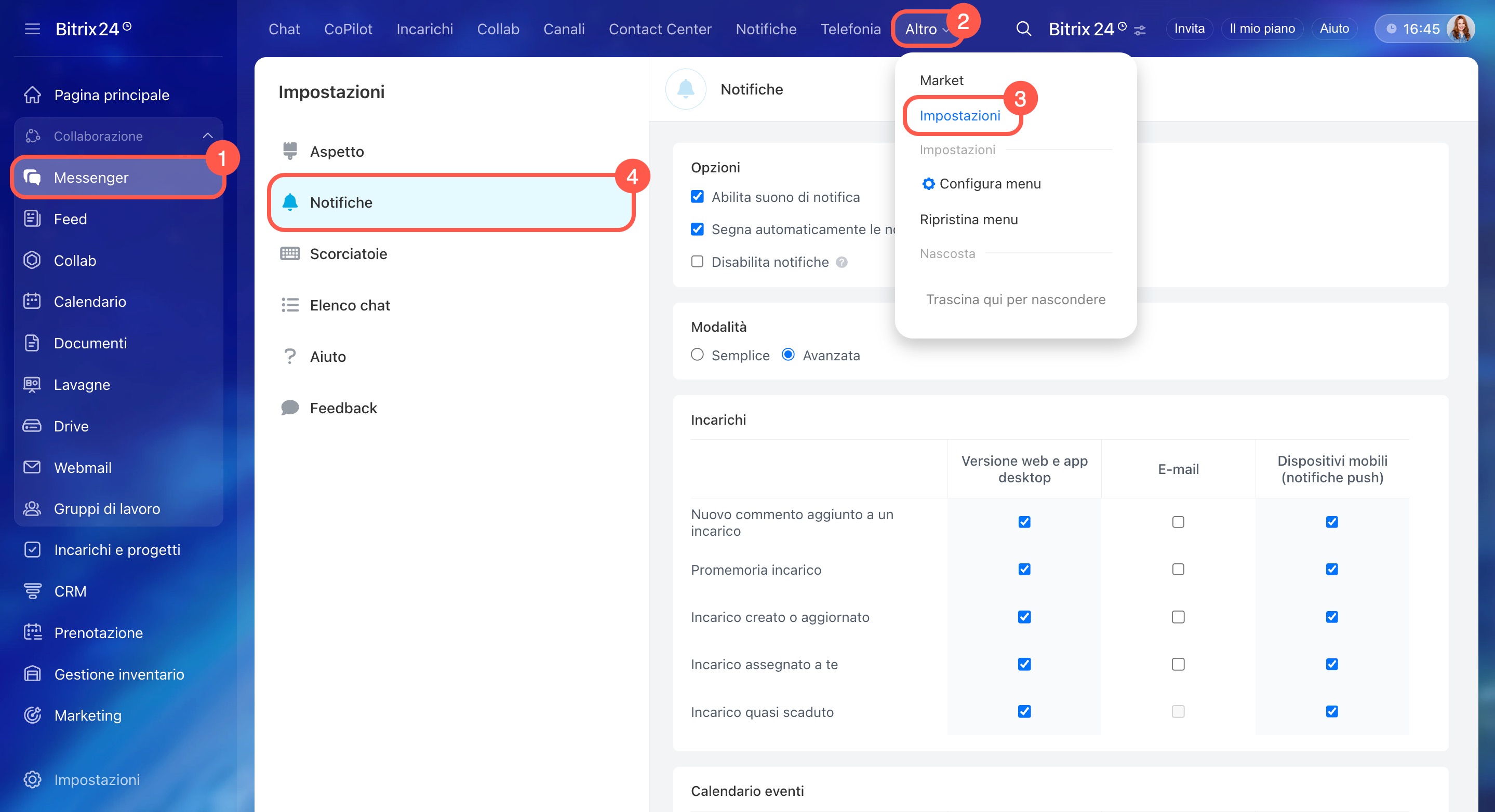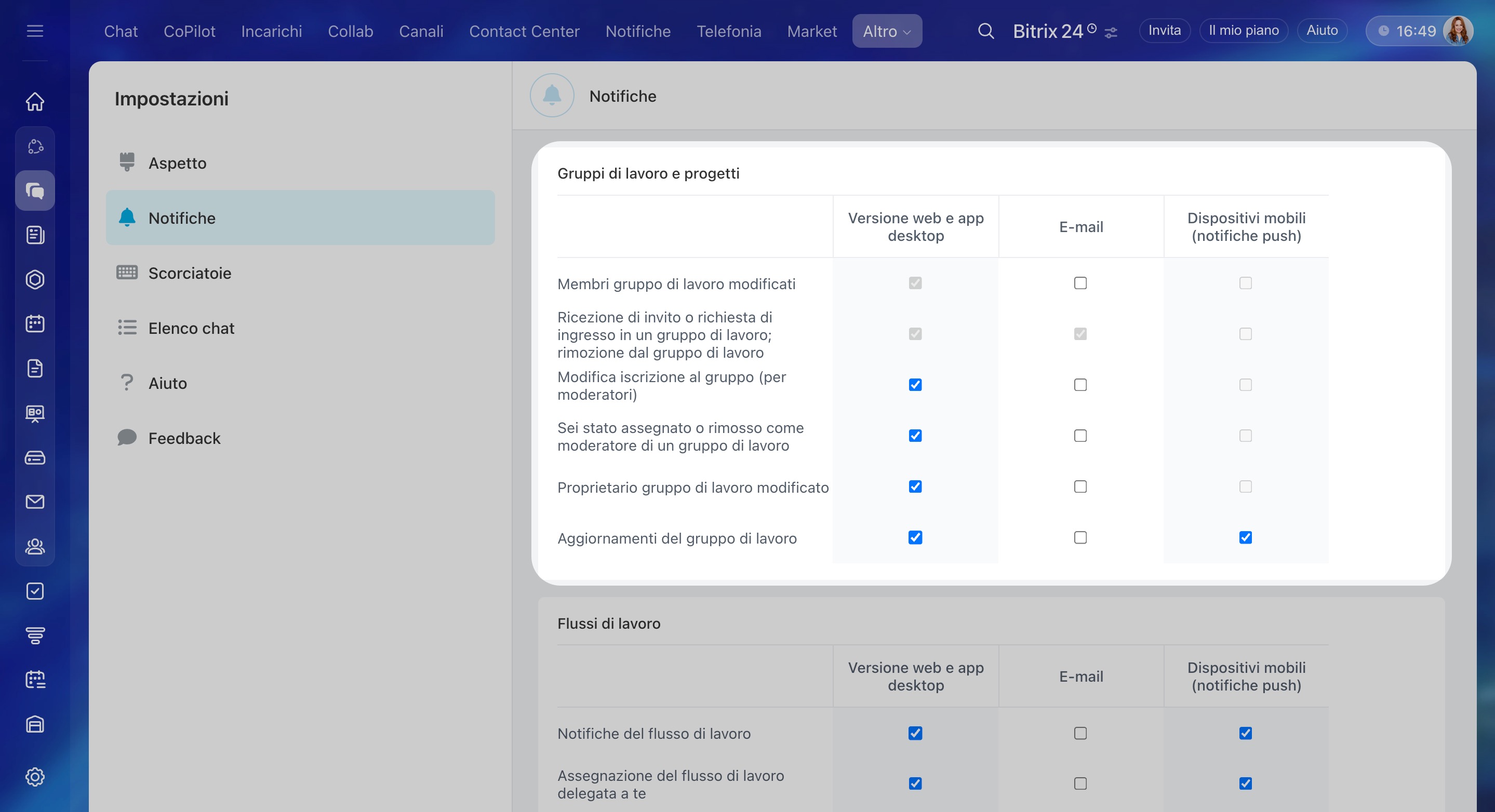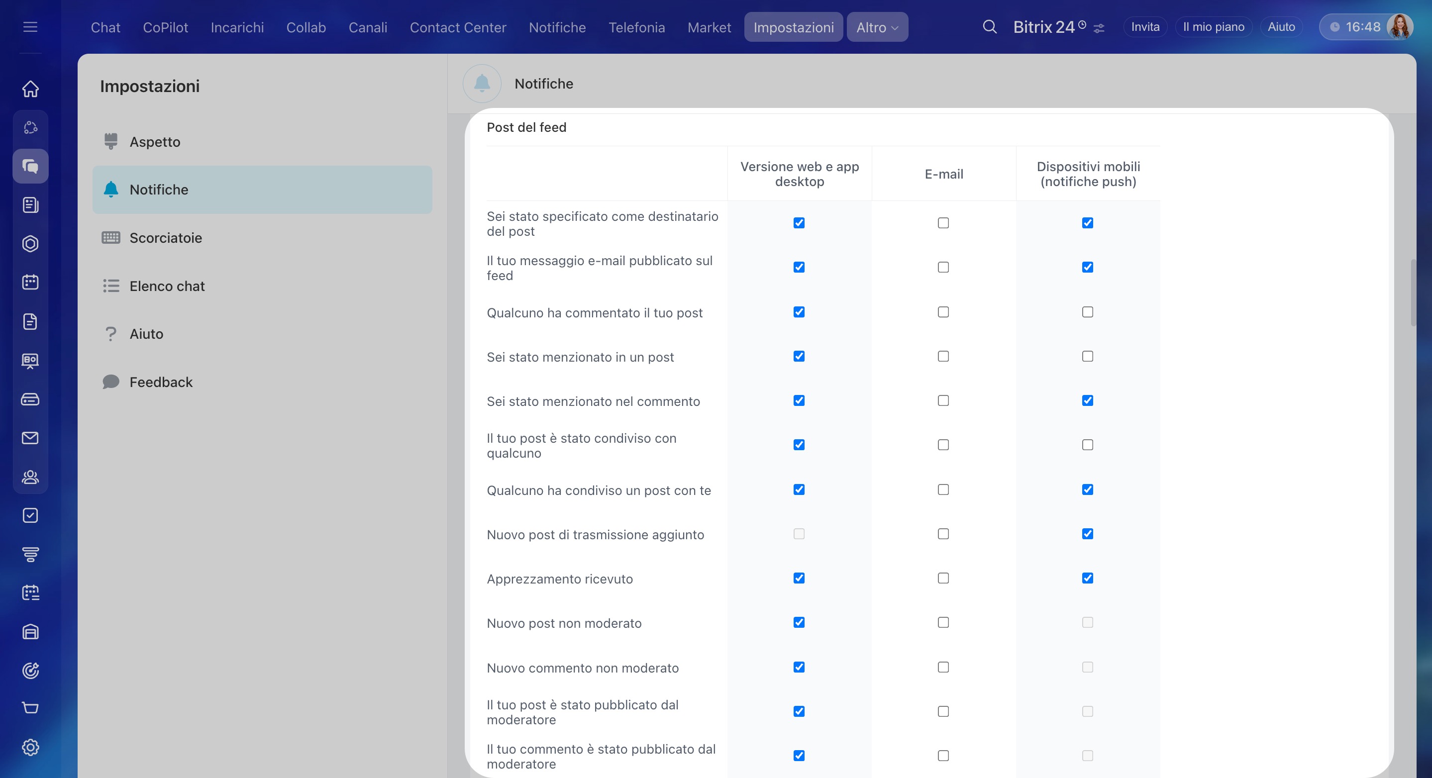 - Avanzata: le notifiche possono essere personalizzate per ciascun strumento di Bitrix24 individualmente.