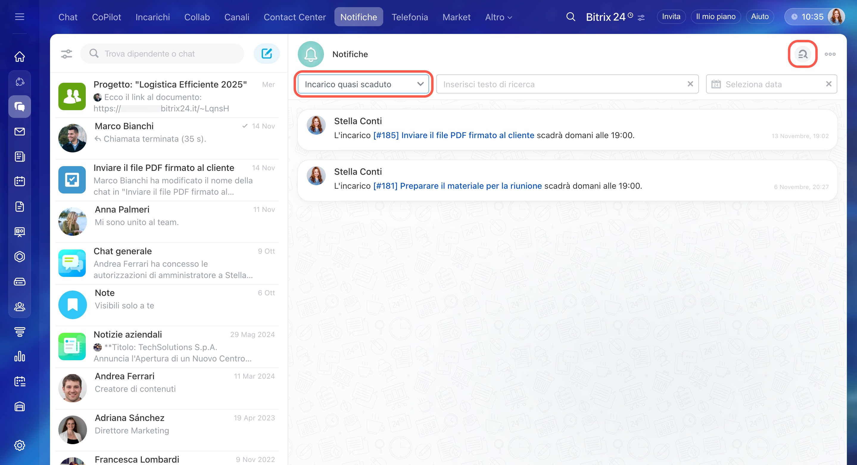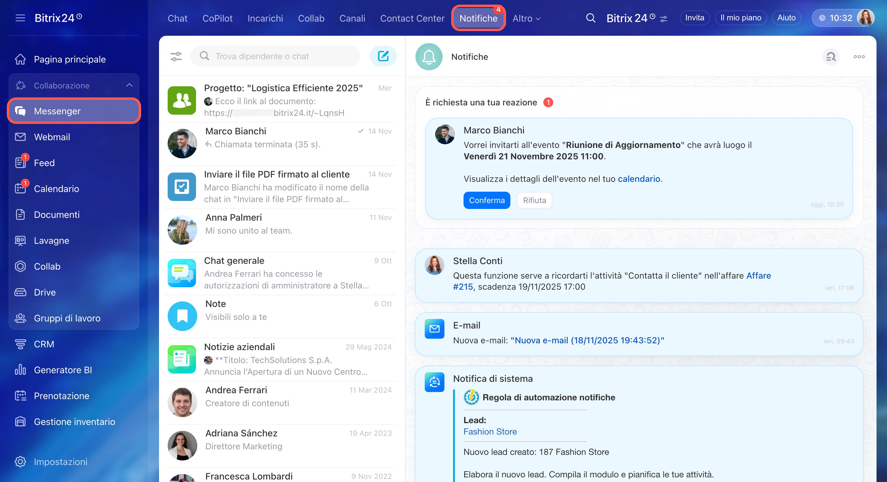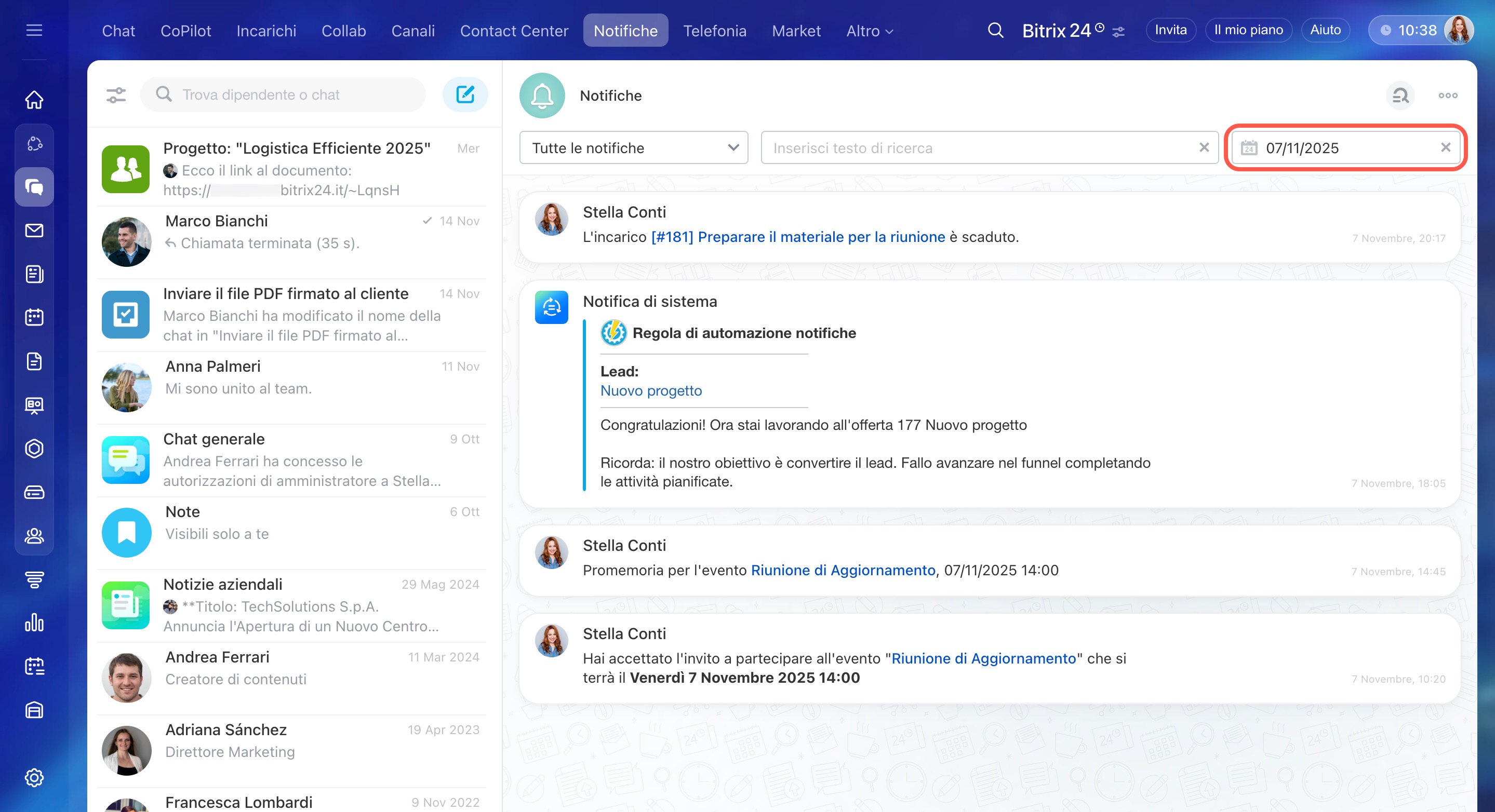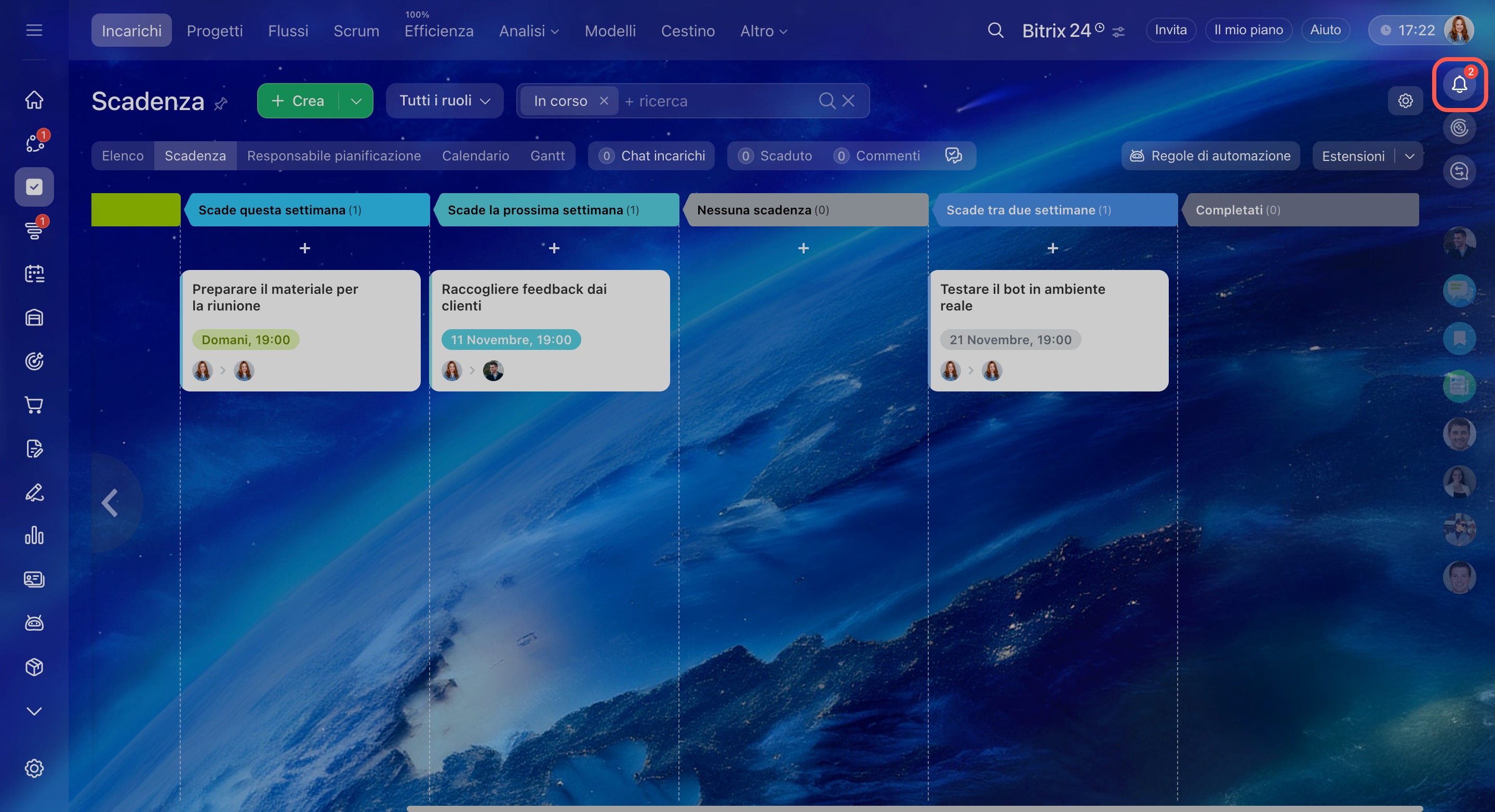 - Le notifiche in Bitrix24 ti aiutano a rimanere aggiornato sugli eventi importanti, come nuovi incarichi, commenti, riunioni o aggiornamenti CRM.