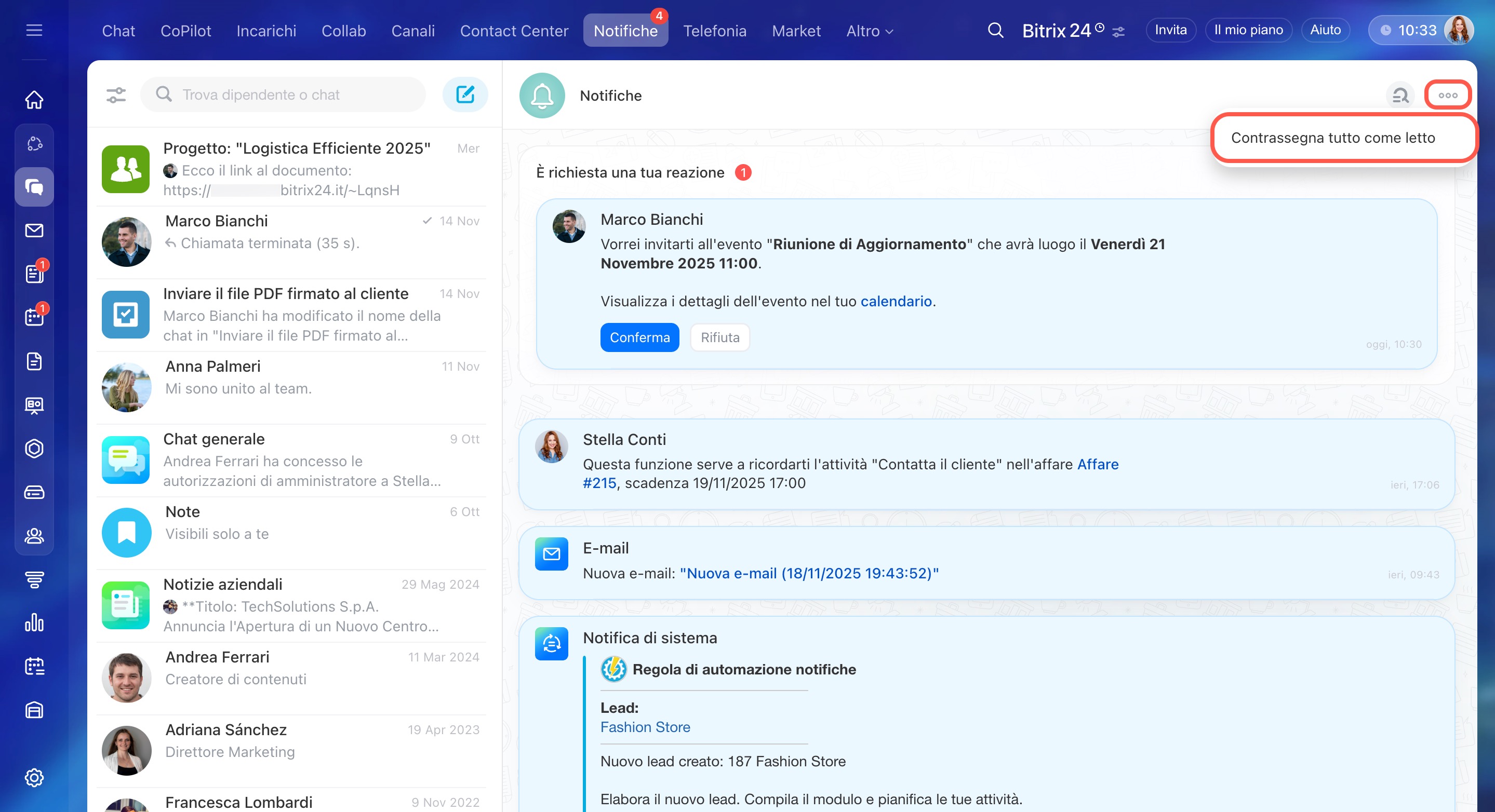 Segna tutte le notifiche come lette. Se non desideri esaminare ogni notifica, segnale tutte contemporaneamente. Questo è comodo quando gestisci gli eventi direttamente negli strumenti di Bitrix24. Fai clic su Tre punti (...) > Contrassegna tutto come letto.