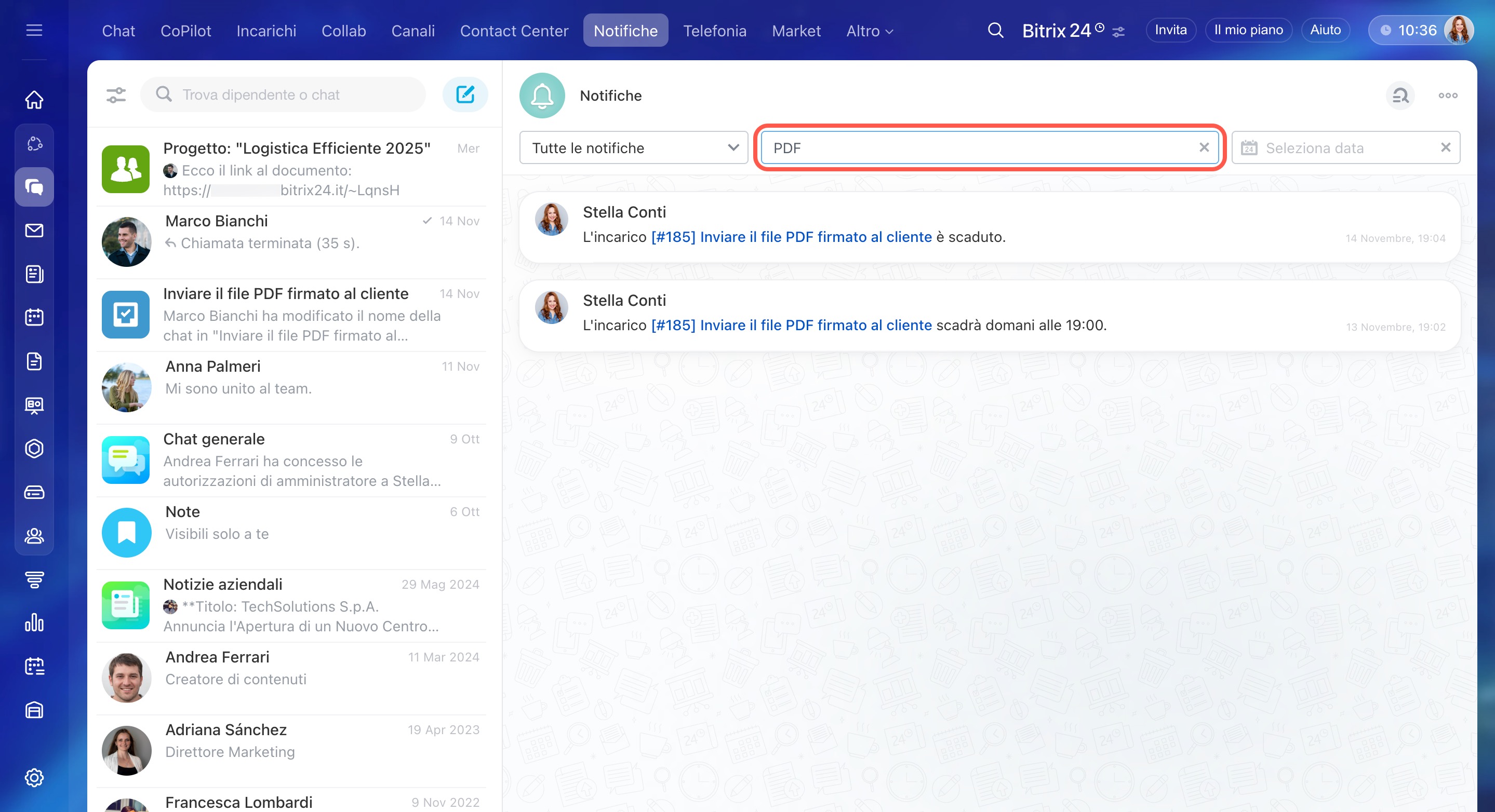 - Parole chiave: inserisci una parola chiave o parte di essa, e Bitrix24 mostrerà i risultati corrispondenti. Utile se ricordi il contenuto del messaggio ma non i dettagli, ad esempio per trovare una richiesta di approvazione di uno sconto.