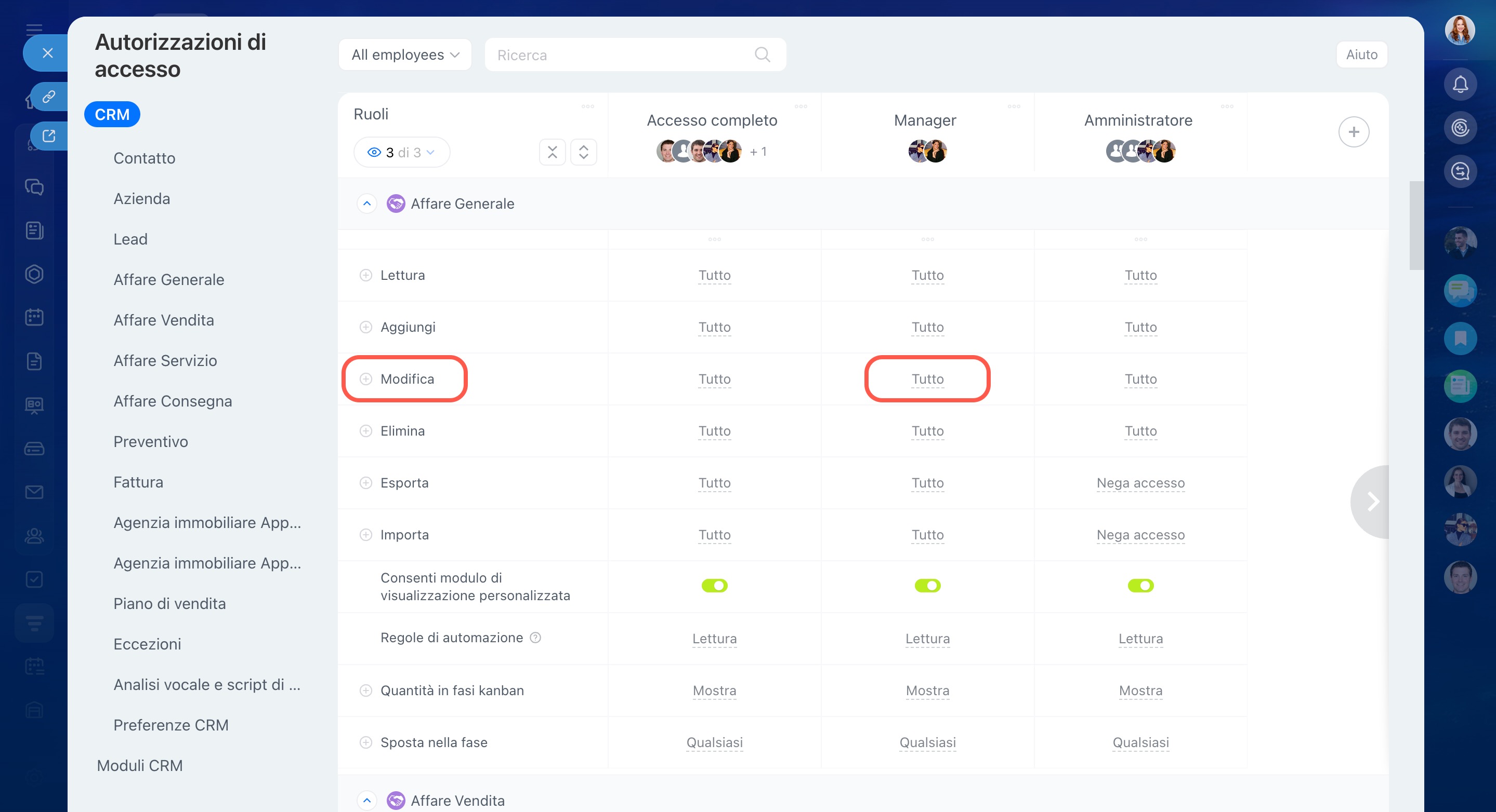 - Concedi al dipendente le autorizzazioni di accesso per modificare le entità CRM. Ad esempio, per elaborare una chat in un affare, deve avere le autorizzazioni per modificare gli affari.