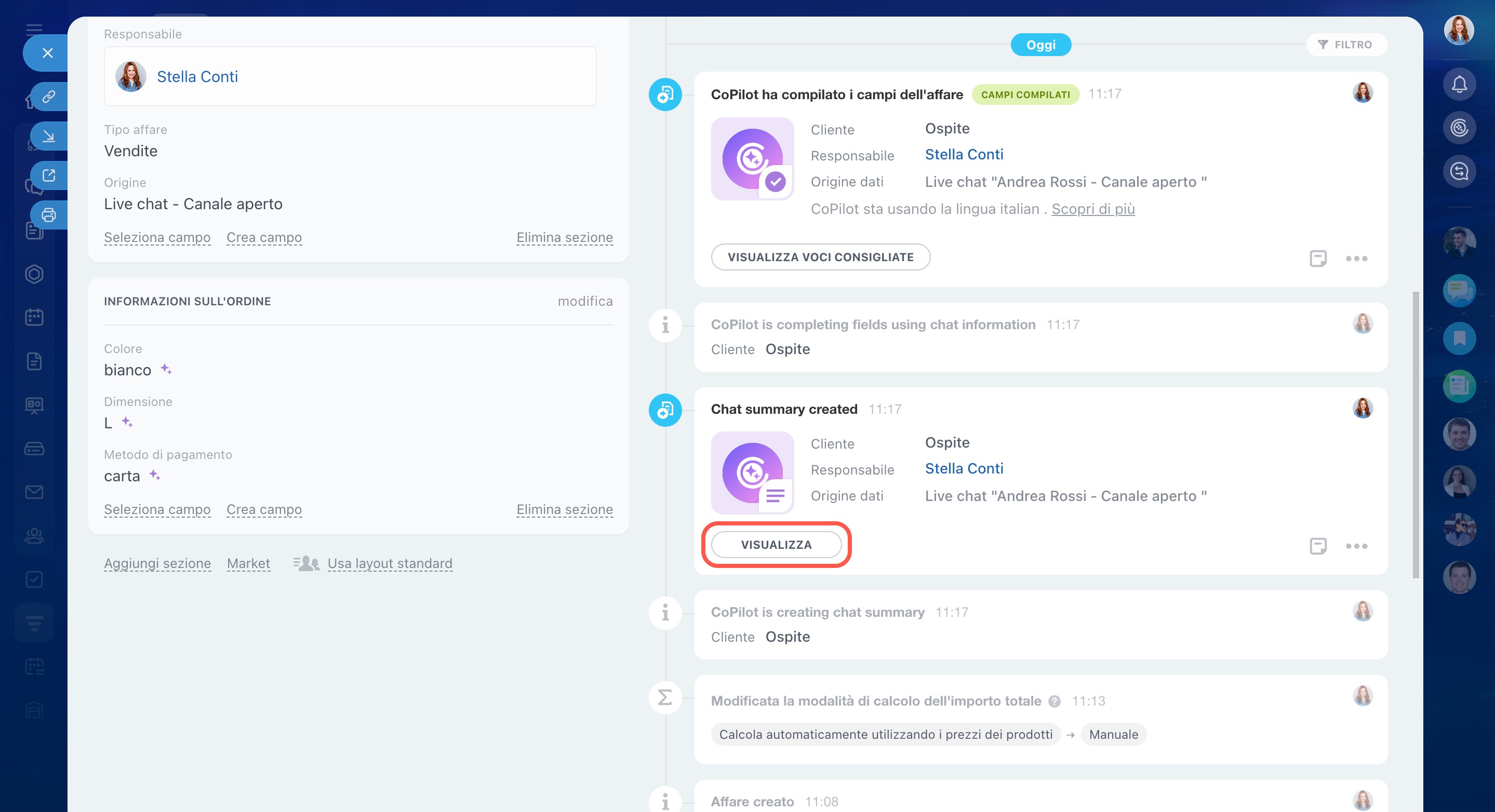 Per leggere il riepilogo, fai clic sul pulsante Visualizza nella timeline della scheda CRM.
