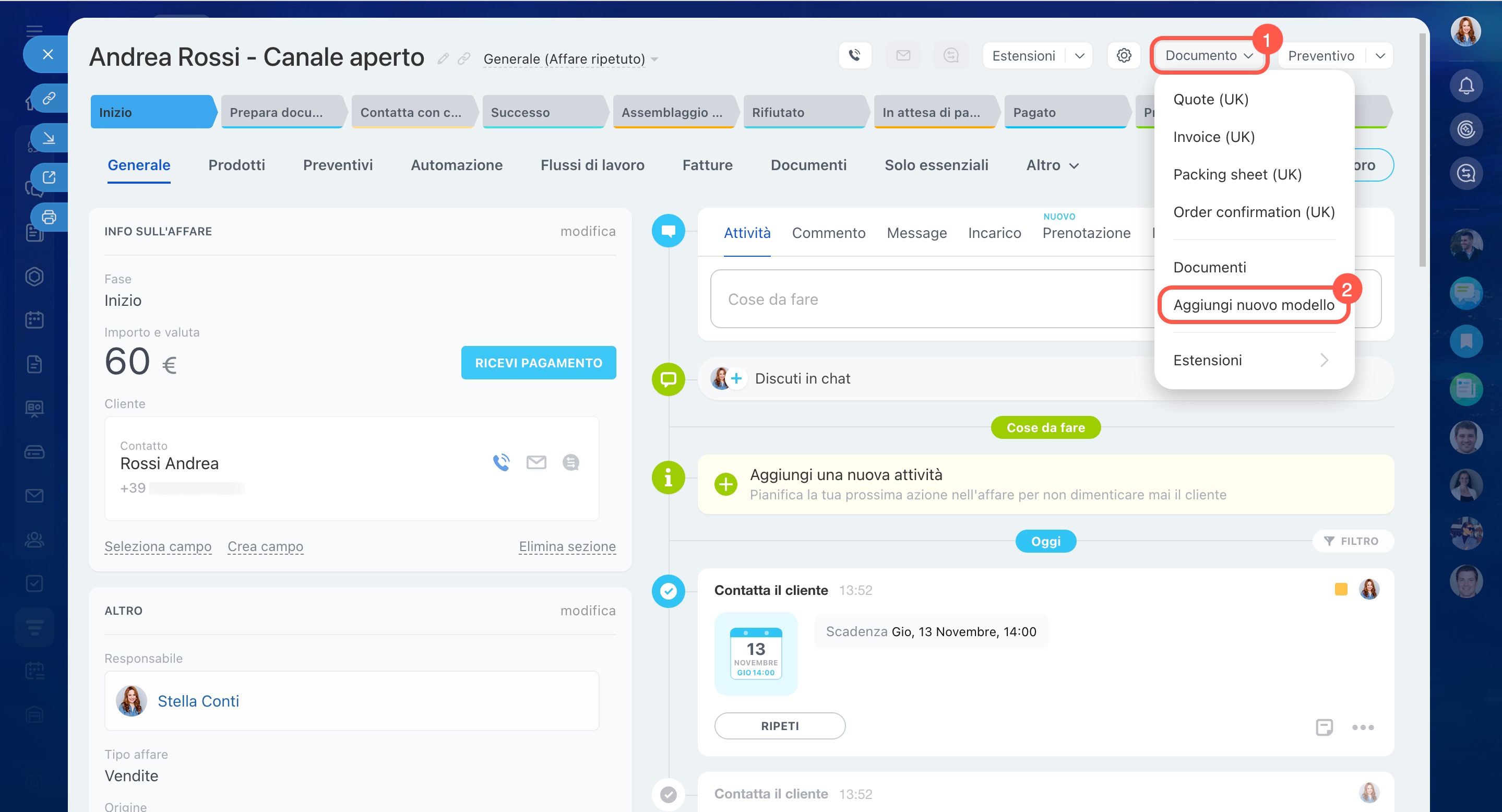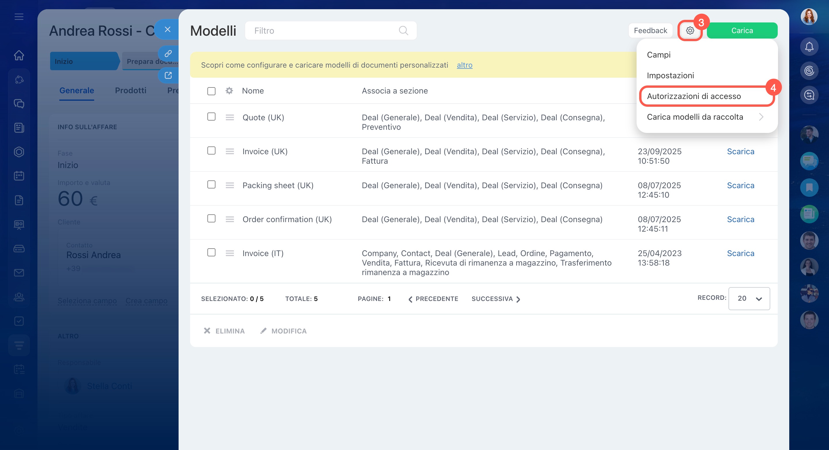 In Bitrix24 è possibile generare fatture, atti di consegna, bolle di consegna e altri documenti basati sui dati degli elementi CRM e della gestione inventario. Le autorizzazioni decidono chi può visualizzare, modificare i documenti e gestire i modelli.