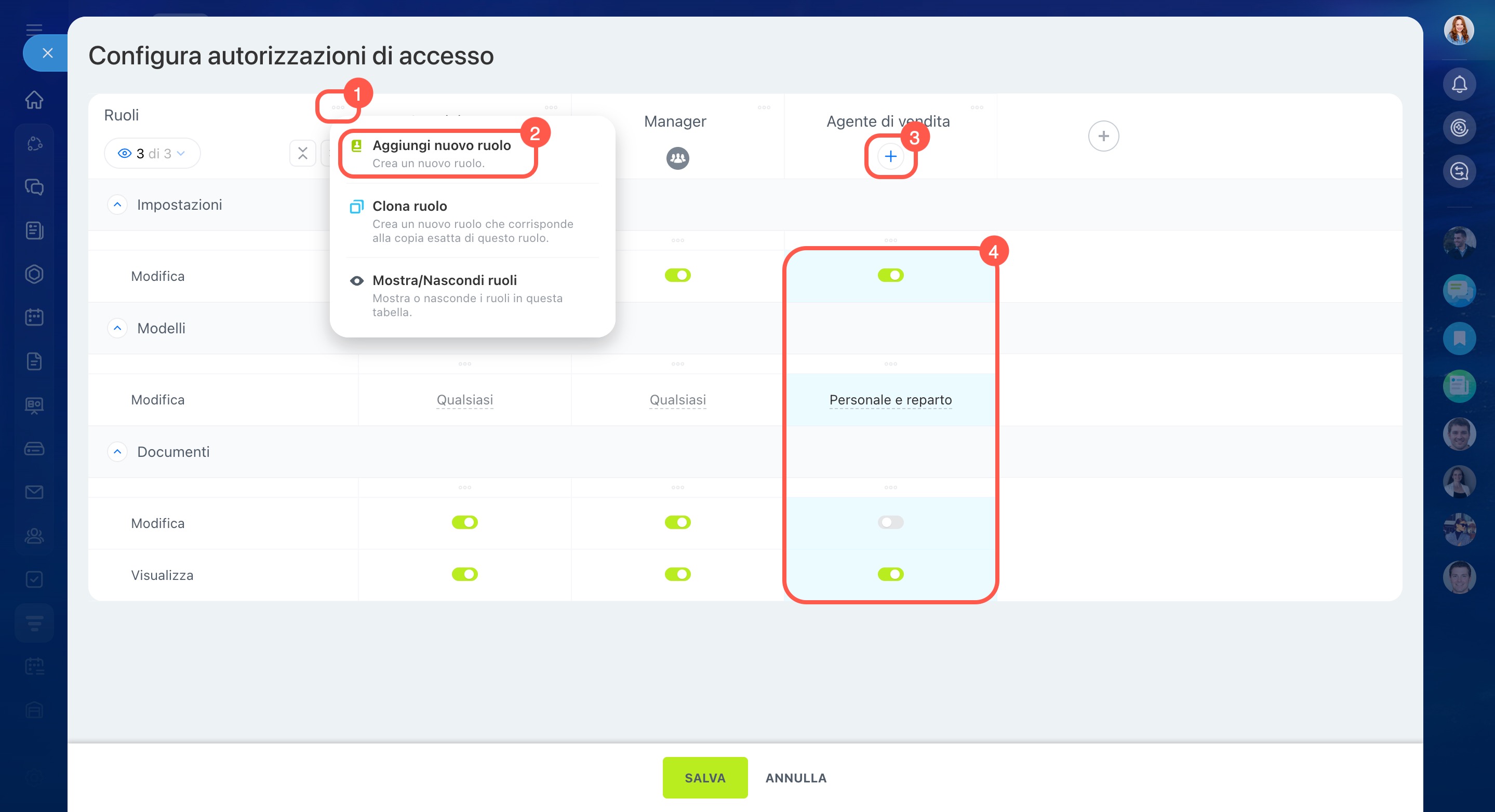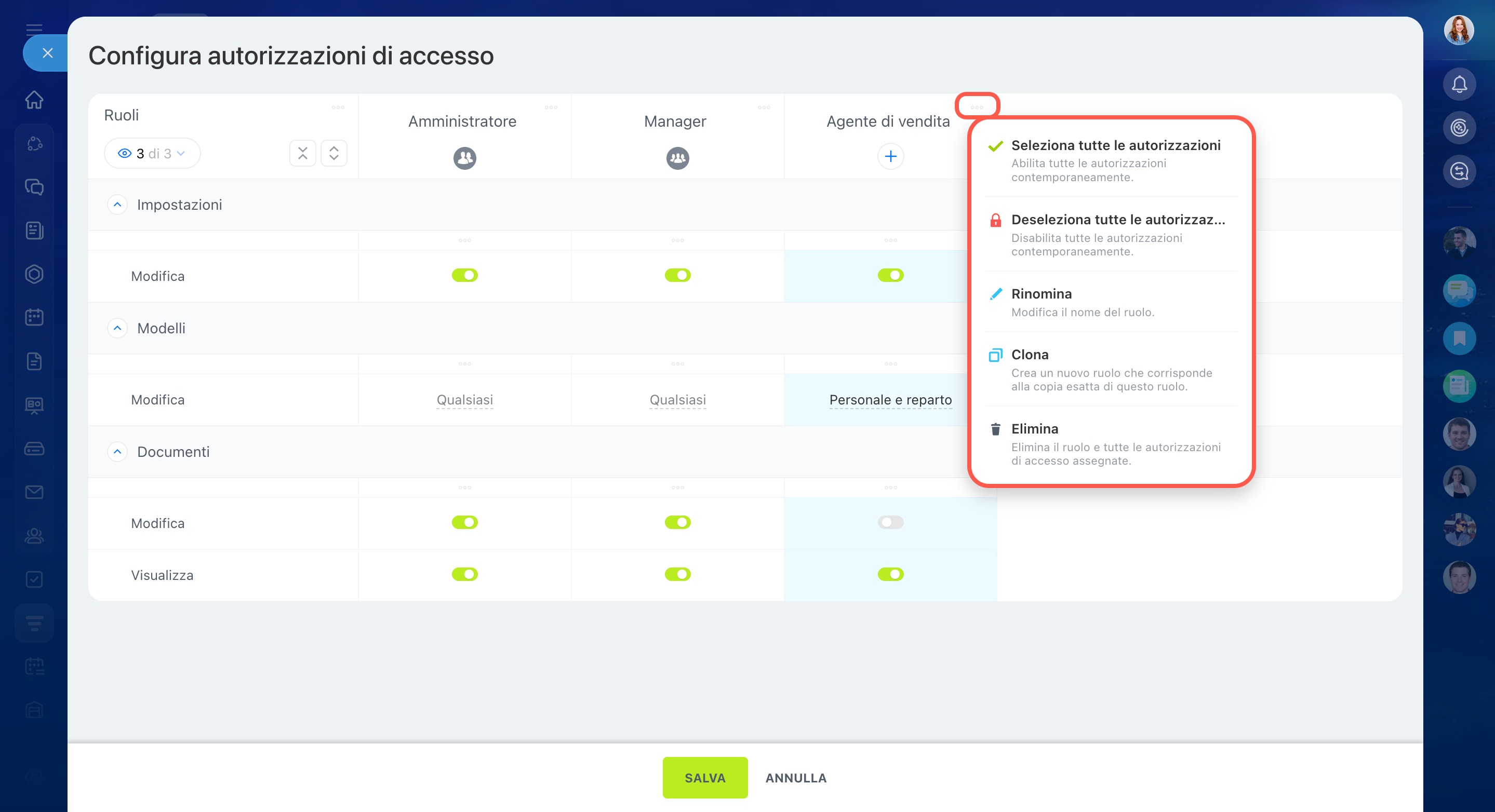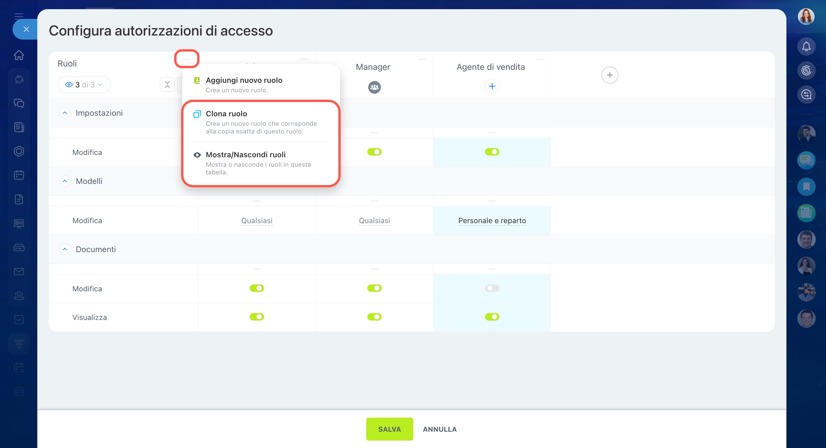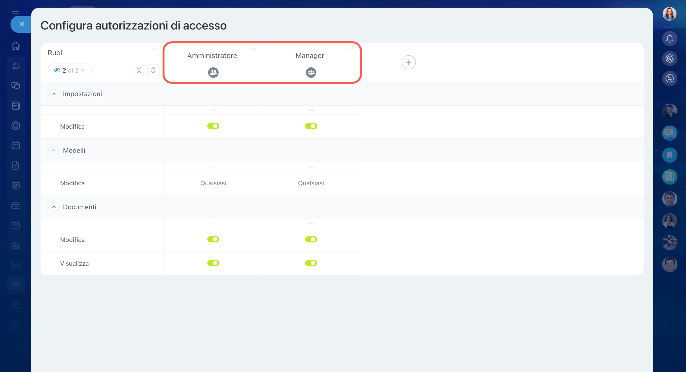 Un ruolo è un insieme di autorizzazioni di accesso assegnato a un utente. Di default, sono disponibili due ruoli: Amministratore e Manager. Le loro impostazioni consentono ai dipendenti di lavorare con tutti i documenti e gestire i parametri di accesso.