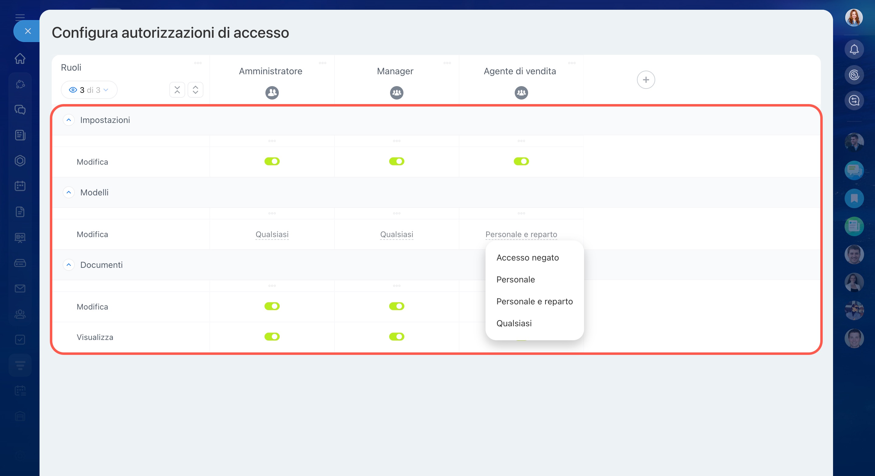 Impostazioni. Questo permesso consente di modificare i parametri di accesso a documenti e modelli. Può essere assegnato a un amministratore o supervisore per configurare ruoli e concedere accesso a dipendenti e reparti. Ad esempio, un supervisore può abilitare l'accesso ai modelli di documenti per il proprio reparto.