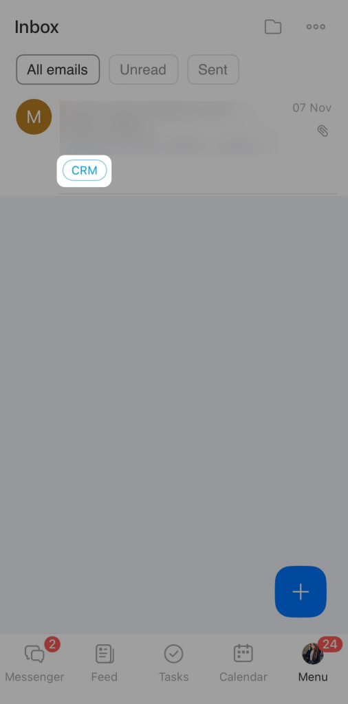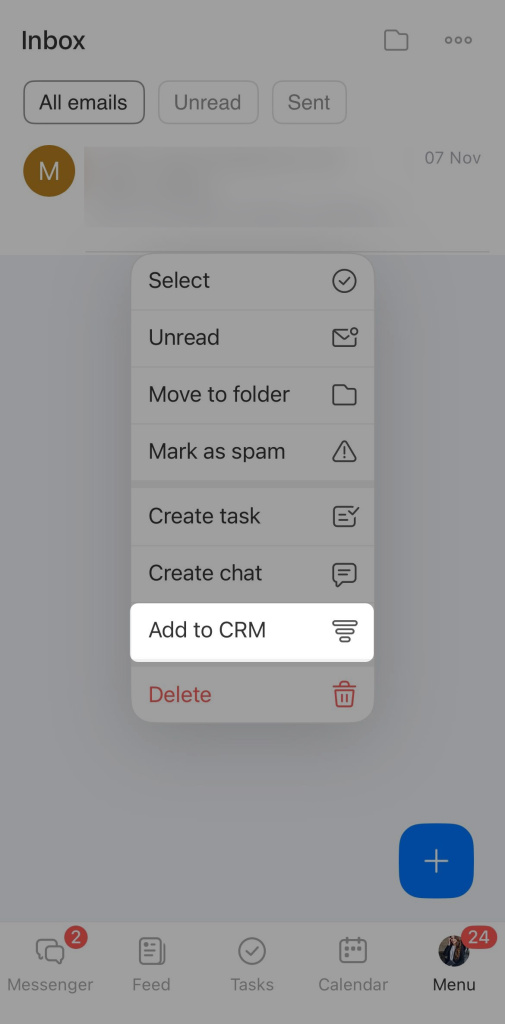 Tocca e tieni premuta l’e-mail, quindi seleziona un'azione. Ad esempio, aggiungila al CRM. Le e-mail collegate al CRM mostreranno un'etichetta CRM, consentendoti di accedere rapidamente alla scheda correlata.