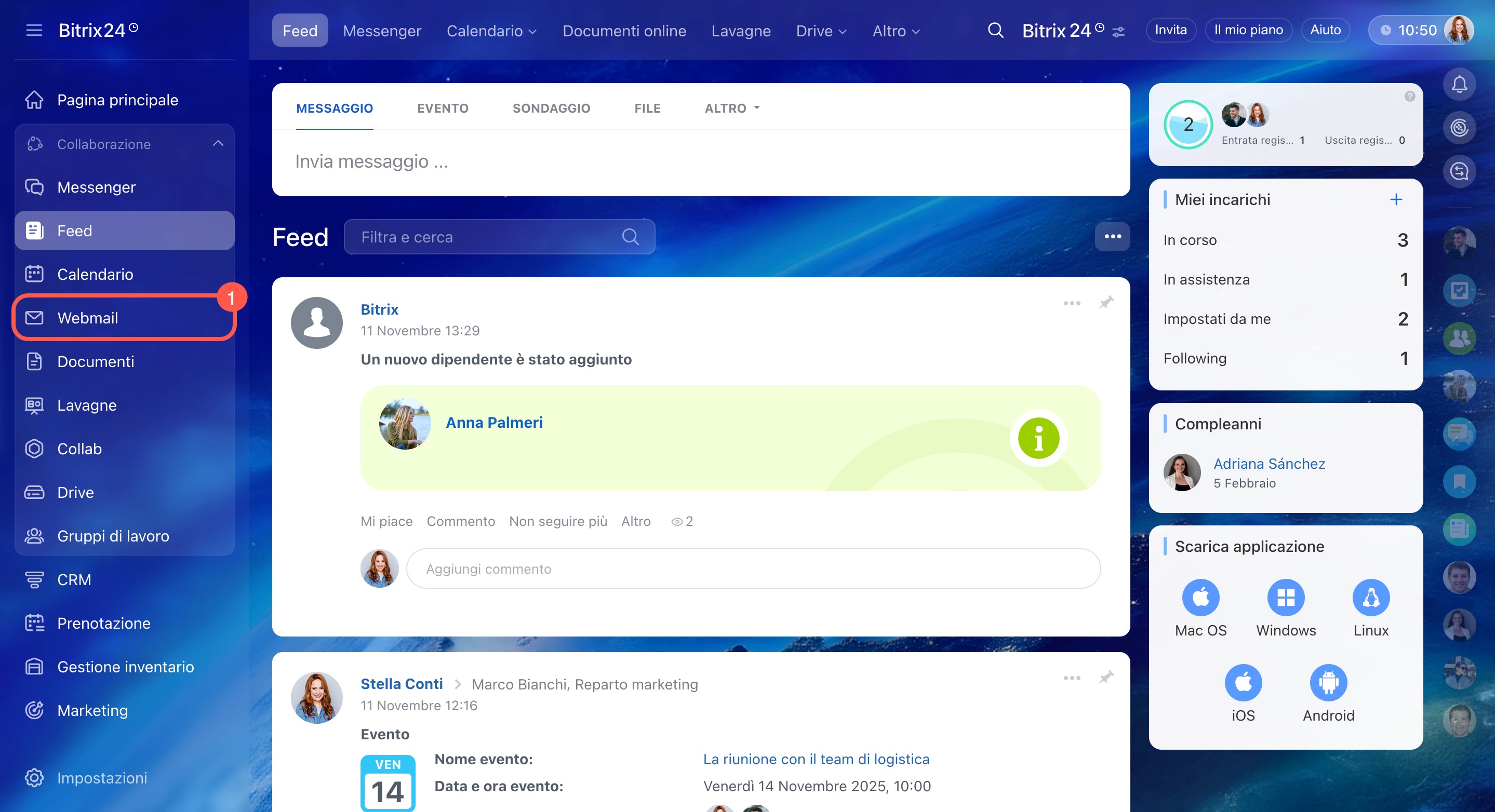 - Bitrix24 consente una gestione flessibile dell'accesso a Webmail, proteggendo i dati e facilitando l'uso della posta aziendale.