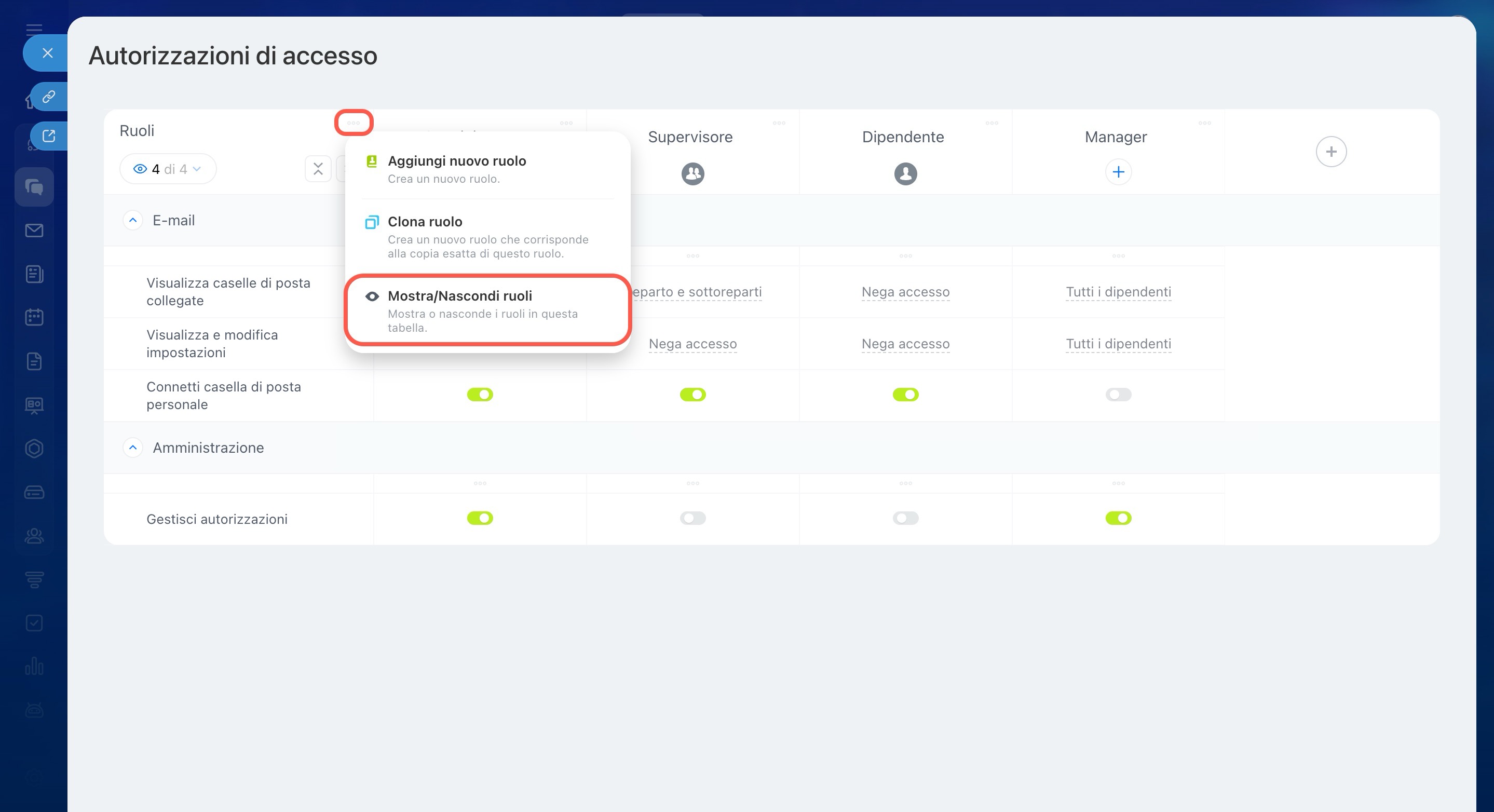 Mostrare un ruolo nell'elenco. Puoi lasciare visibili solo i ruoli necessari e nascondere gli altri. Utile per confrontare o modificare più ruoli. Fai clic su Mostra/Nascondi ruoli e seleziona i ruoli desiderati.