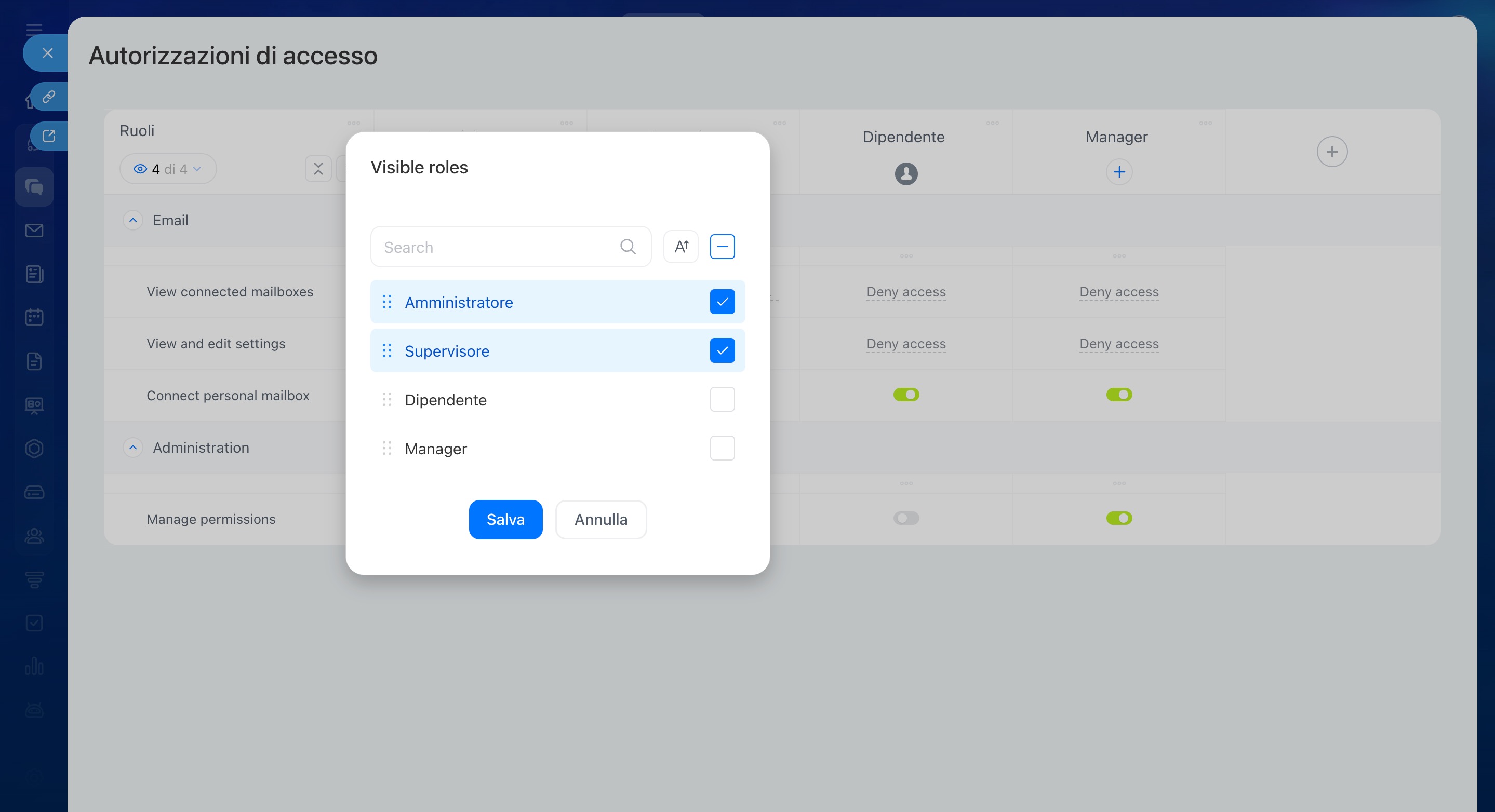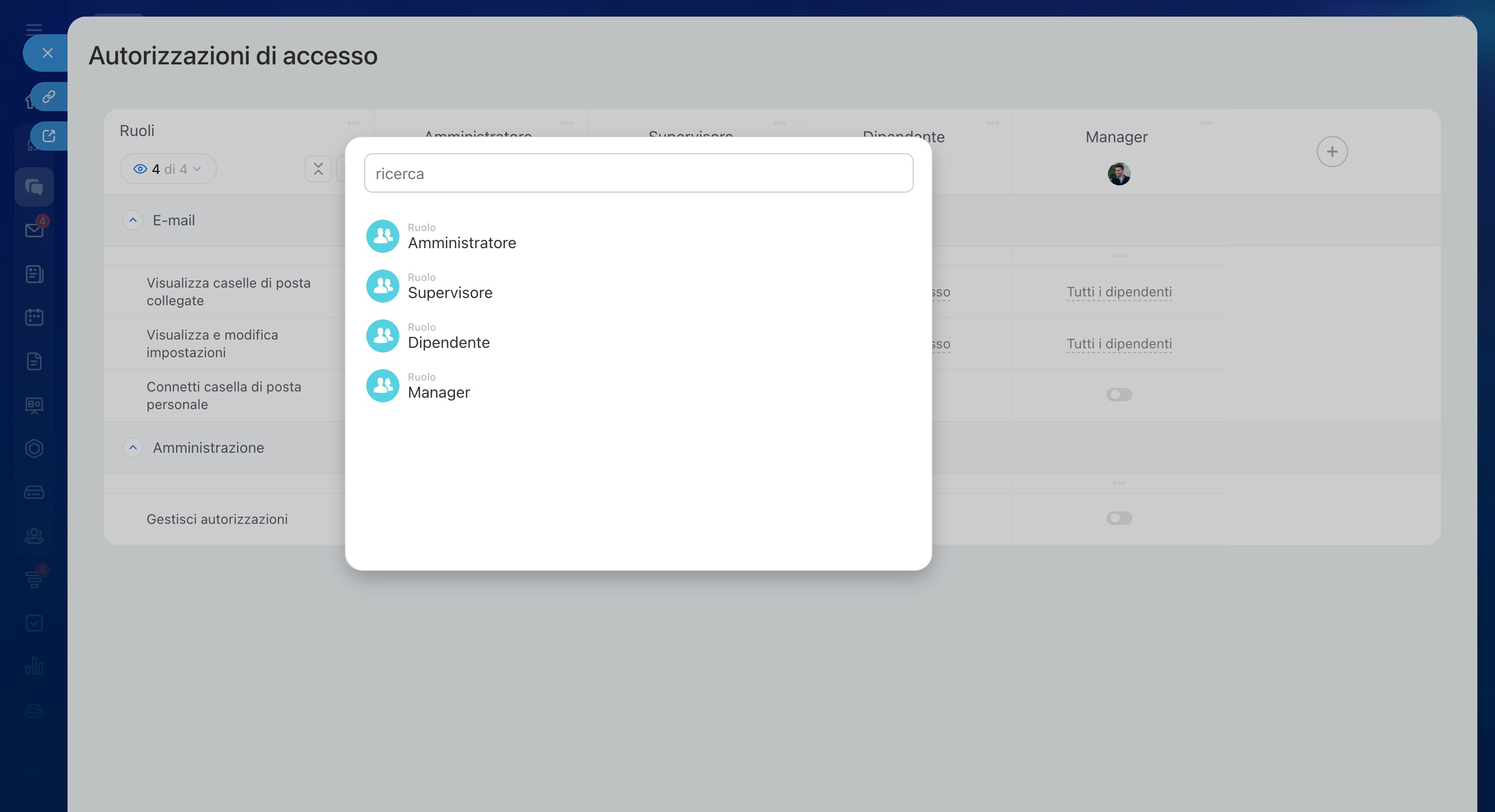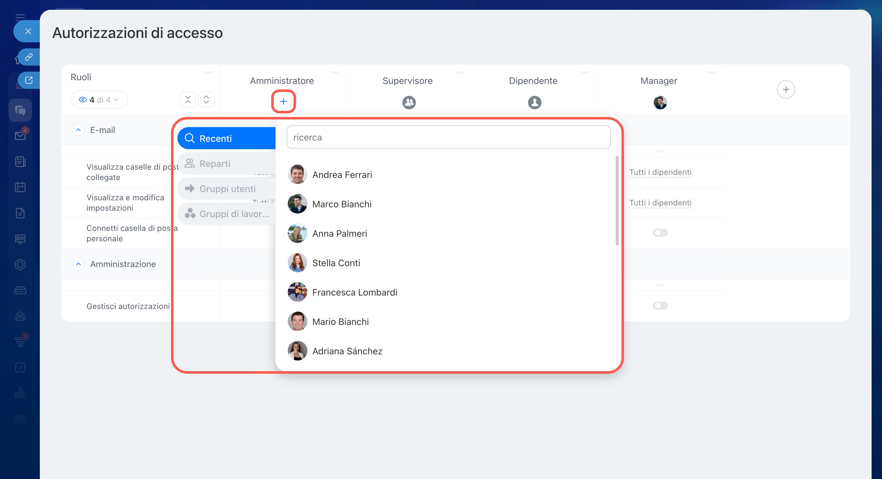 Per assegnare un ruolo ai dipendenti, fai clic su Più (+) sotto il ruolo desiderato e seleziona un dipendente, reparto o gruppo. Ad esempio, il supervisore può vedere le caselle collegate dei propri subordinati, mentre il dipendente può visualizzare e modificare le impostazioni delle proprie caselle.