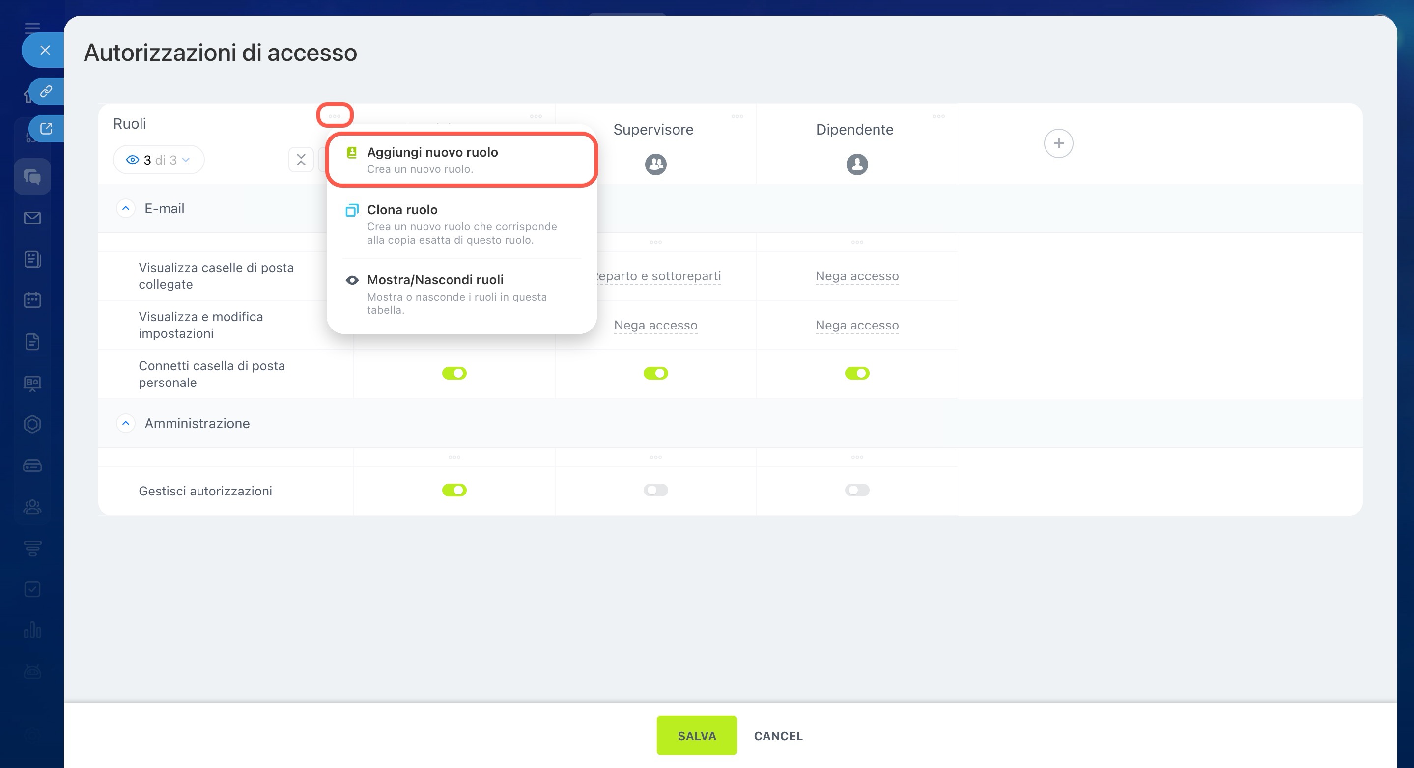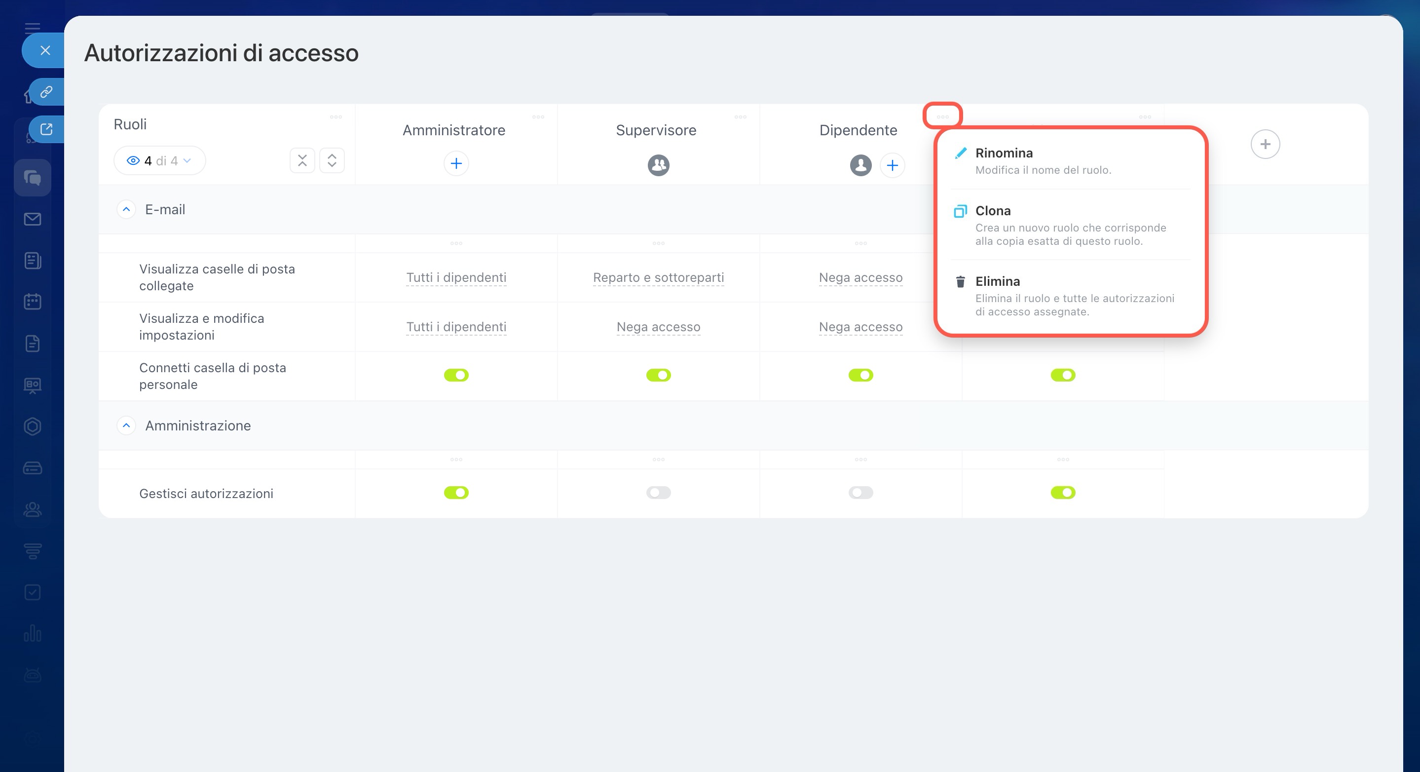 - Nei permessi di accesso sono disponibili tre ruoli standard: amministratore, supervisore e dipendente. Se questi ruoli non sono adatti, è possibile copiarli, modificarli o crearne di nuovi.