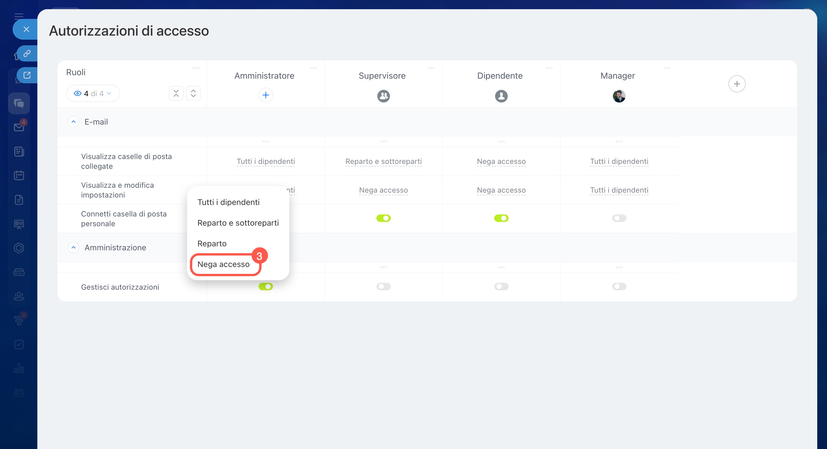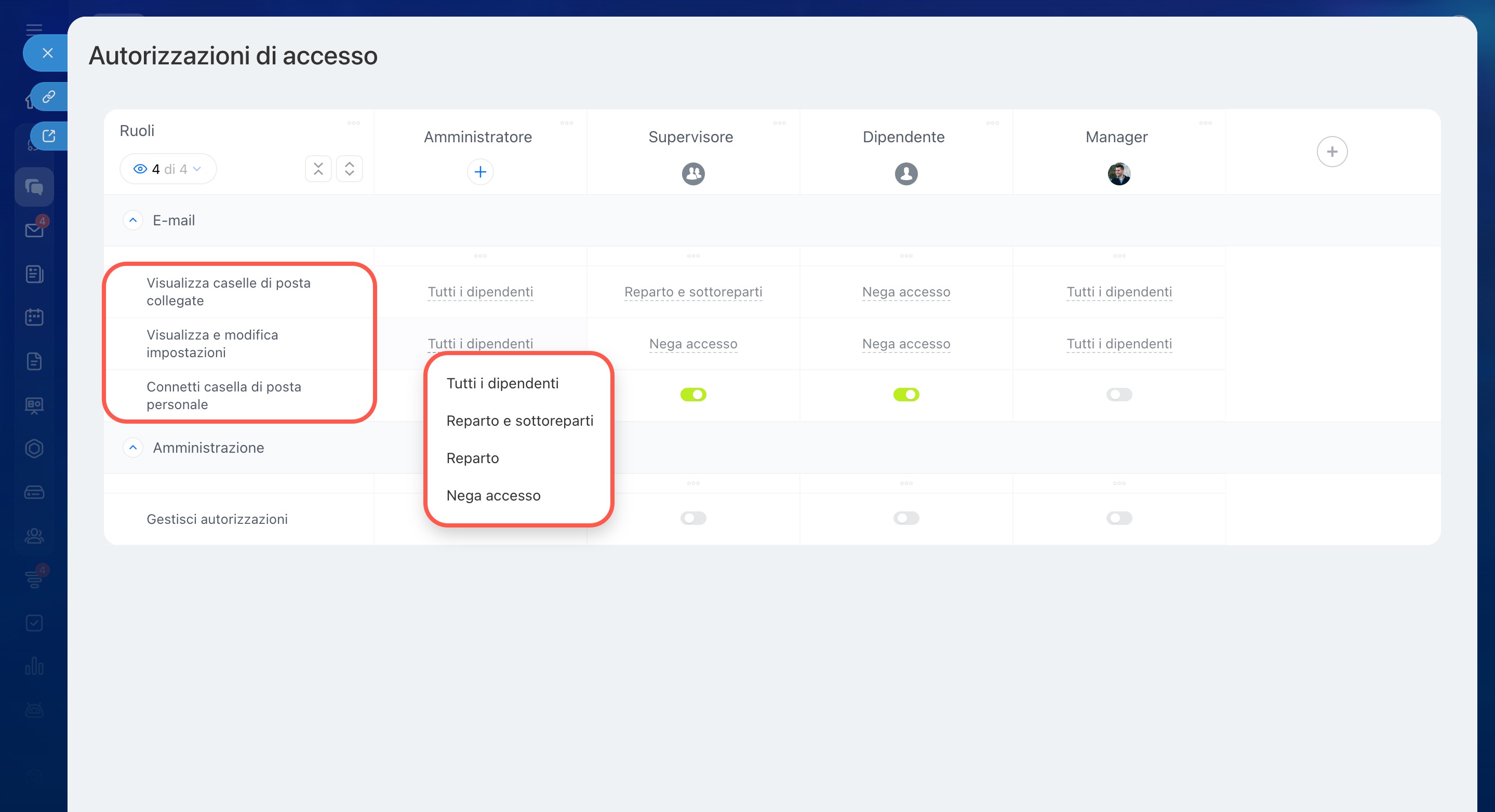 Bitrix24 permette di gestire in modo flessibile l'accesso alla sezione Webmail. Questo aiuta a proteggere i dati e semplifica l'uso della posta aziendale. Decidi chi può visualizzare, collegare e gestire le caselle di posta. Ad esempio: