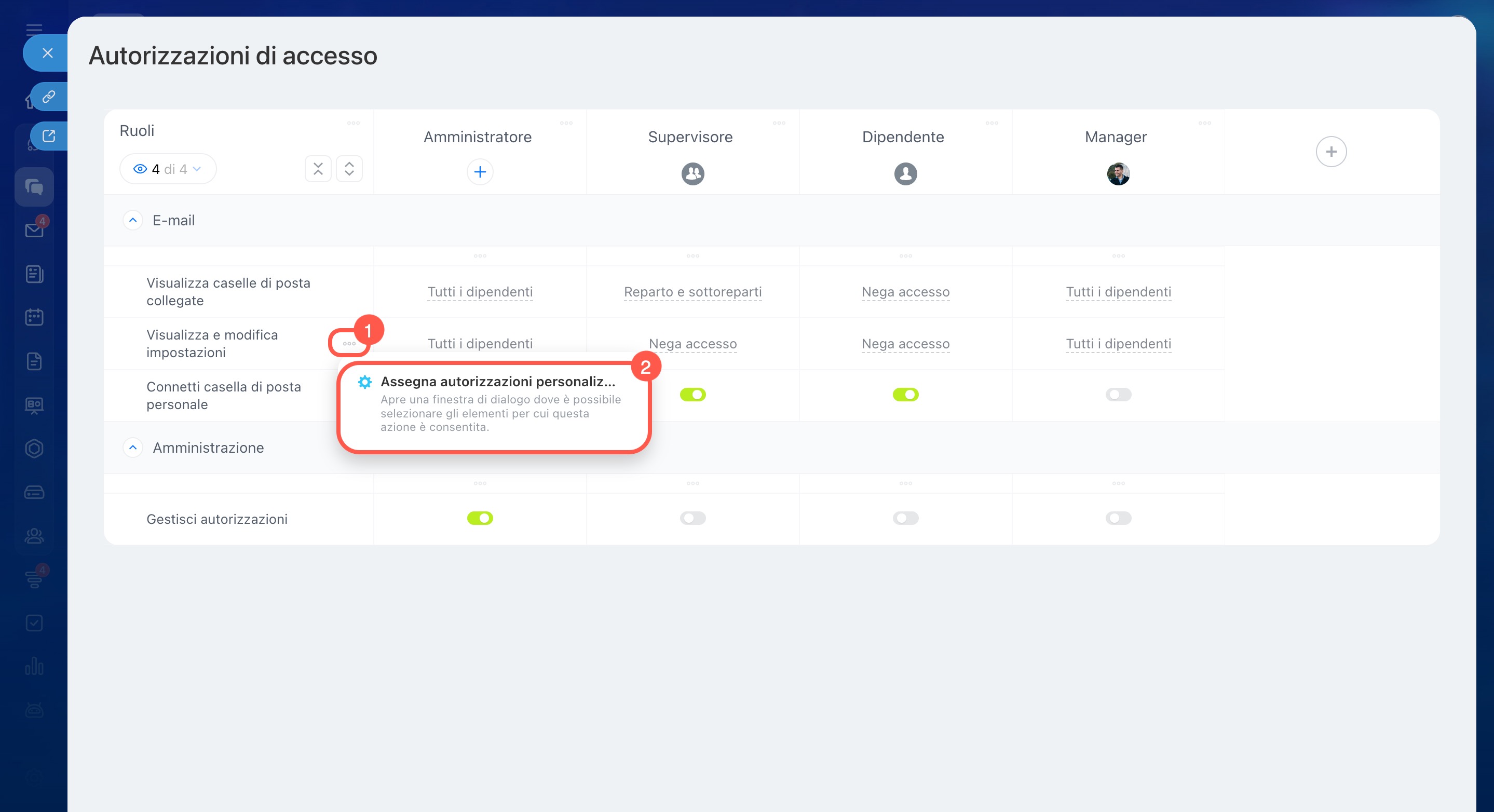 Per modificare i permessi di tutti i ruoli contemporaneamente, utilizza l'opzione Assegna autorizzazioni personalizzate. Ad esempio, puoi disabilitare la possibilità di visualizzare e modificare le impostazioni delle caselle a tutti i ruoli.
