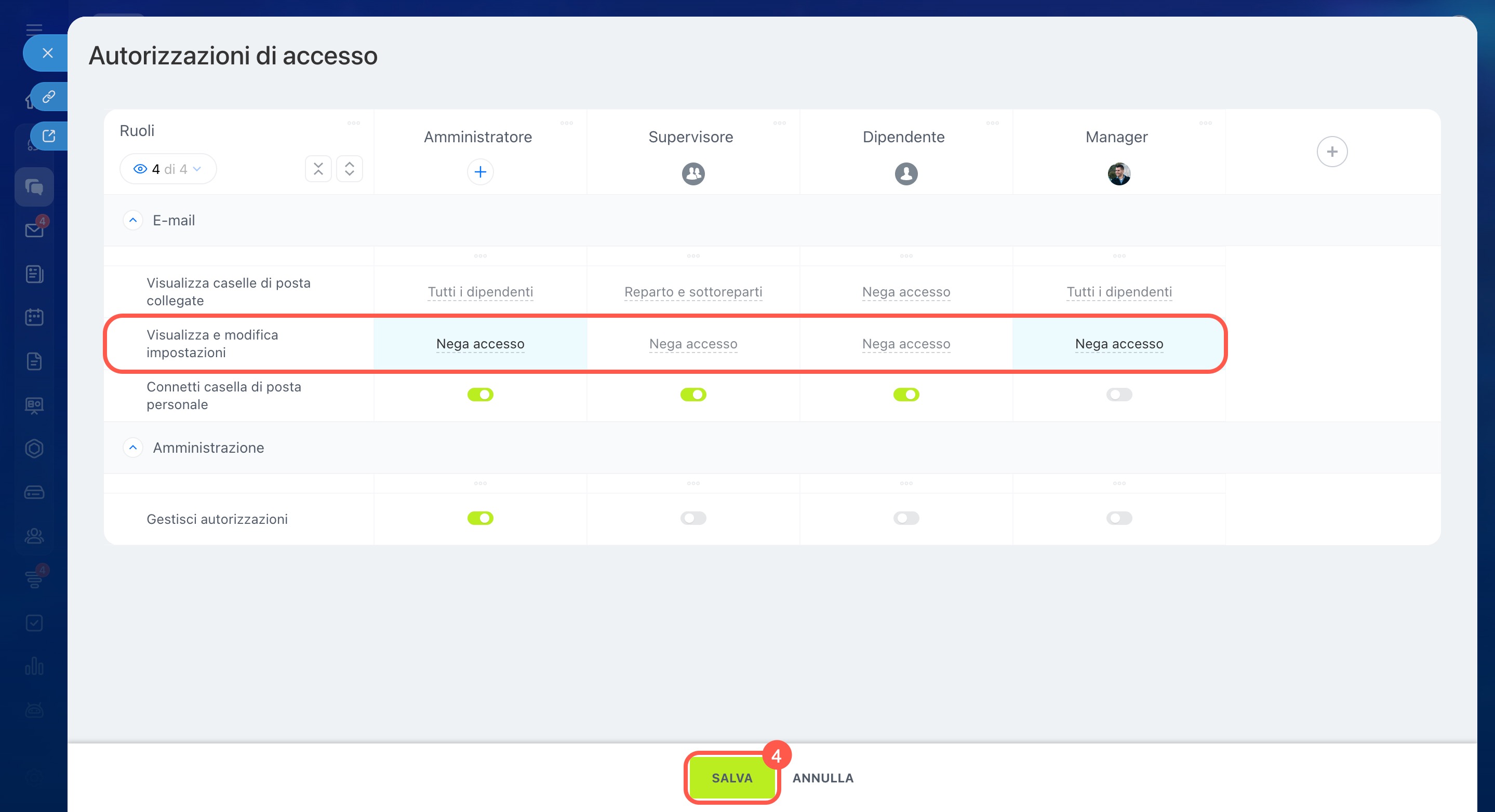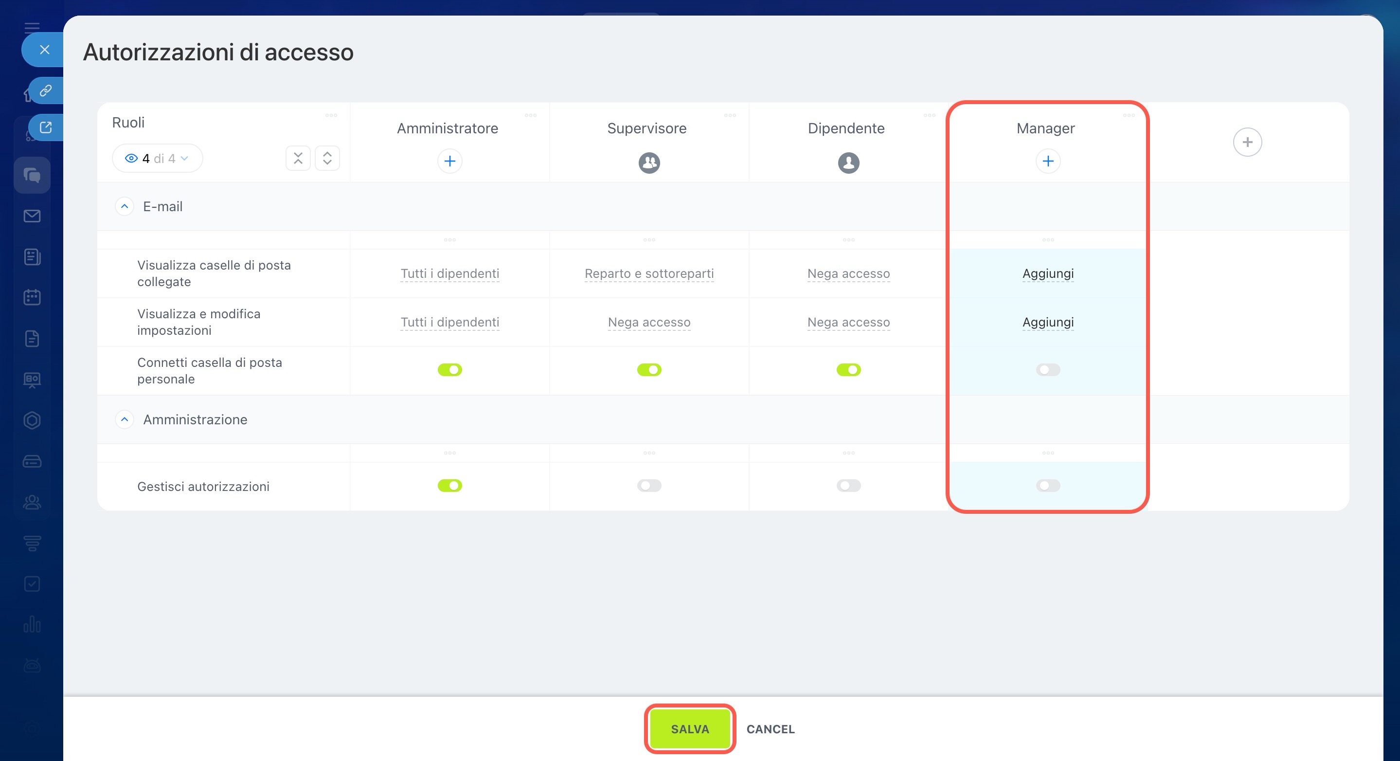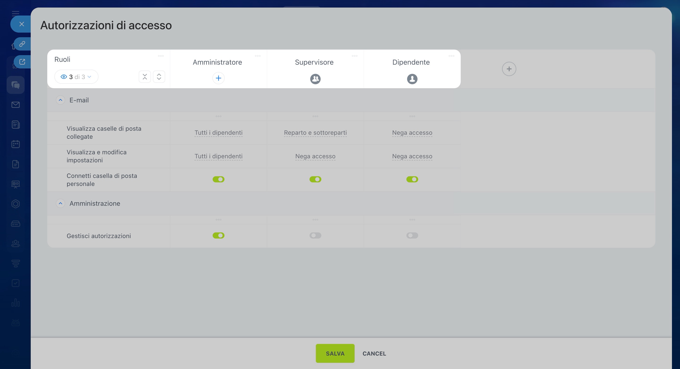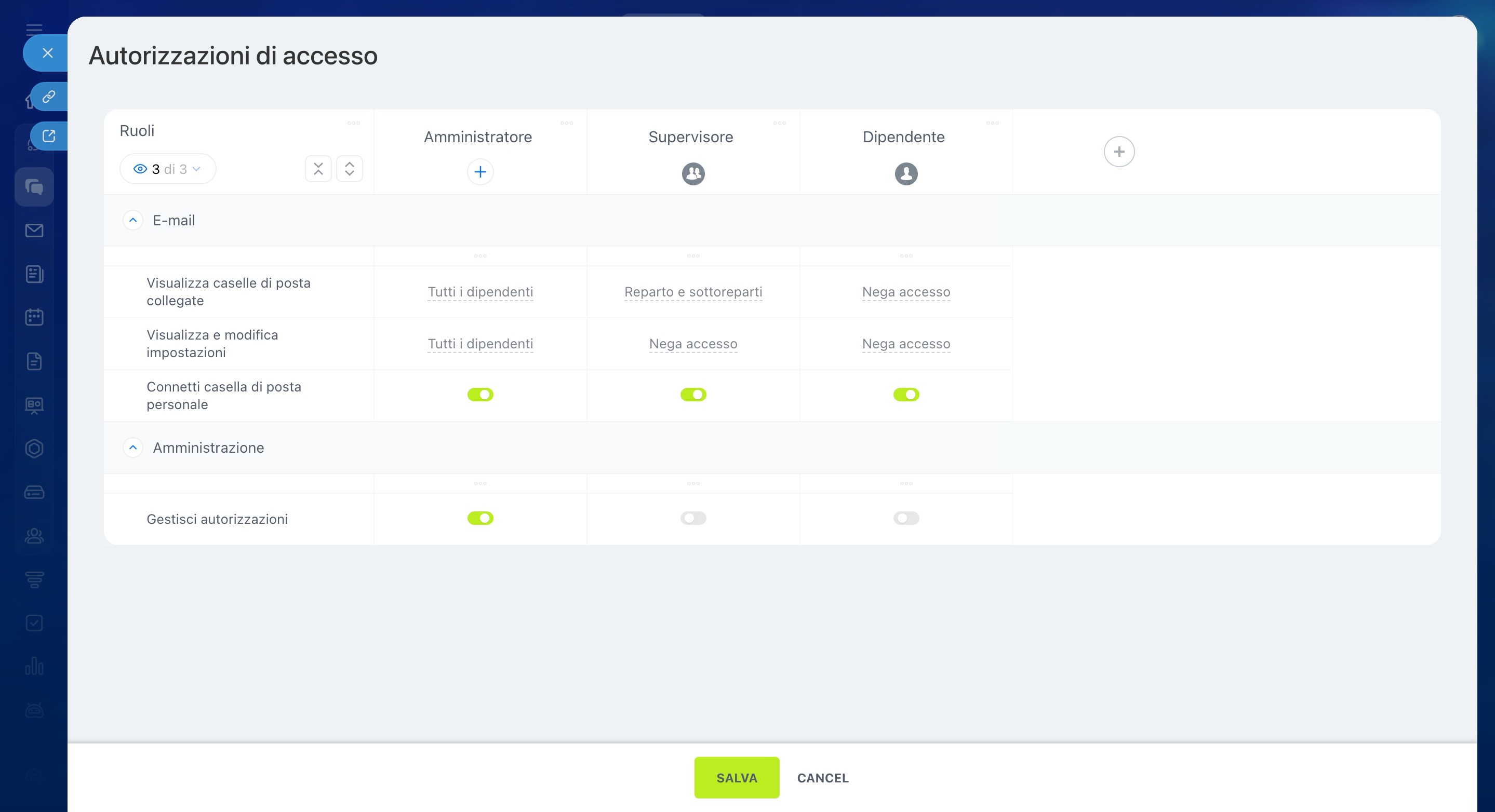 - il supervisore può vedere le caselle del proprio team, ma non modificarne le impostazioni,