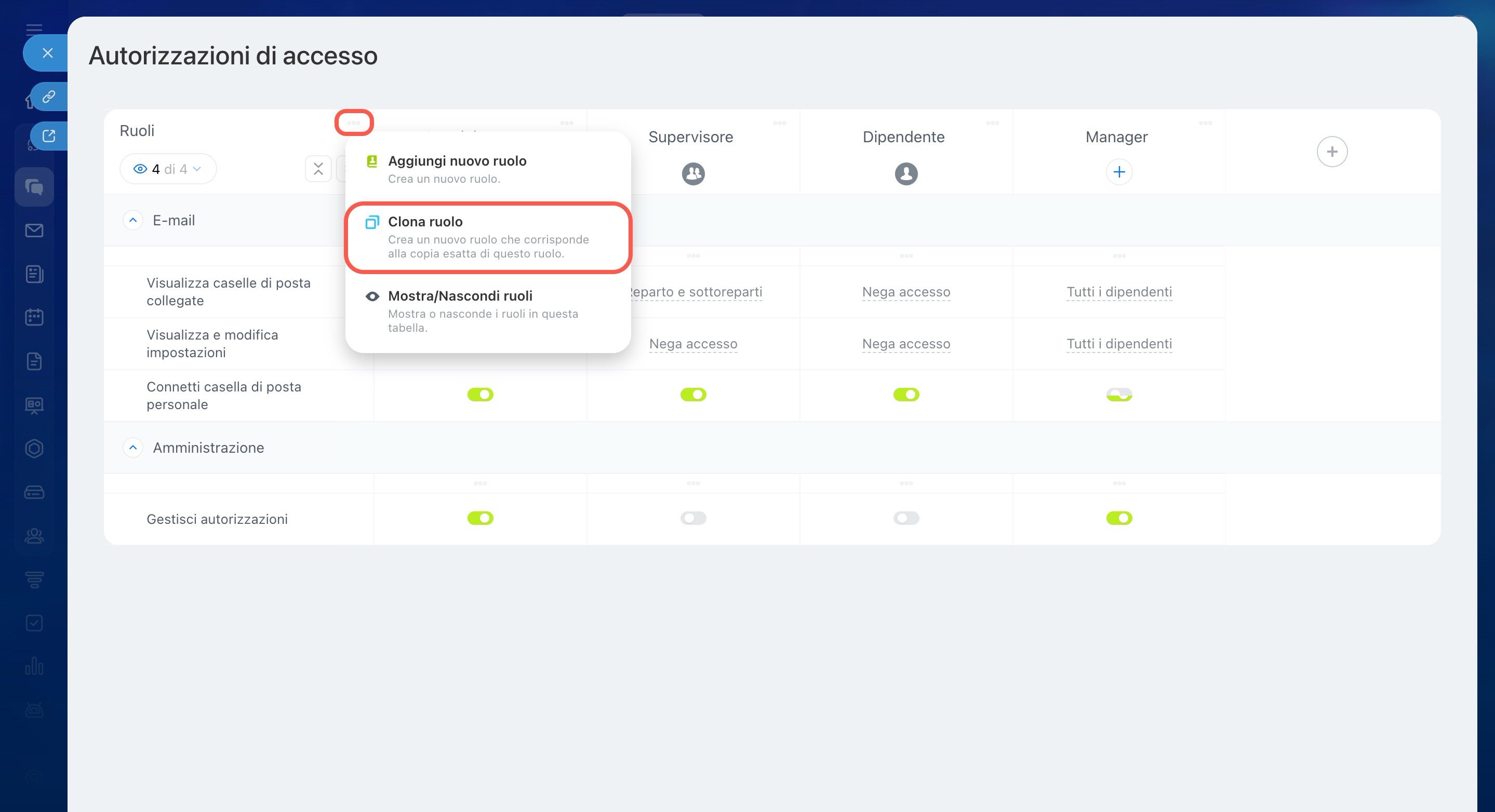 Copiare un ruolo. Utile per creare un nuovo ruolo con piccole modifiche. Fai clic su Clona ruolo e seleziona il ruolo da copiare. Le impostazioni delle autorizzazioni verranno copiate nel nuovo ruolo.