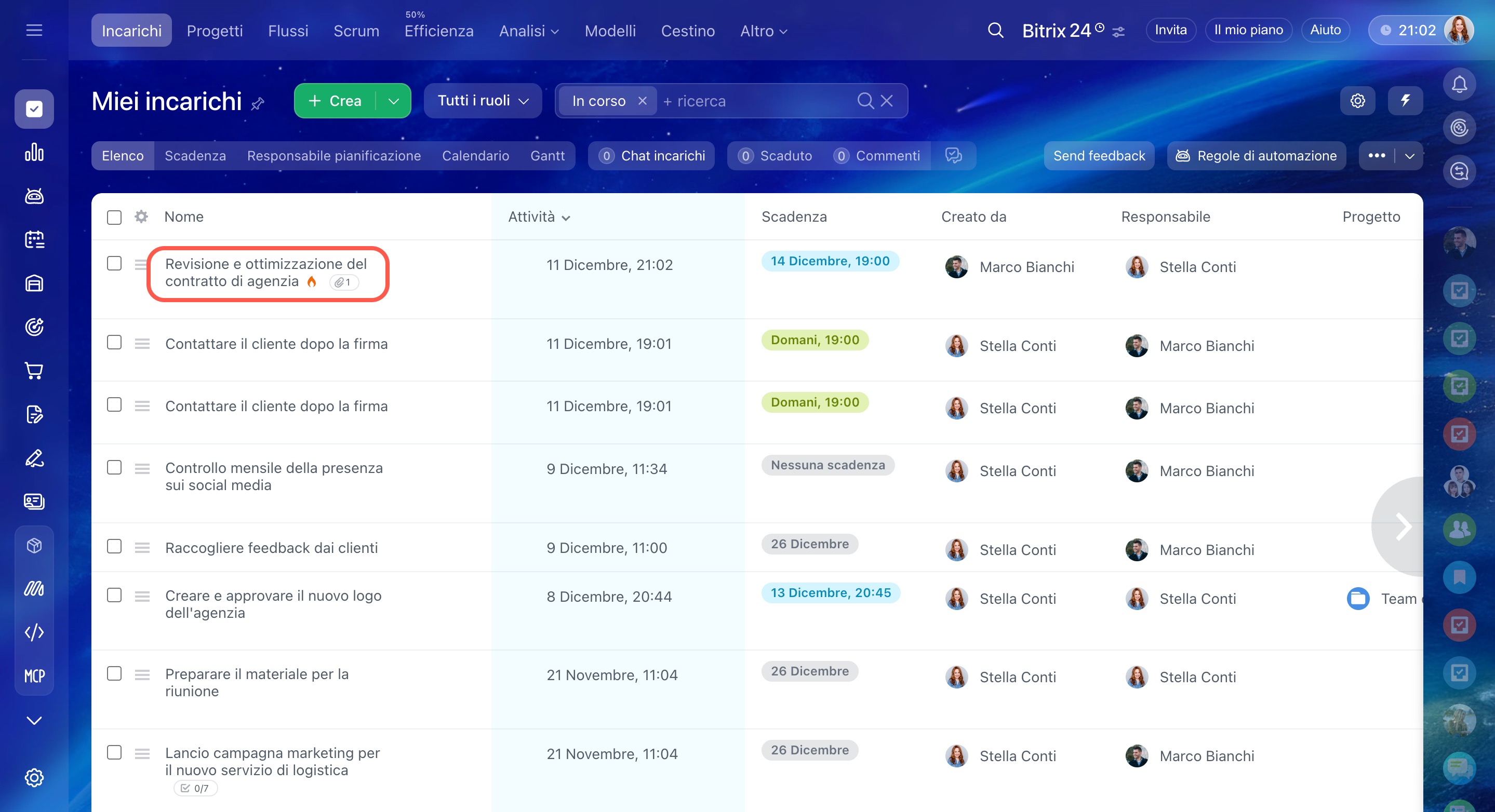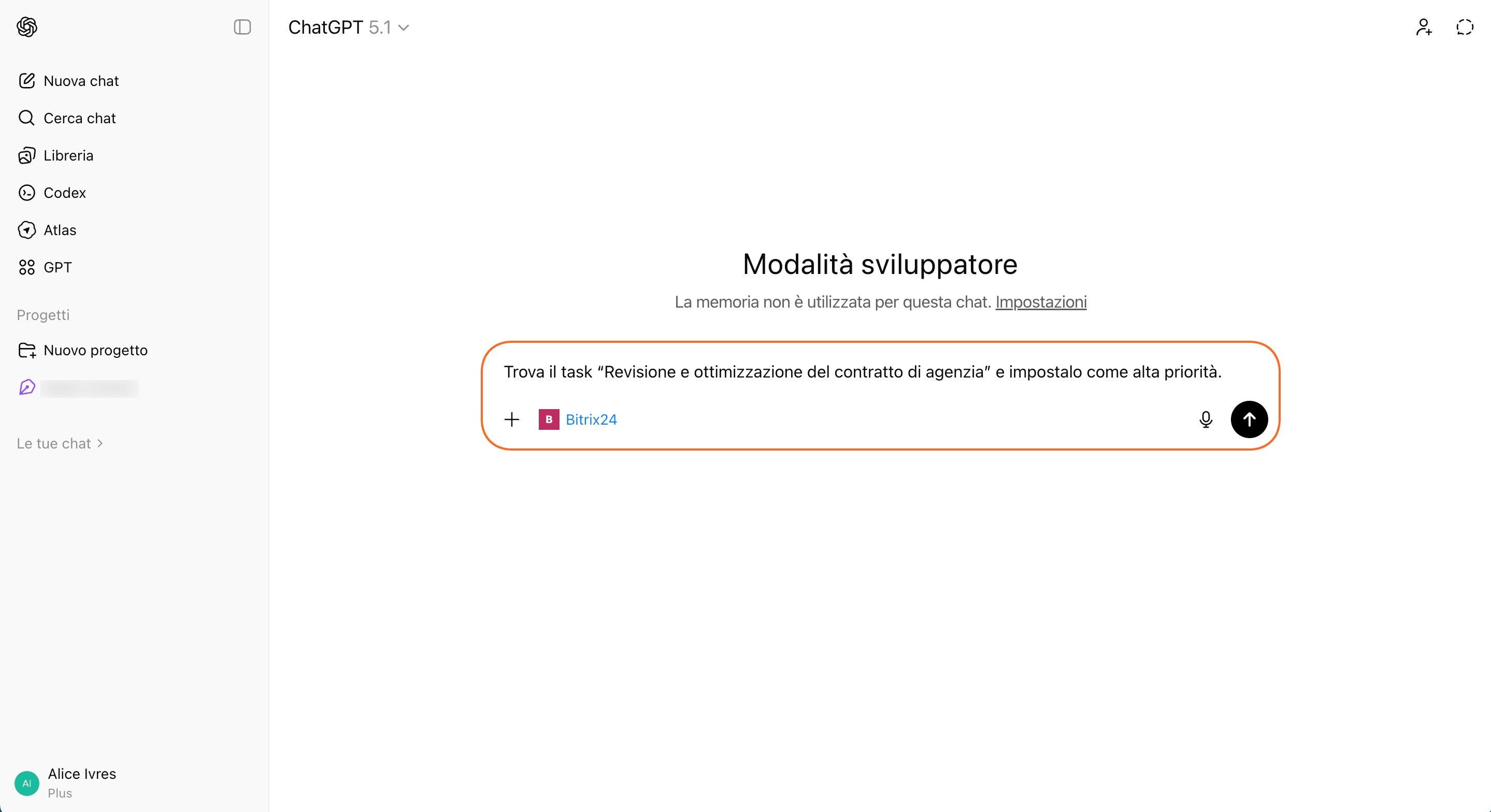 Ad esempio, puoi chiedere a ChatGPT di assegnare un incarico, aggiungere un elenco di controllo o cambiare il responsabile di un incarico. L’agente IA agisce su Bitrix24 solo su tuo comando e nel rispetto dei permessi di accesso, garantendo che tutto rimanga sotto il tuo controllo.