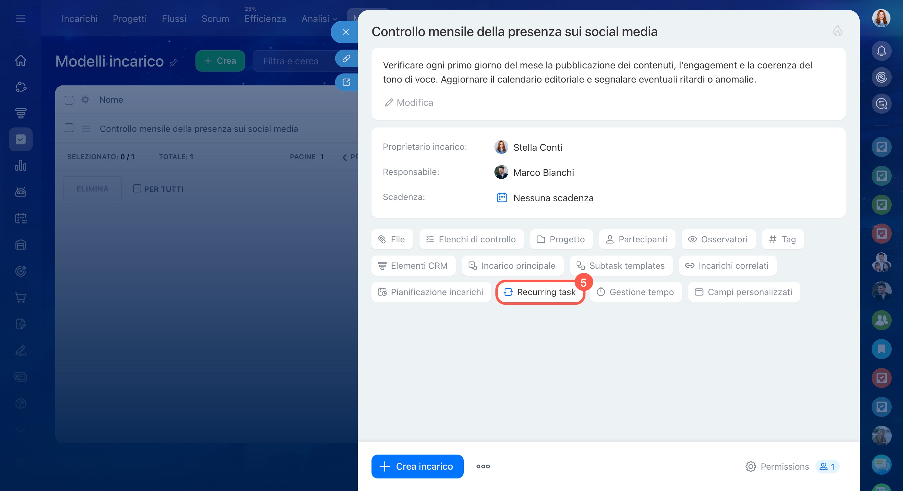 - Attiva l'opzione Incarico ricorrente e configura la pianificazione.