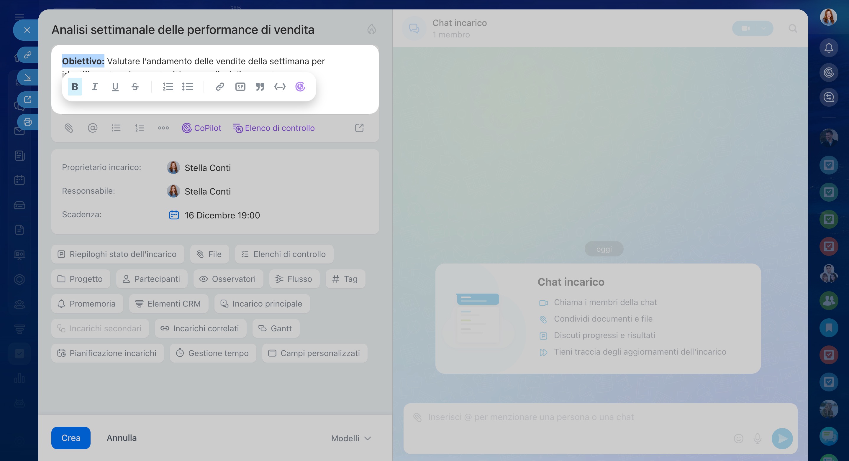L’IA crea automaticamente un incarico quando nel messaggio vocale viene riconosciuta una richiesta d’azione, ad esempio: «Prepara una relazione sulle trattative chiuse della settimana». Se non rileva un incarico, l’IA si limita a trascrivere il messaggio audio.