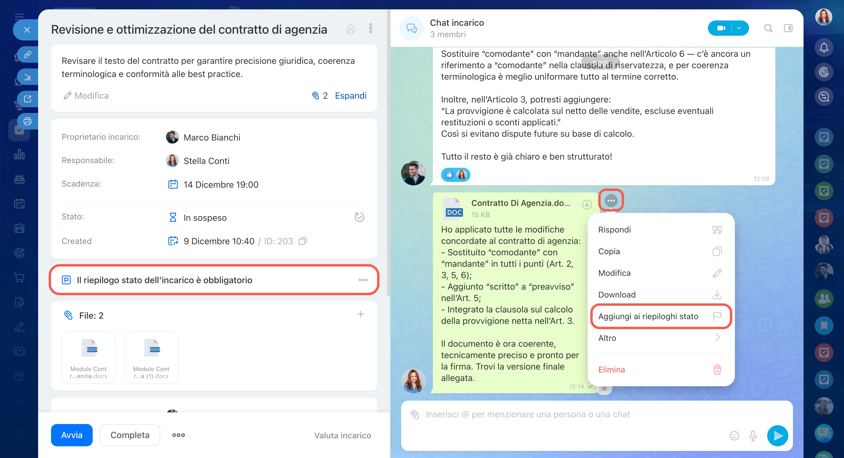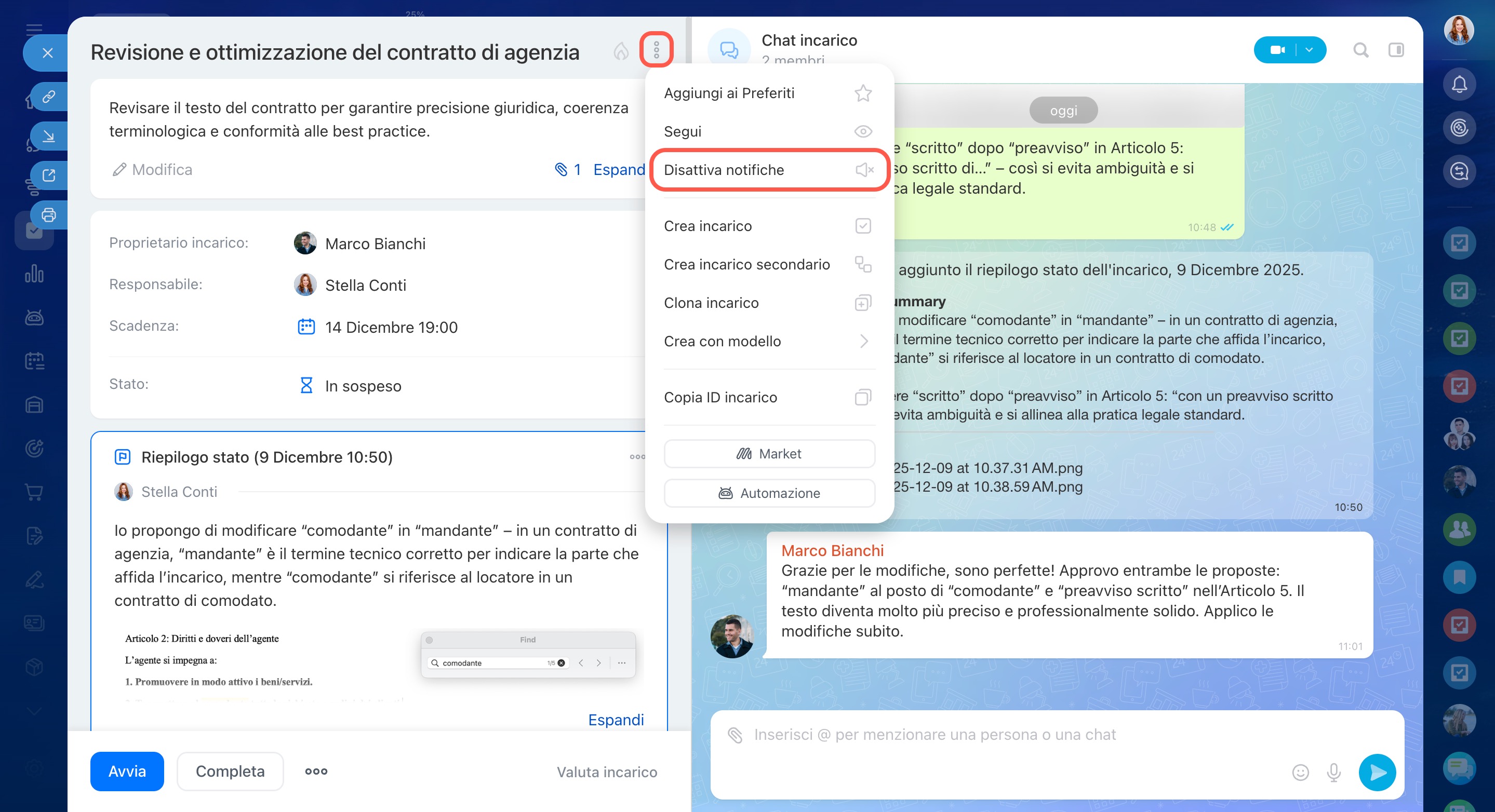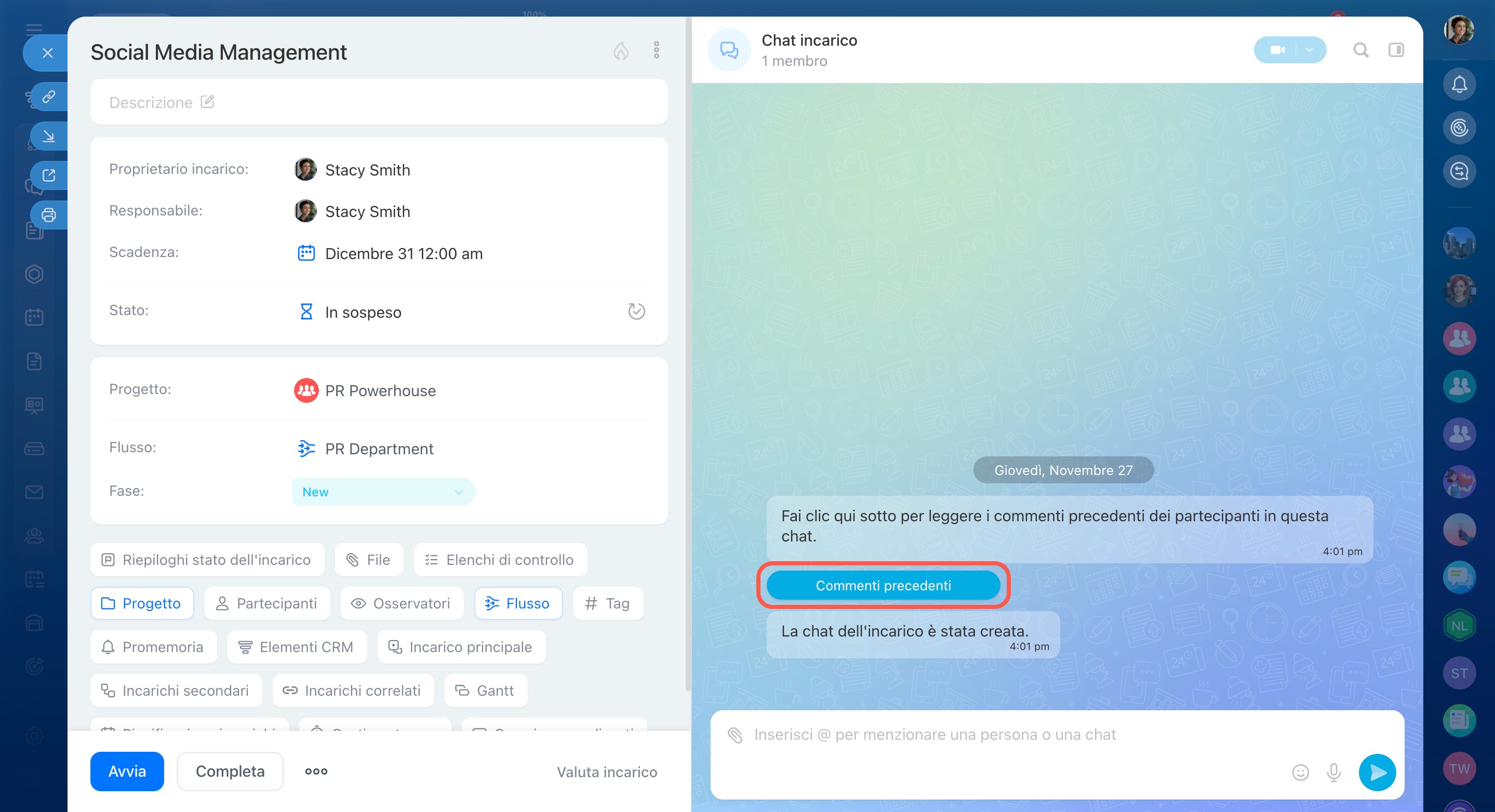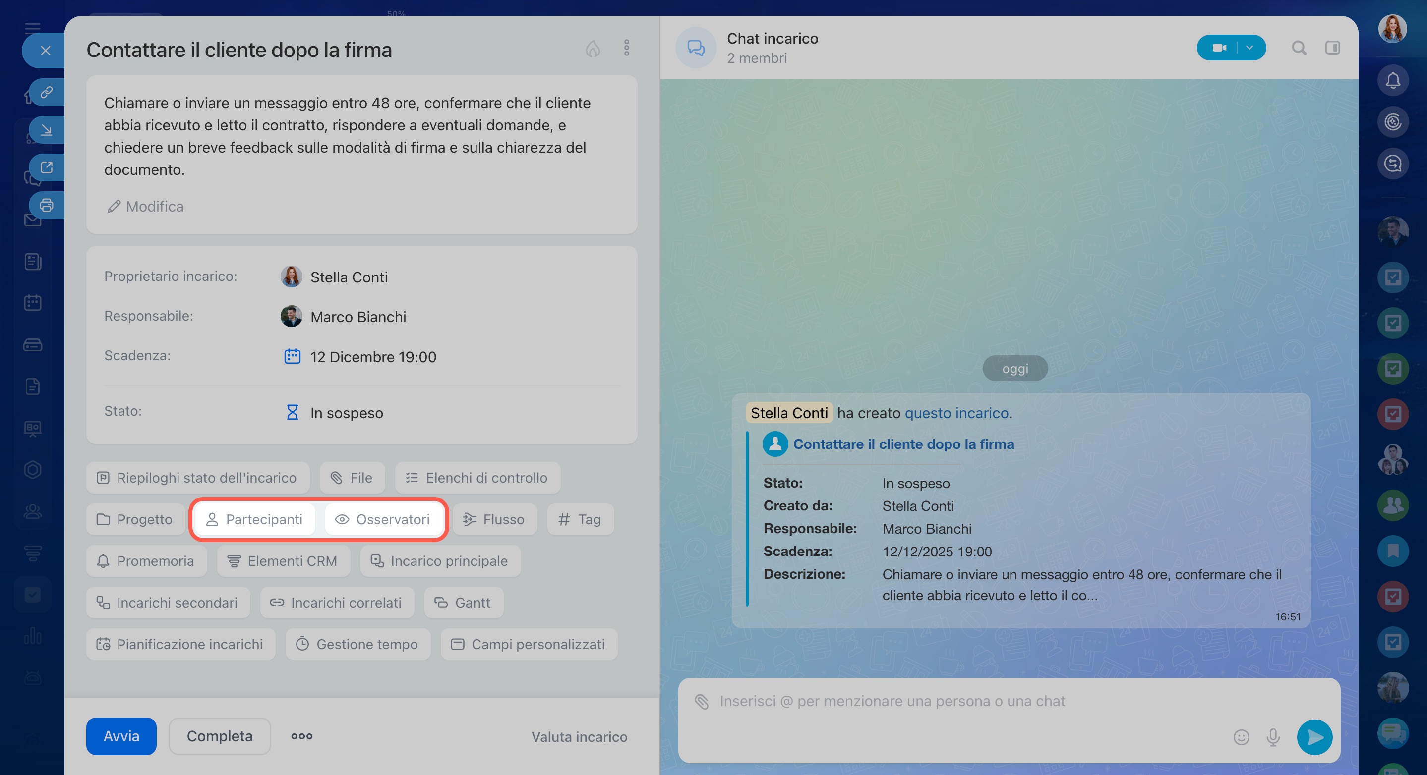 Menzionare un dipendente nella chat non lo aggiunge automaticamente come partecipante all’incarico. Per includerlo, aggiungilo manualmente scegliendo il ruolo appropriato nella parte sinistra della scheda dell’incarico.