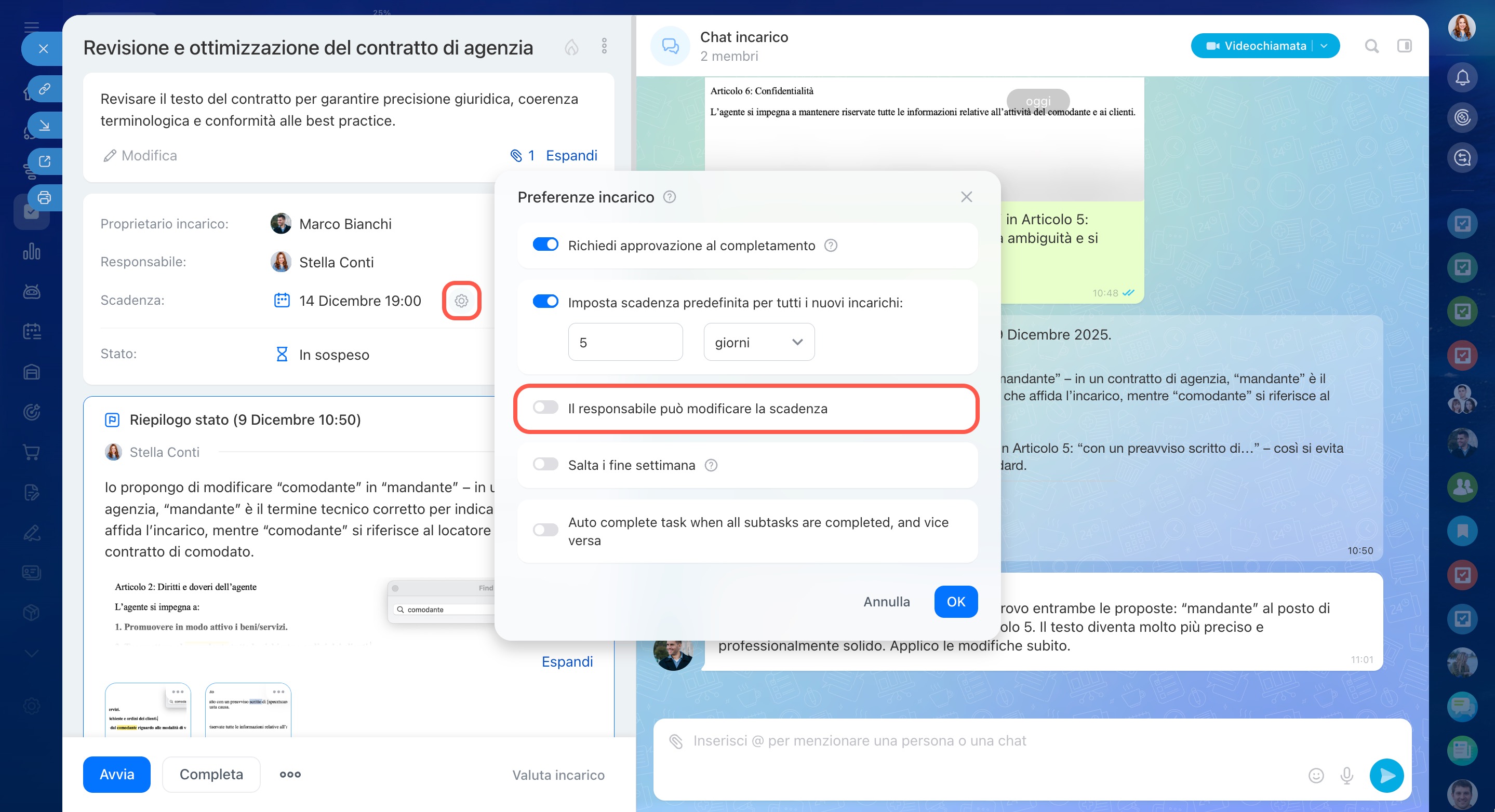 Nella scheda dell’incarico, fai clic su Impostazioni (⚙️) accanto al campo Scadenza e disattiva l'opzione Il responsabile può modificare la scadenza.
