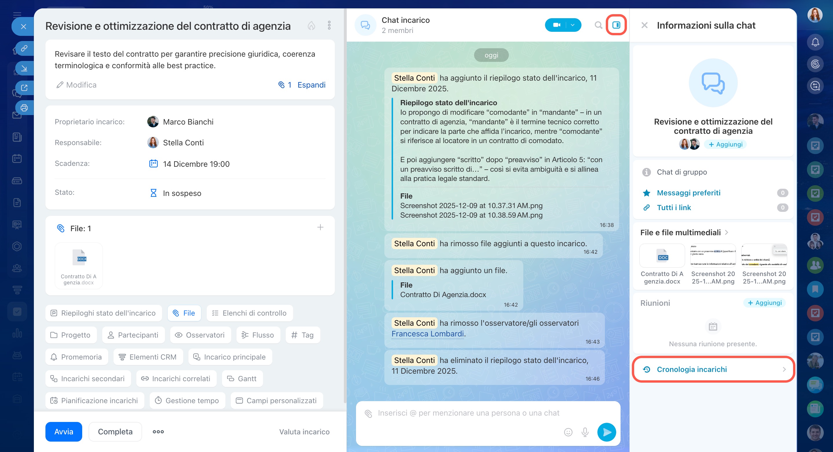 La cronologia delle modifiche è disponibile in due punti: nella chat dell’incarico e nella sezione Cronologia incarico nella barra laterale. Qui vengono registrate le azioni principali, come il rinvio della scadenza, il completamento dei punti dell’elenco di controllo o il cambio di stato.