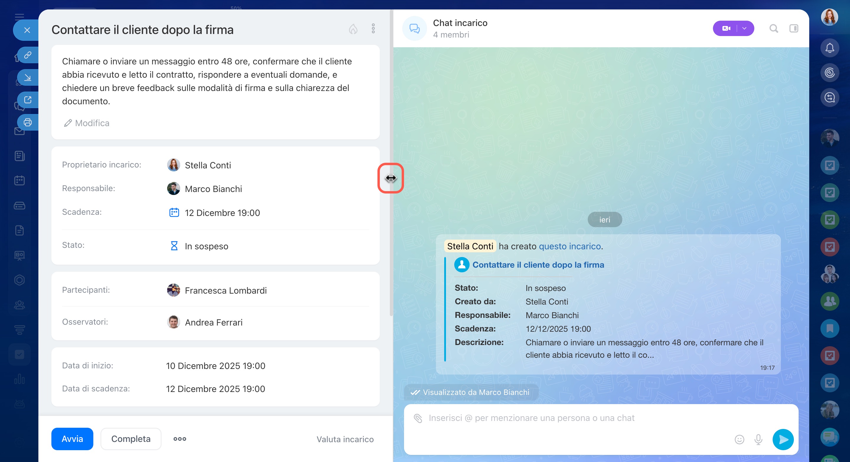Puoi però modificarne la larghezza: trascina il divisore tra i pannelli. La dimensione scelta verrà salvata automaticamente per tutti gli incarichi.