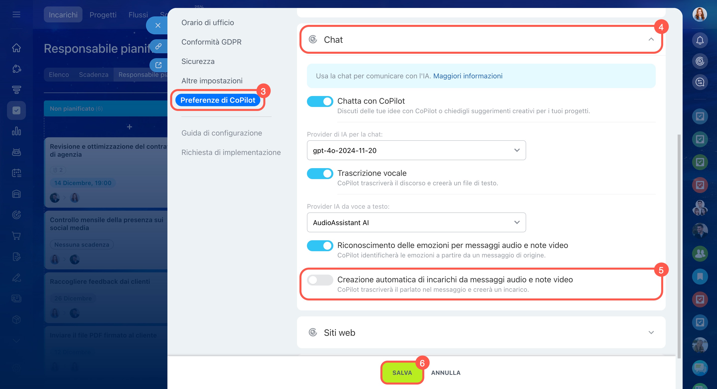 - Come posso disattivare la creazione automatica di incarichi dai messaggi vocali?