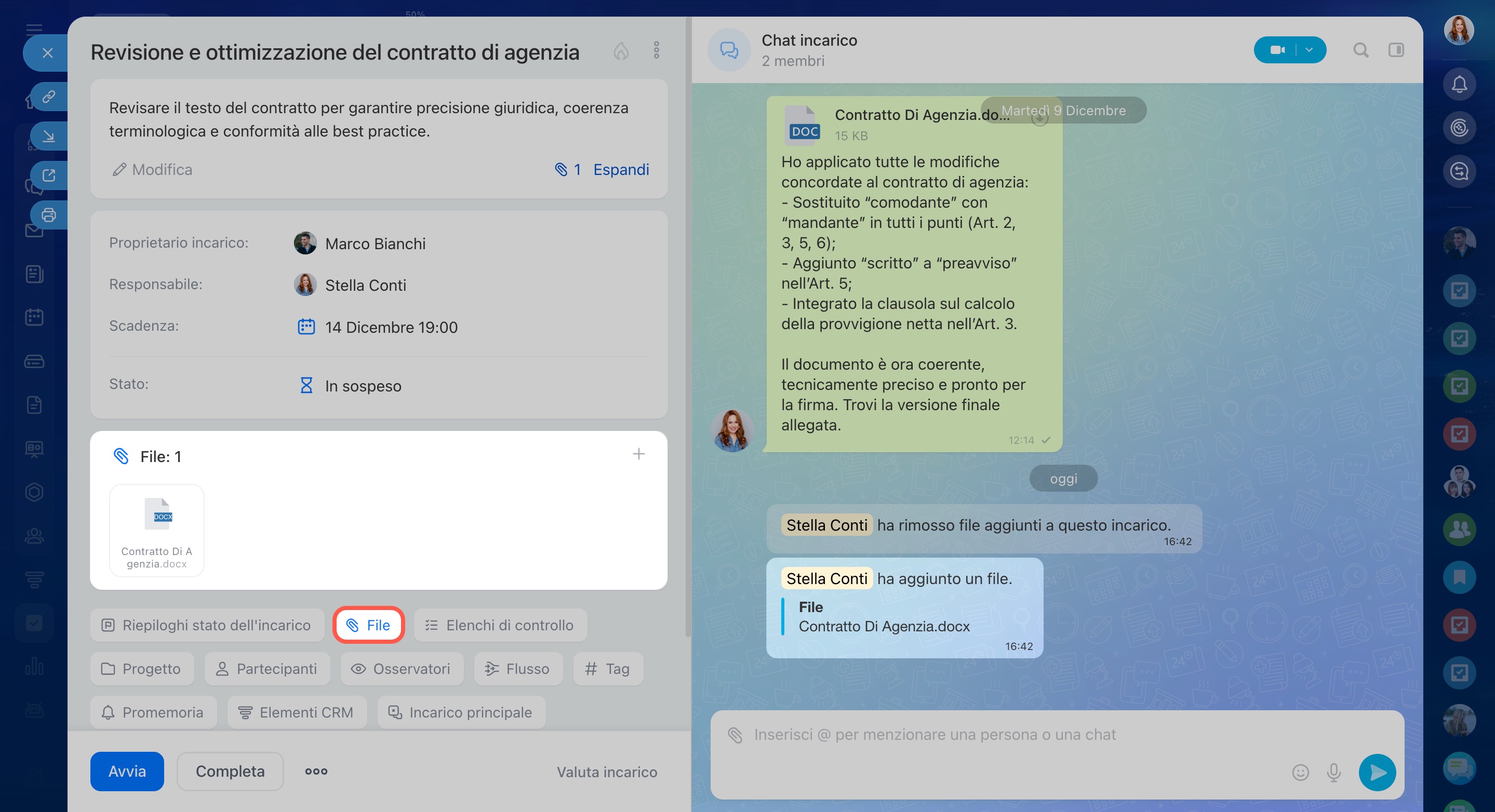 I file inviati nella chat dell’incarico vengono salvati solo nella conversazione. Nel blocco File vengono mostrati esclusivamente i documenti caricati direttamente nella scheda dell’incarico.